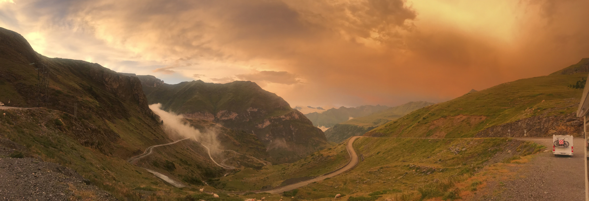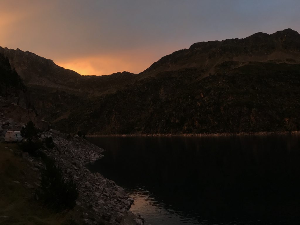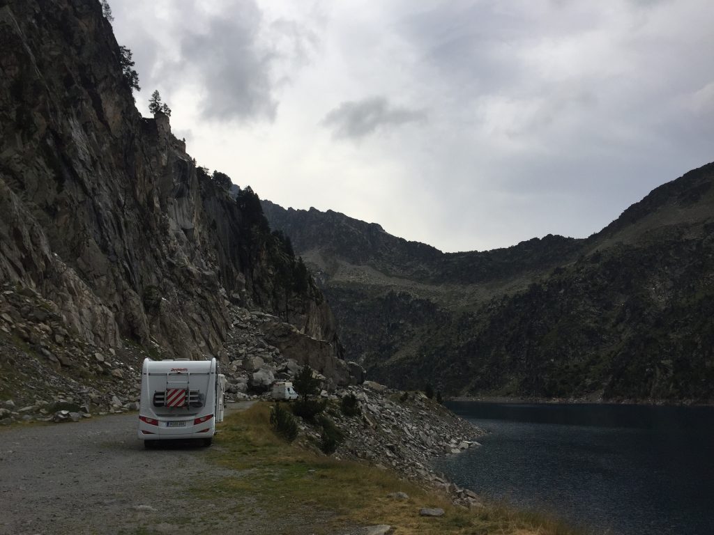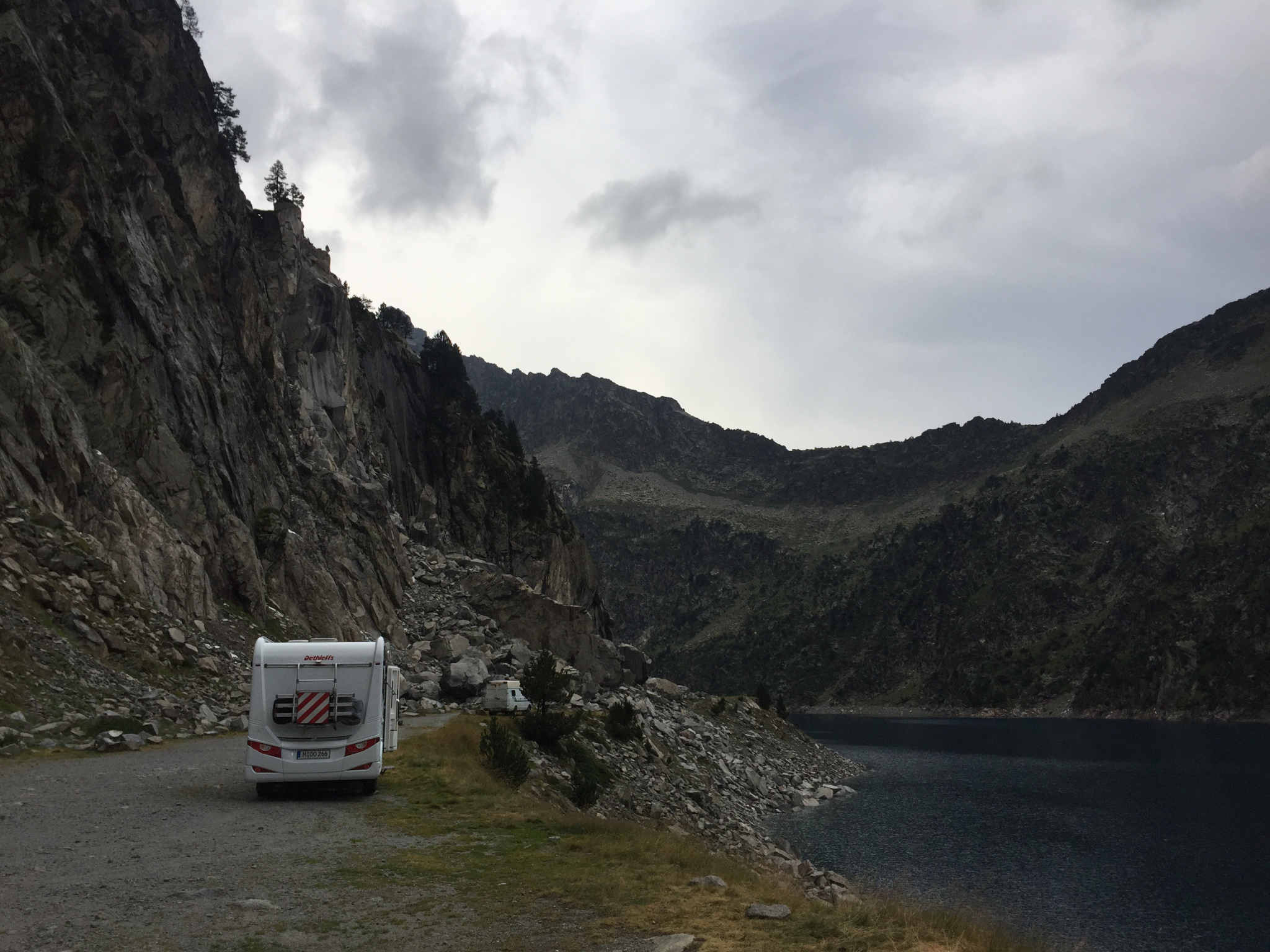 Nach unserer Radel-Tour am Pic Piau gings ein Tal weiter zu einem 2200m hoch gelegenen Stausee. Die Anfahrt war megaspannend, da es ein Fetzen-Gewitter mit Hagel gab und SEHR viele Autos (Wanderer die vor dem Gewitter flüchten) entgegen(!) kamen. Klar war die Strasse super schmal! Schließlich waren wir sehr froh, nach 10 km und 1,5h am Lac „Cap de Long“ angekommen zu sein.