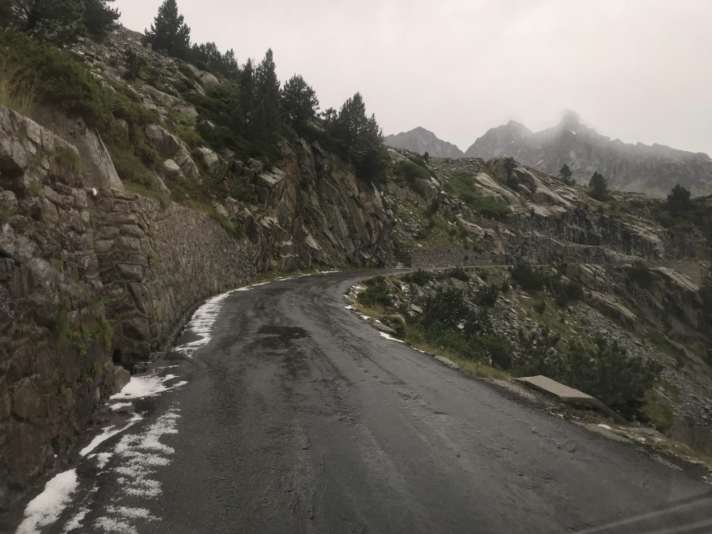 Die enge Serpentinenstraße zum Stausee, mit Hagel garniert..