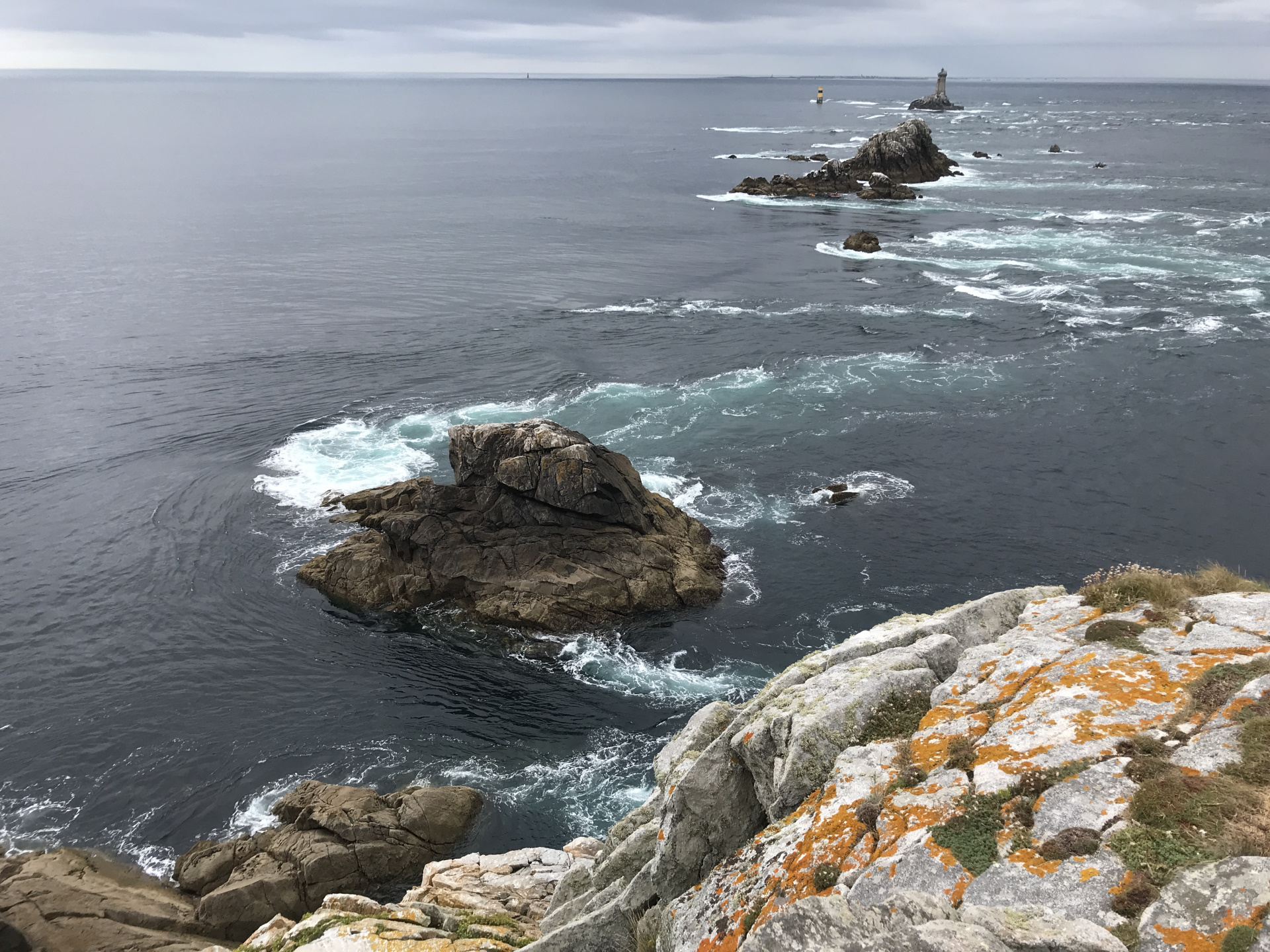 Zu guter Letzt gings noch an den nördlichsten Punkt der Bretagne (nach einer kleinen Kletter-Einlage) und solche Strömungen haben wir noch NIE gesehen!! Das Meer schießt wie ein Fluß zwischen den Felsen durch und erzeugt stehende Wellen!! Dazwischen gab es ein paar Kajakfahre die auf den Wellen gesurft sind: