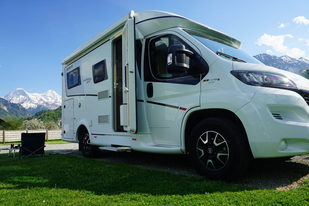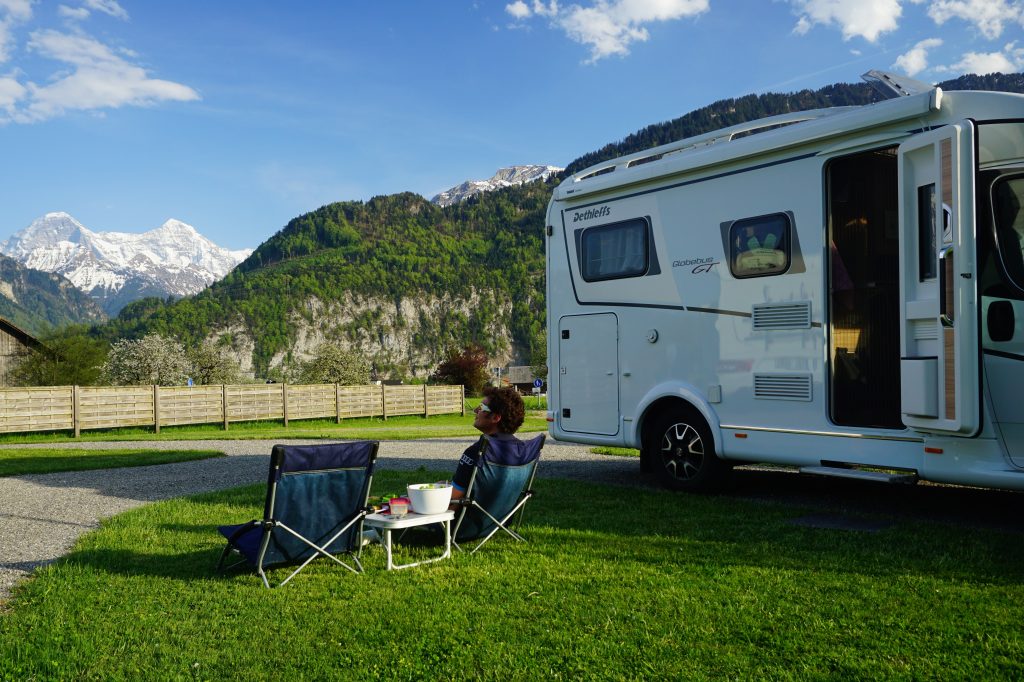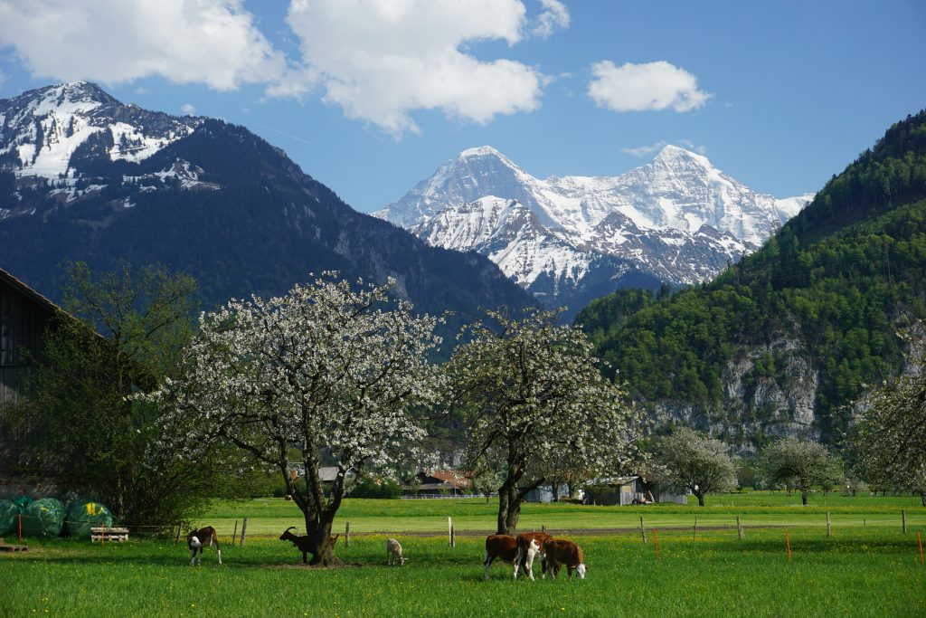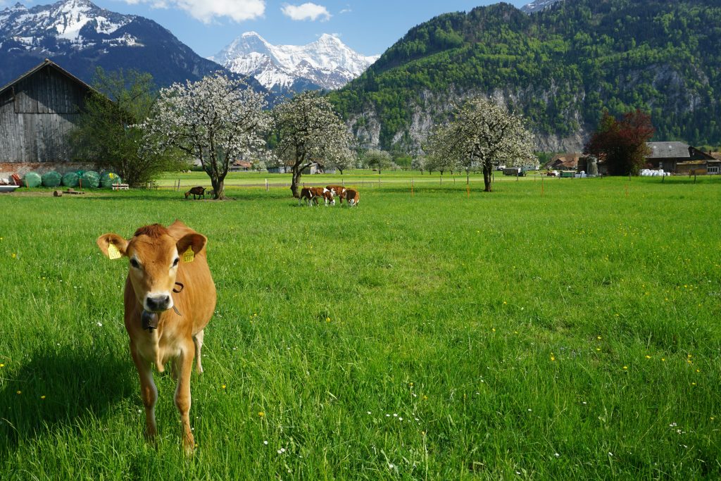 🙂 Schweiz as Schweiz can: Eiger, Mönch und (verdeckte) Jungfrau, lustige Kühe als Foto-Modell („Switzerland’s next cow-model“), Alphörner zum Sonnen-Untergang und einen unglaublichen Flugbetrieb mit Wahnsinns-Panorama. Eigentlich wollten wir heute schon in Neuchatel (Schweizer Jura) sein, sind aber in Interlaken hängen geblieben. Weil die Gleitschirm-Flieger mitten in der „Stadt“ am Grand-Hotel mitten in den Japanern gelandet sind. Und wir das morgen auch versuchen wollen, obwohl leider das unglaublich schöne Wetter umschlagen soll.. Mal sehen. Der heutige Campingplatz (und seine Haustiere) sind schon mal der Hammer. Wann kann man seinen Spargel schon in so einem Panorama essen! 🙂