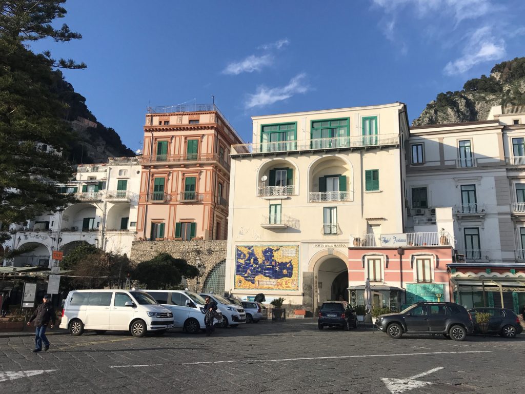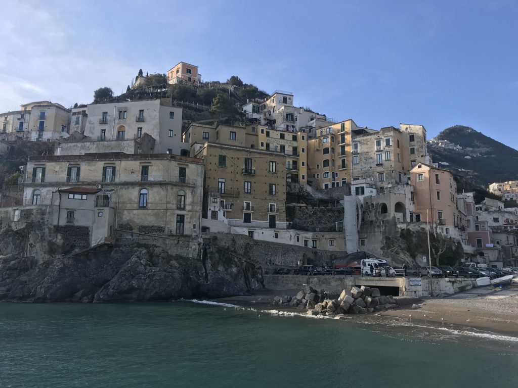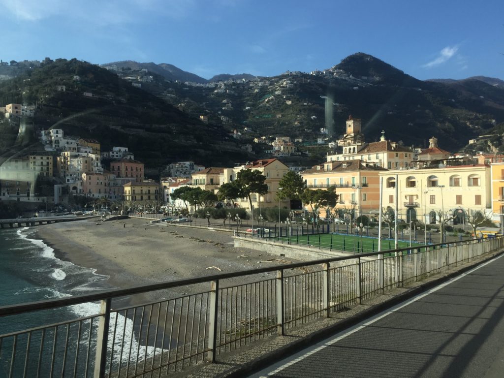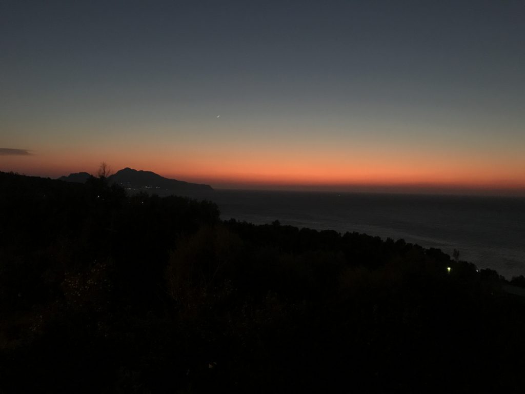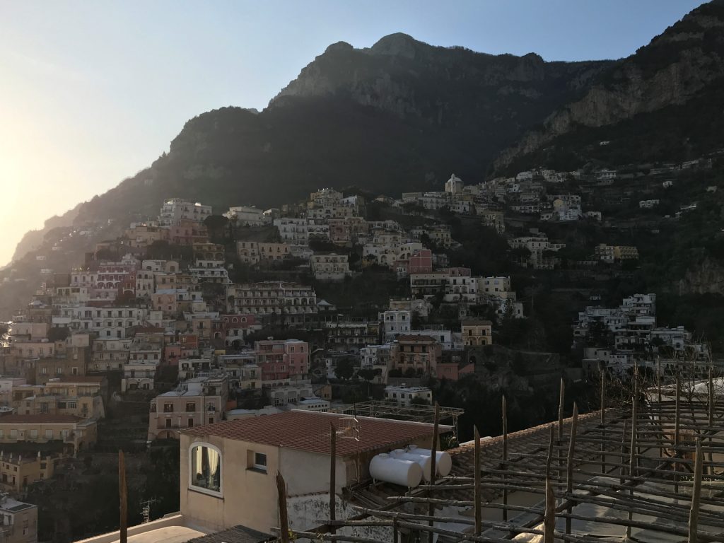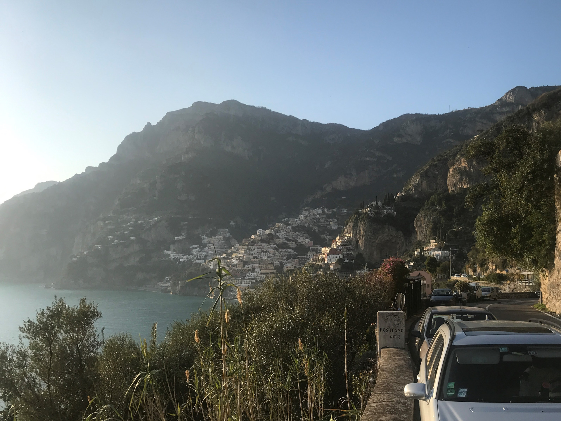 So geht’s über etliche Kilometer und viele abenteuerliche Dörfer (Cetera, Erchie, ..) nach Amalfi (hier gibt’s einen Beruhigungskaffe) und weiter bis nach Positano, dem malerischen Fischerdörfchen. Immer wieder halten wir die Luft an und der Moppel macht sich dünn. UNGLAUBLICH wo wir überall durchpassen! Leider fährt doch ein Bus (der Linienbus SIA ist ein ausgewachsener Bus!!!) und zwar mindestens jede halbe Stunde. Das wird immer wieder spannend. Wir sind sehr froh, die Amalfietta hinter Positano zu beenden und tuckern noch gemütlich zu einem schönen Stellplatz mit Blick auf Capri. Hier versinkt die rote Sonne dann sooo schön im Meer :-).
