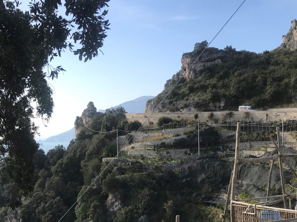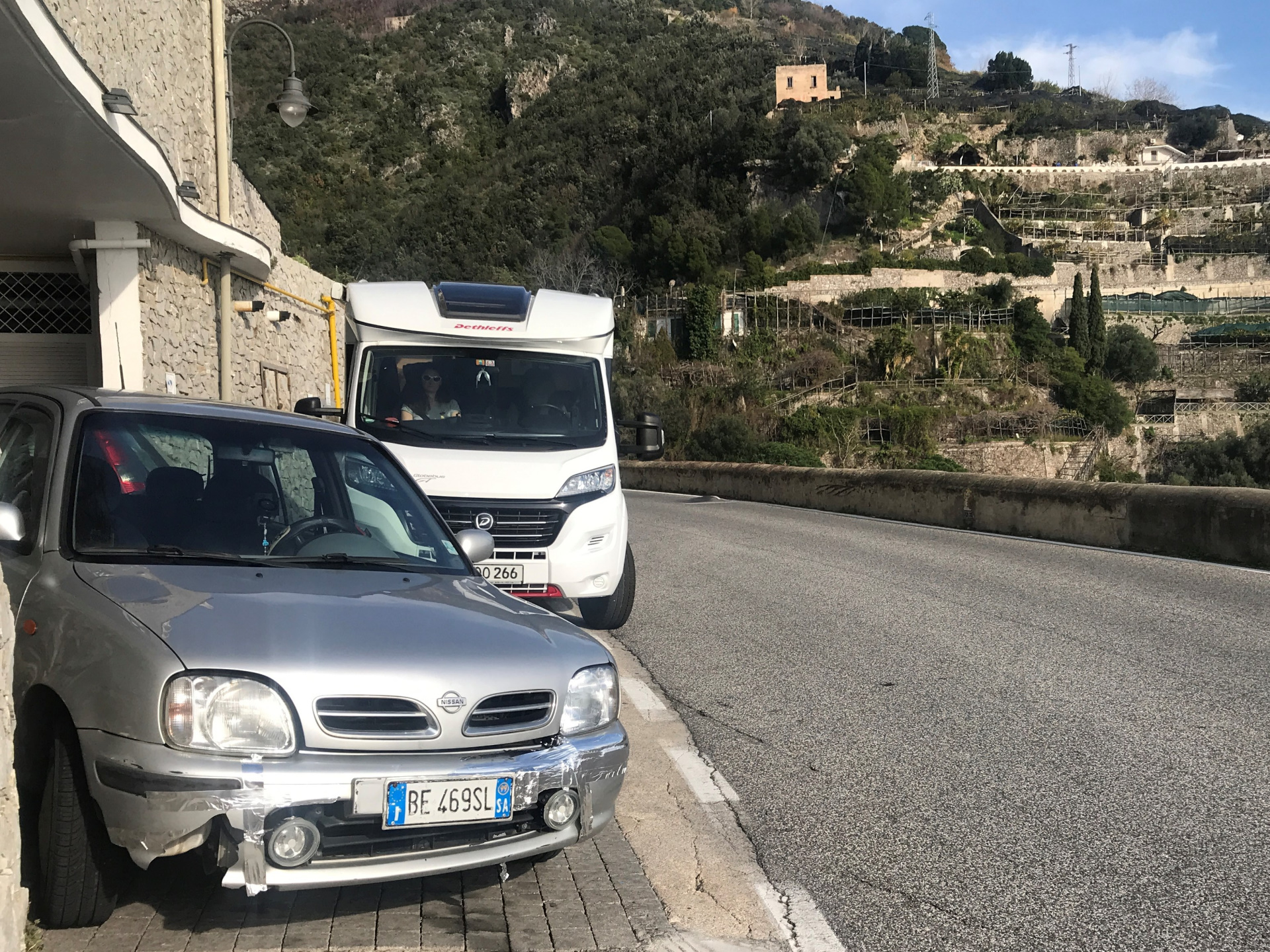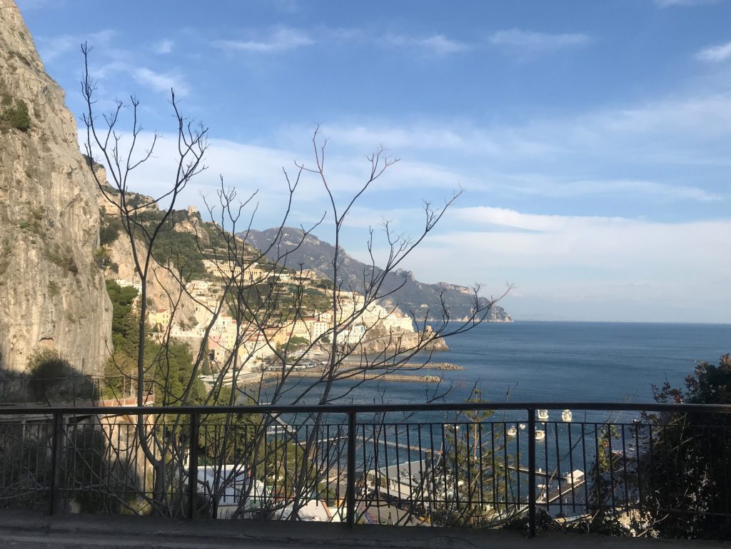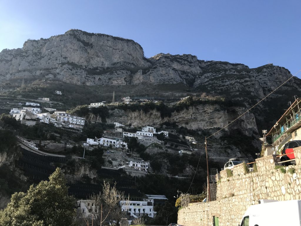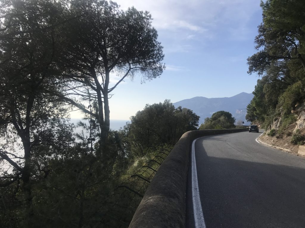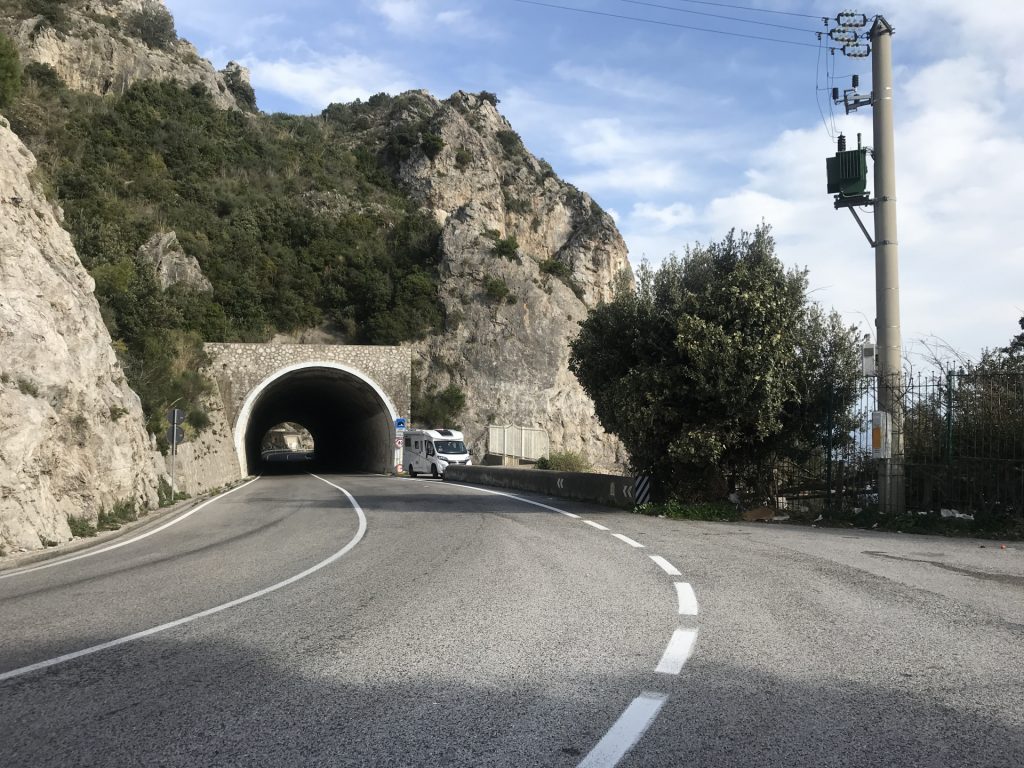 Nicht so auf der Amalfietta! Ich kenne nach 44tkm den Moppel doch recht gut, aber Sandra sitzt auf der RECHTEN Seite, also die Seite, die die Felsen hat. Nach 2 km rutscht Sandra unruhig auf dem Sitz. Ok ist eng und VIEL Verkehr. Zum Glück keine LKW oder Wohnmobile, da die Straße für LKW und Wohnmobile nur zwischen 24:00 und 6:30 geöffnet ist (wir sind ja kein Wohnmobil, sondern nur ein sportlicher Weekender :-)). Trotzdem ENG! Und die Rechtskurven sind wirklich scheußlich, wenn man Glück hat, gibt’s einen Spiegel, wenn nicht, nur ein Stoßgebet. Nach weiteren 5 km „Du Schatz, ich bin froh, dass der rechte Außenspiegel noch dran ist“. Mir kommt die geniale Idee, dass Sandra doch filmen könnte und das gelungene Ergebnis sieht man am Ende des Blogs :-).