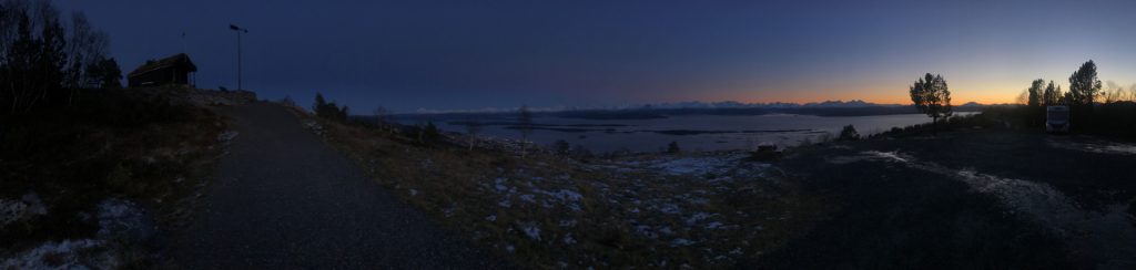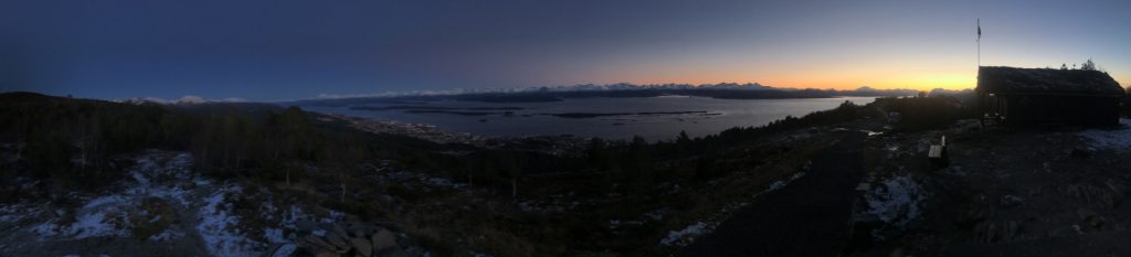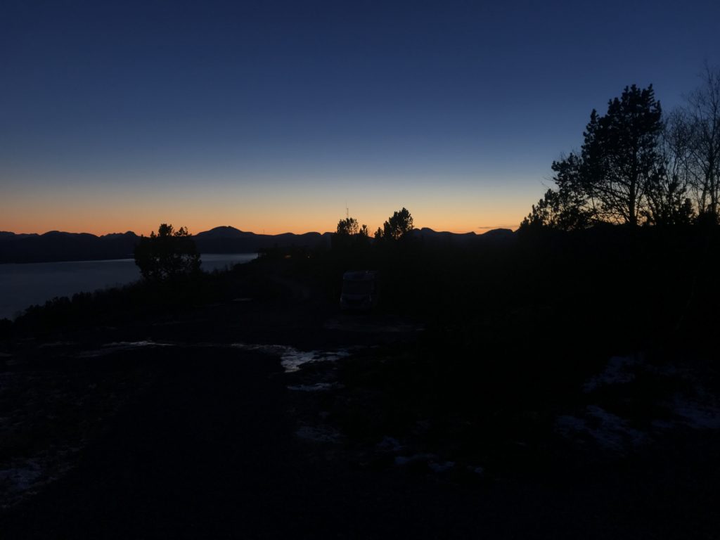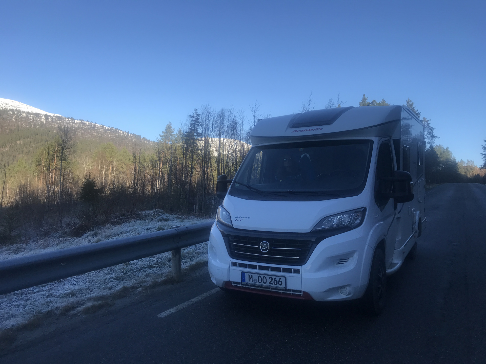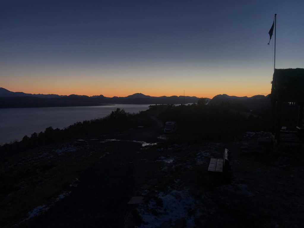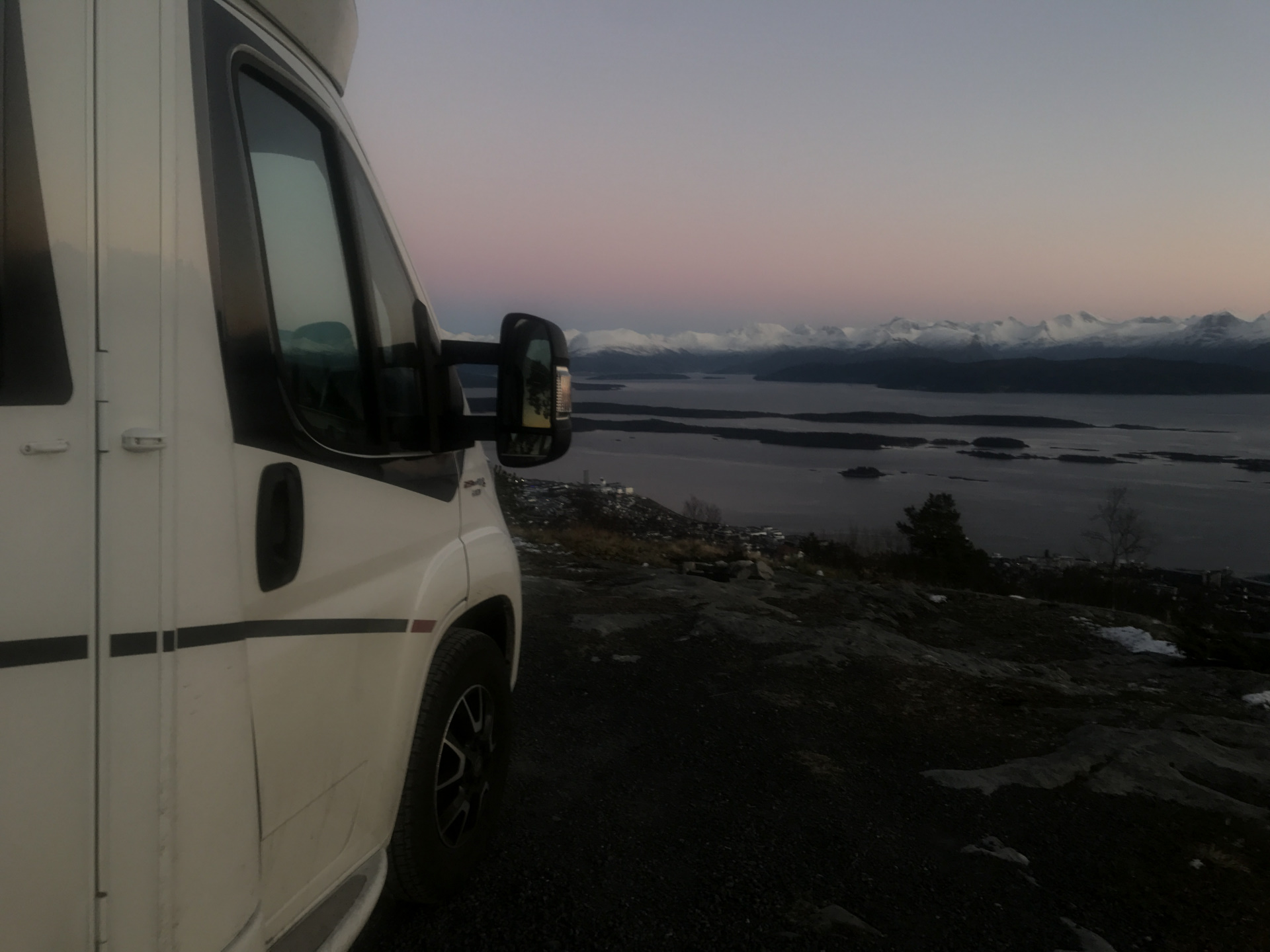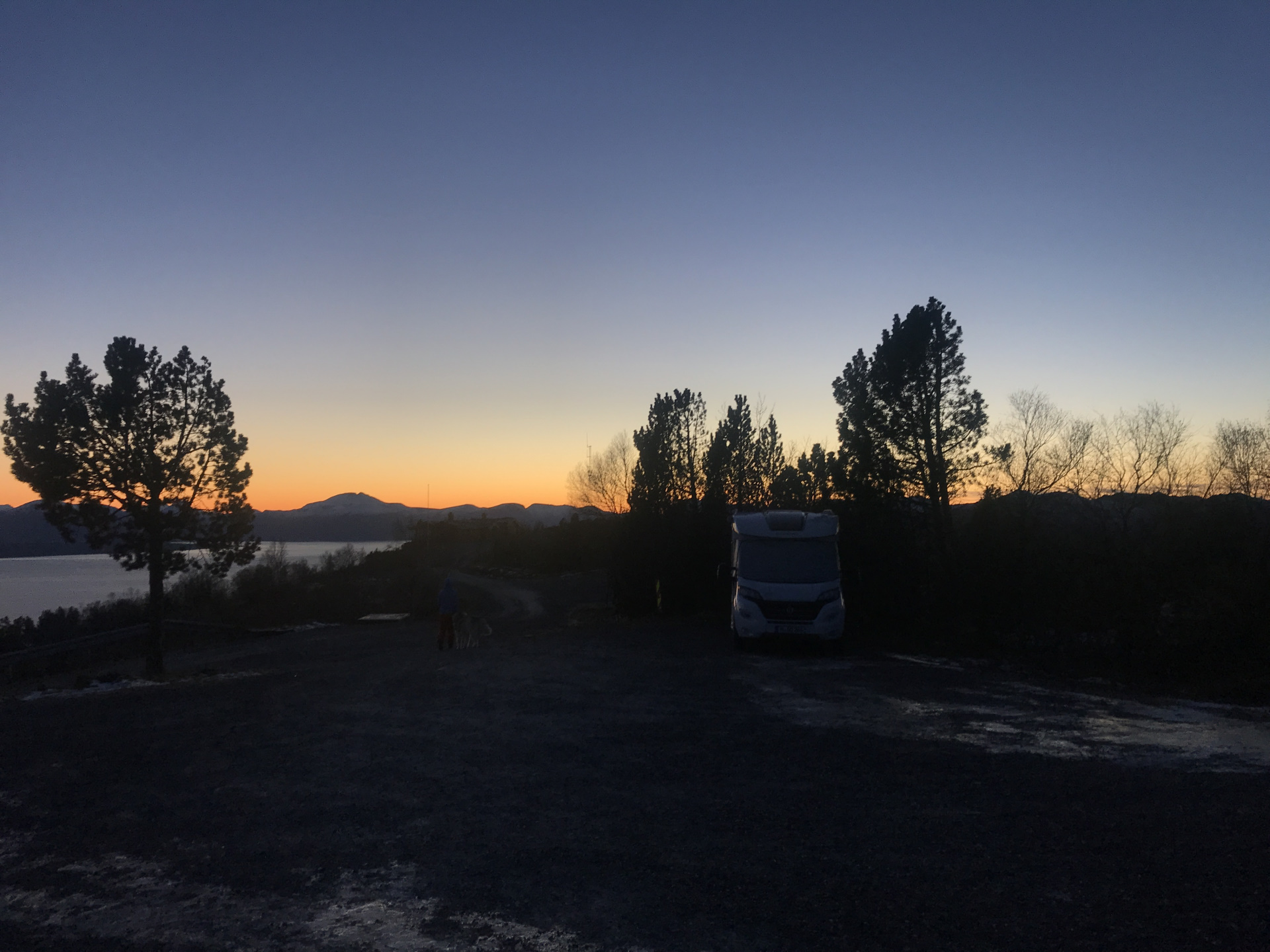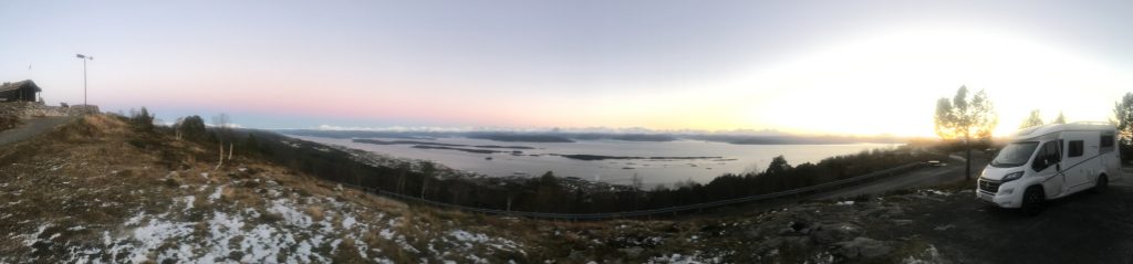 Übernachtet haben wir wieder auf einem zufällig aus unserer App Park4Night ausgewählten Platz auf der Strecke 400 Meter oberhalb der Hafenstadt Molde. Und dieser war der unbeschreiblichste Platz auf unserer Reise bisher: was für eine AUSSICHT! Wie im Märchen. Alex‘ Drohnenvideo sollten wir zu National Geographic einschicken… Unsere fahrbare Almhütte hat wieder alles an Aussicht gegeben und über Nacht auch noch standesmäßig Eiszapfen wachsen lassen (zum Glück nur außen; innen war es superflauschig warm).