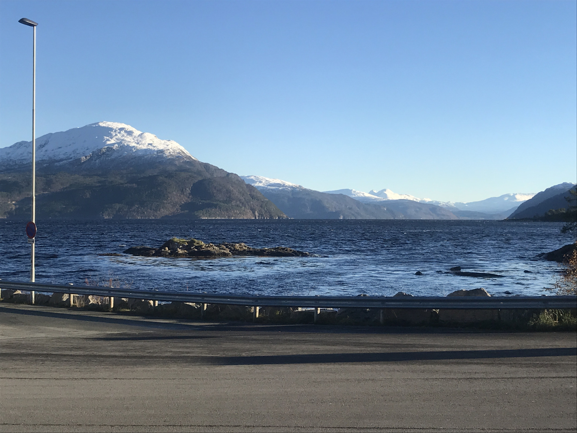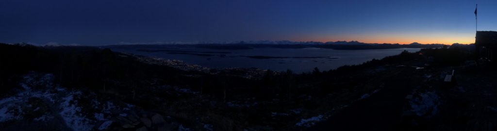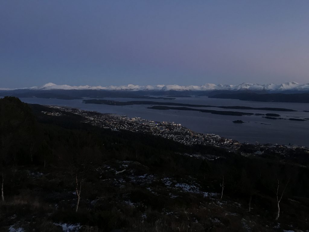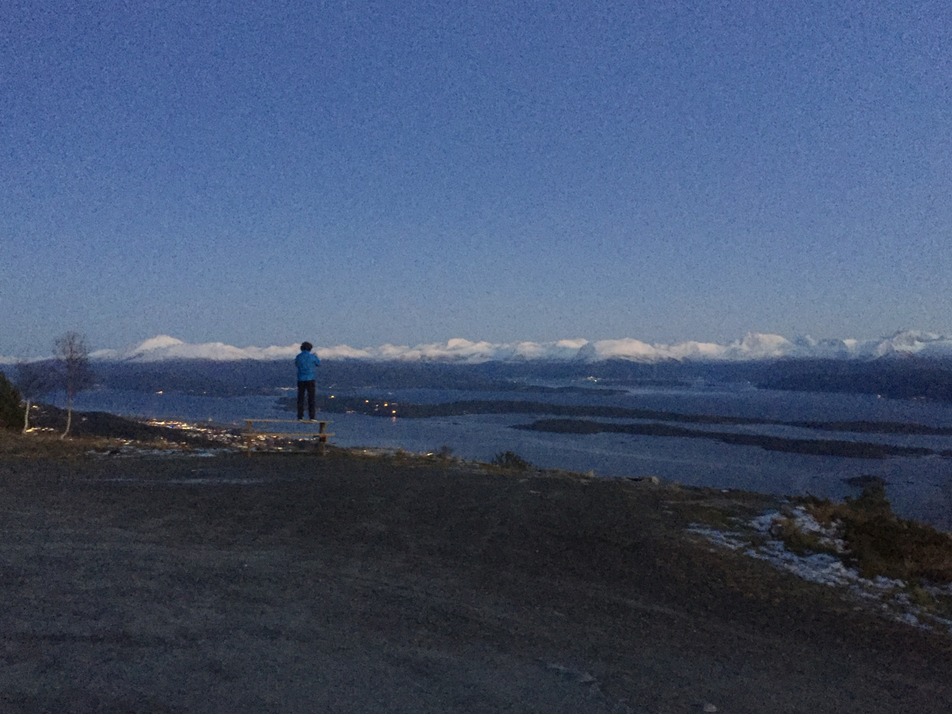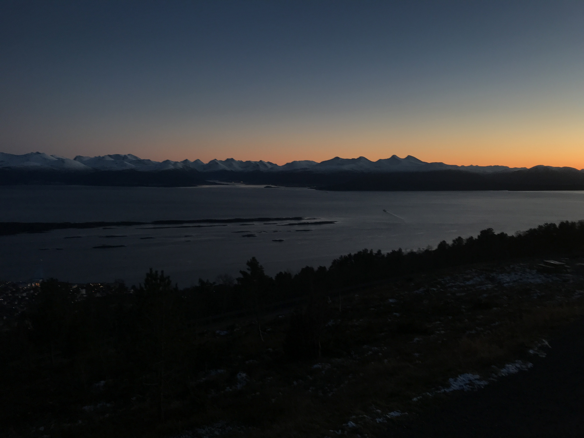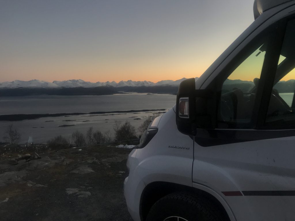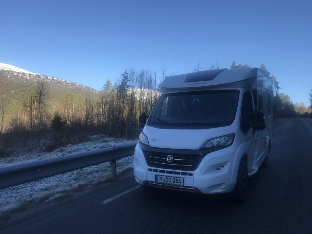 Übernachtet haben wir wieder auf einem zufällig aus unserer App Park4Night ausgewählten Platz auf der Strecke 400 Meter oberhalb der Hafenstadt Molde. Und dieser war der unbeschreiblichste Platz auf unserer Reise bisher: was für eine AUSSICHT! Wie im Märchen. Alex‘ Drohnenvideo sollten wir zu National Geographic einschicken… Unsere fahrbare Almhütte hat wieder alles an Aussicht gegeben und über Nacht auch noch standesmäßig Eiszapfen wachsen lassen (zum Glück nur außen; innen war es superflauschig warm).