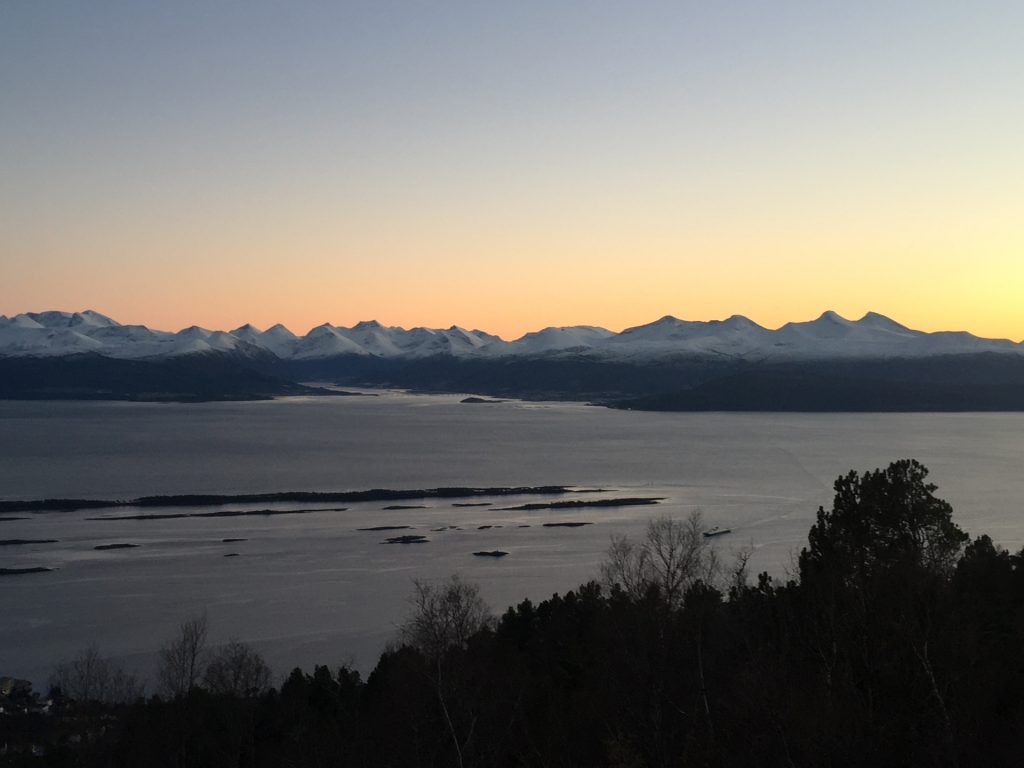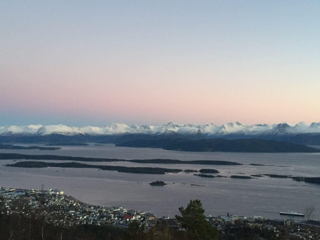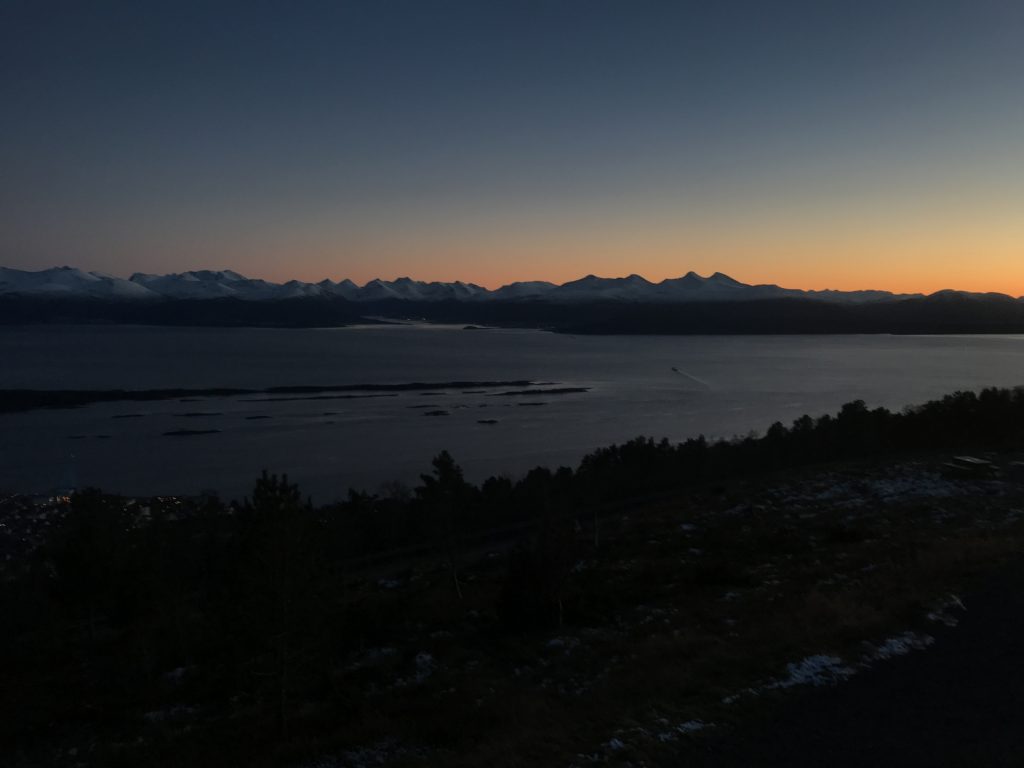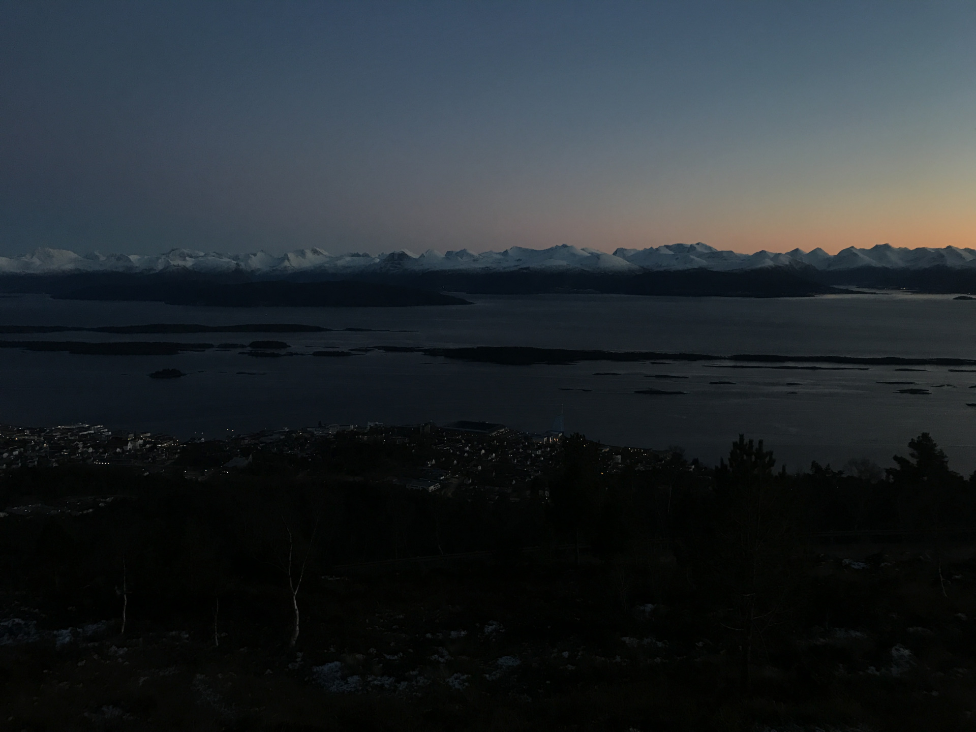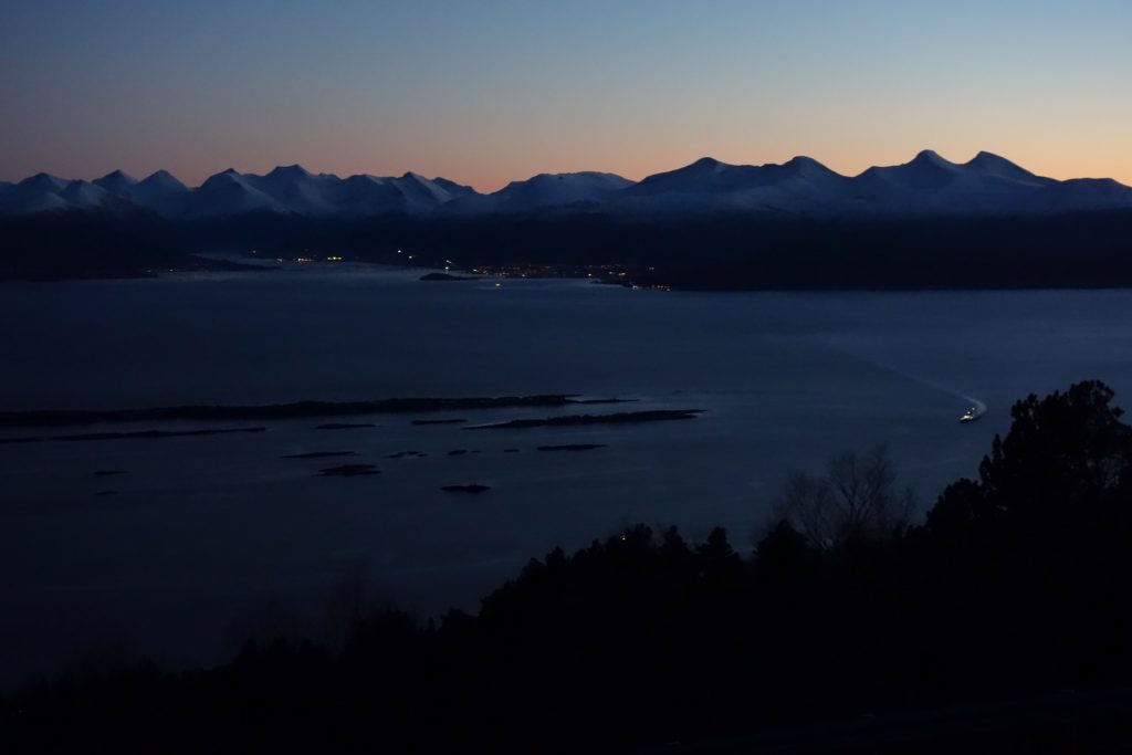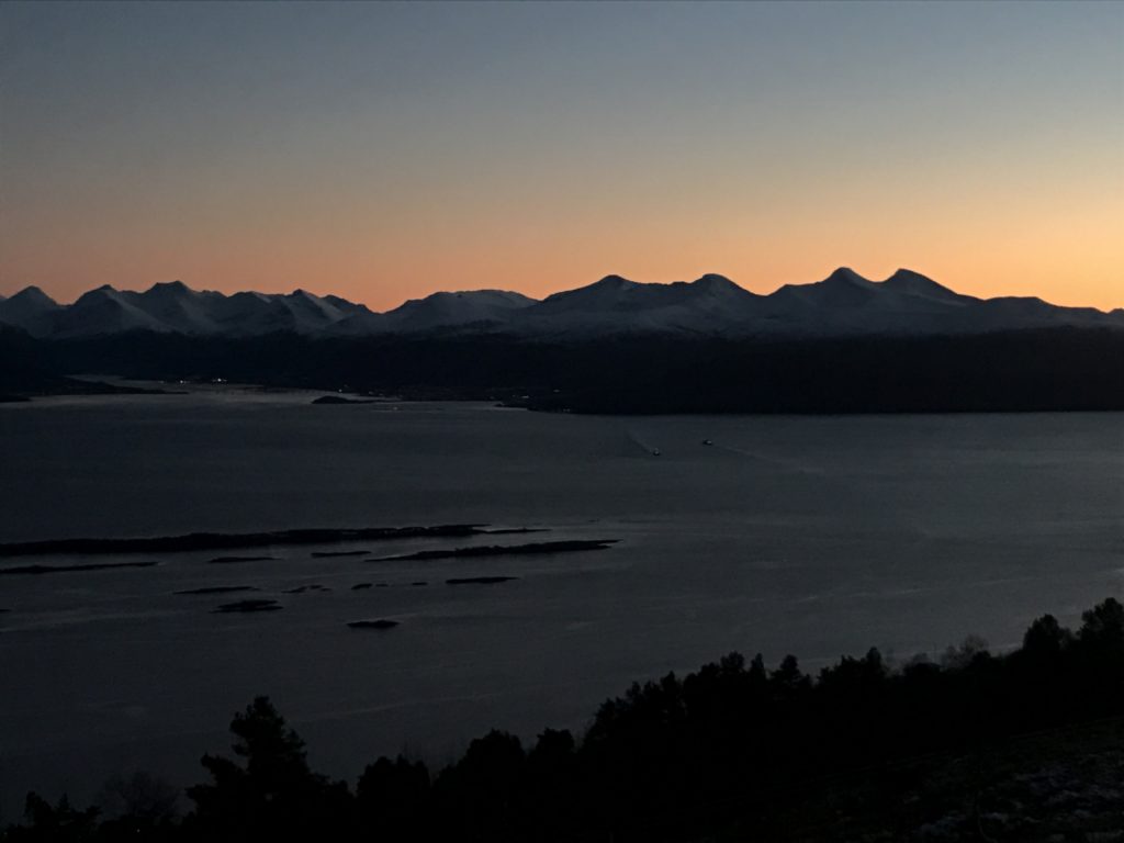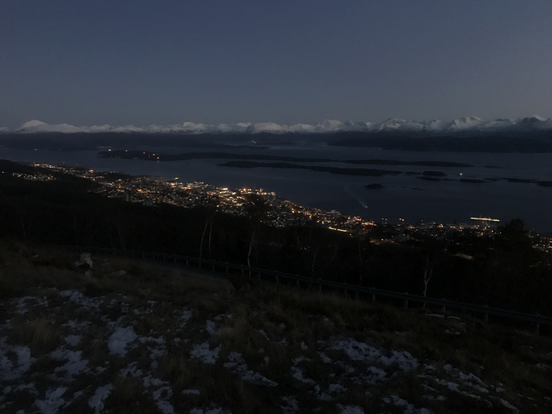 Übernachtet haben wir wieder auf einem zufällig aus unserer App Park4Night ausgewählten Platz auf der Strecke 400 Meter oberhalb der Hafenstadt Molde. Und dieser war der unbeschreiblichste Platz auf unserer Reise bisher: was für eine AUSSICHT! Wie im Märchen. Alex‘ Drohnenvideo sollten wir zu National Geographic einschicken… Unsere fahrbare Almhütte hat wieder alles an Aussicht gegeben und über Nacht auch noch standesmäßig Eiszapfen wachsen lassen (zum Glück nur außen; innen war es superflauschig warm).