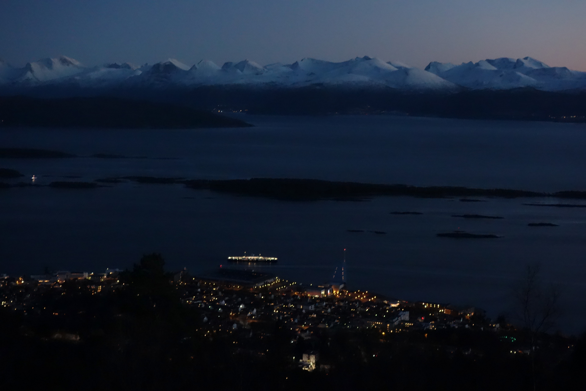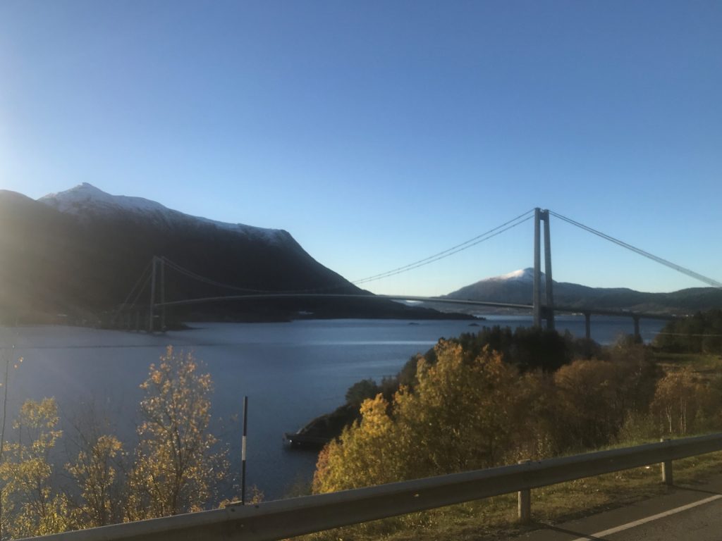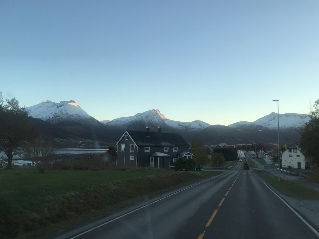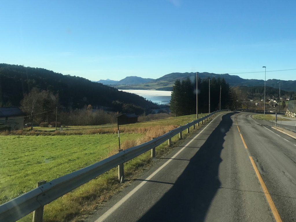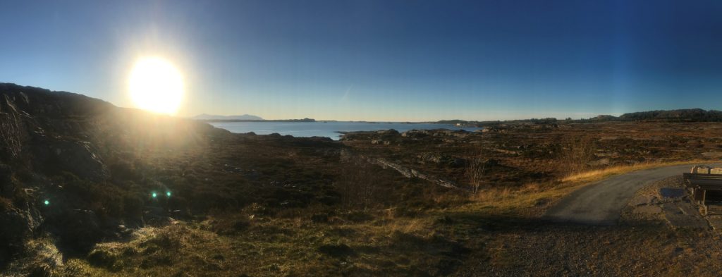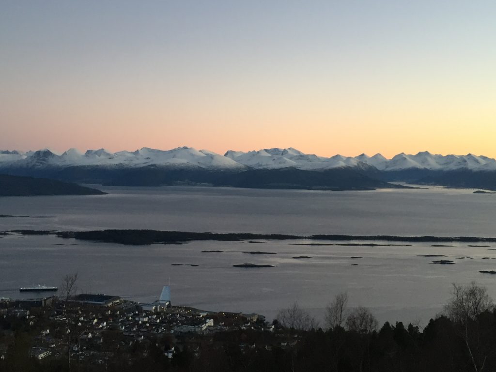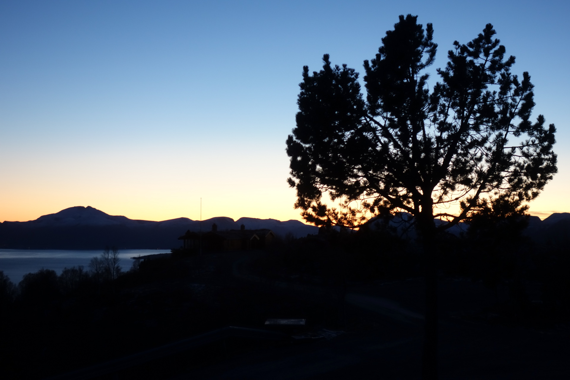 Übernachtet haben wir wieder auf einem zufällig aus unserer App Park4Night ausgewählten Platz auf der Strecke 400 Meter oberhalb der Hafenstadt Molde. Und dieser war der unbeschreiblichste Platz auf unserer Reise bisher: was für eine AUSSICHT! Wie im Märchen. Alex‘ Drohnenvideo sollten wir zu National Geographic einschicken… Unsere fahrbare Almhütte hat wieder alles an Aussicht gegeben und über Nacht auch noch standesmäßig Eiszapfen wachsen lassen (zum Glück nur außen; innen war es superflauschig warm).