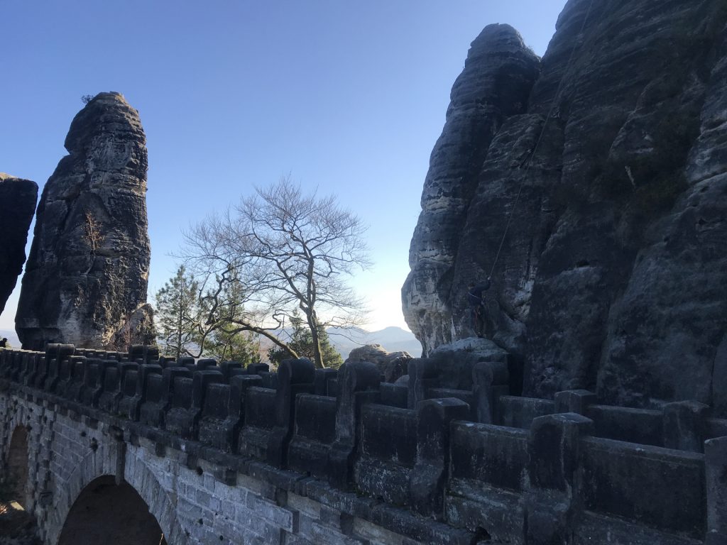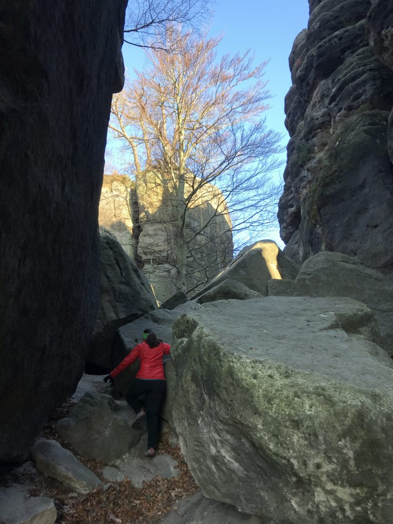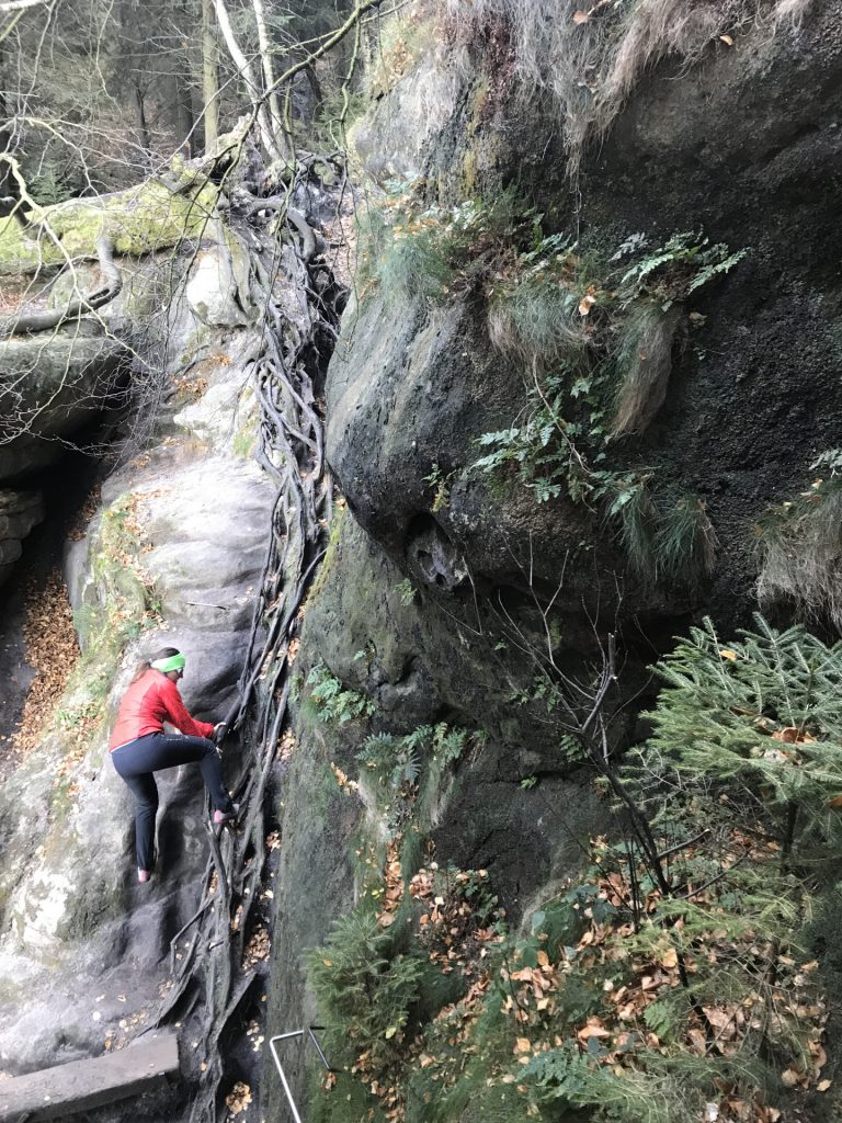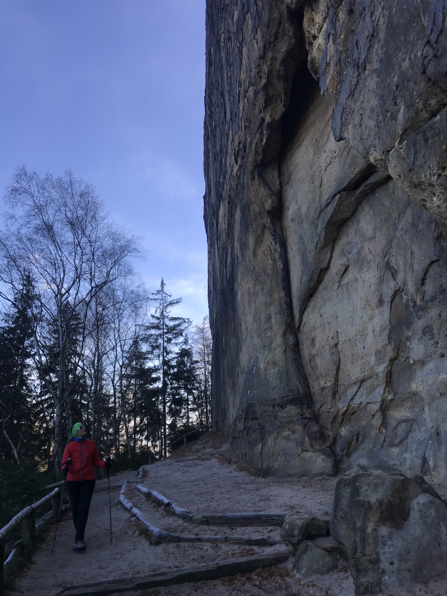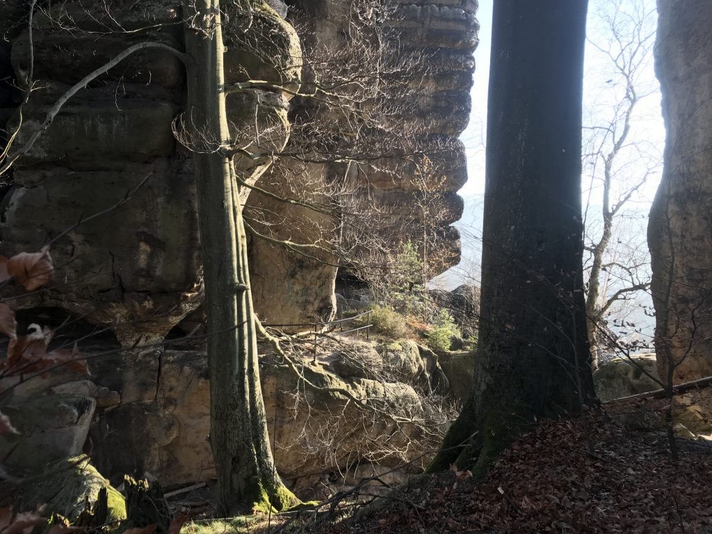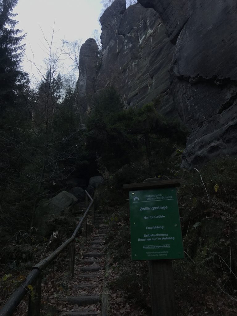 Alex hatte ja die unglaublich gute Idee, auf unserer Fahrt Richtung Süden in die Heimat durch die Sächsische Schweiz zu fahren (dafür haben wir die Weinstraße gekippt :D). Wirklich toll. Wie sich wahrscheinlich jeder vorstellen kann (oder sowieso schon dort war), landet man hier im Märchen-Wunderland. Und weils ja gerade jeder weiss, ist es im Sommer wahrscheinlich unglaublich voll. Nicht so im Dezember.. 😉 Wir haben ein sehr nettes (und kostenloses) Übernachtungsplätzchen auf einem Wanderparkplatz gehabt und es uns ein paar Tage gut gehen lassen. Richtig kalt ist es aber langsam schon geworden! 😉 Genutzt haben wir das gute (traumhafte!) Wetter für ein paar zauberhafte Wanderungen, auf denen wir fast alleine waren. Was für eine unglaublich schöne Gegend! Und soo tolle Treppen und Steige überall 😉 Wirklich ein wunderbarer Platz, um draußen sein zu können. Angesehen und bewandert haben wir die Bastion (Brücke), Schwedenlöcher, Heilige und Zwillingsstiegen, Rübezahl, Kuhställe und noch ein paar trollige Stiege, Steige und Treppen. Allerdings… So viele Stufen findet man auf der Welt nicht noch einmal, glaube ich.. Da wir bei unserer langen Wanderung einige „Klettersteige“ aneinandergereiht haben, sind wir alle dazwischen liegenden Höhenmeter auf den Stufen abwärts gegangen. Gut, gibt auch Knieschwammerl, aber so viele Treppen aufwärts wären auch ein echter Rekord gewesen. Wenn man die „Heilige Stiege“ aufwärts geht, glaubt man am Ende sicherlich an alles.. 😀