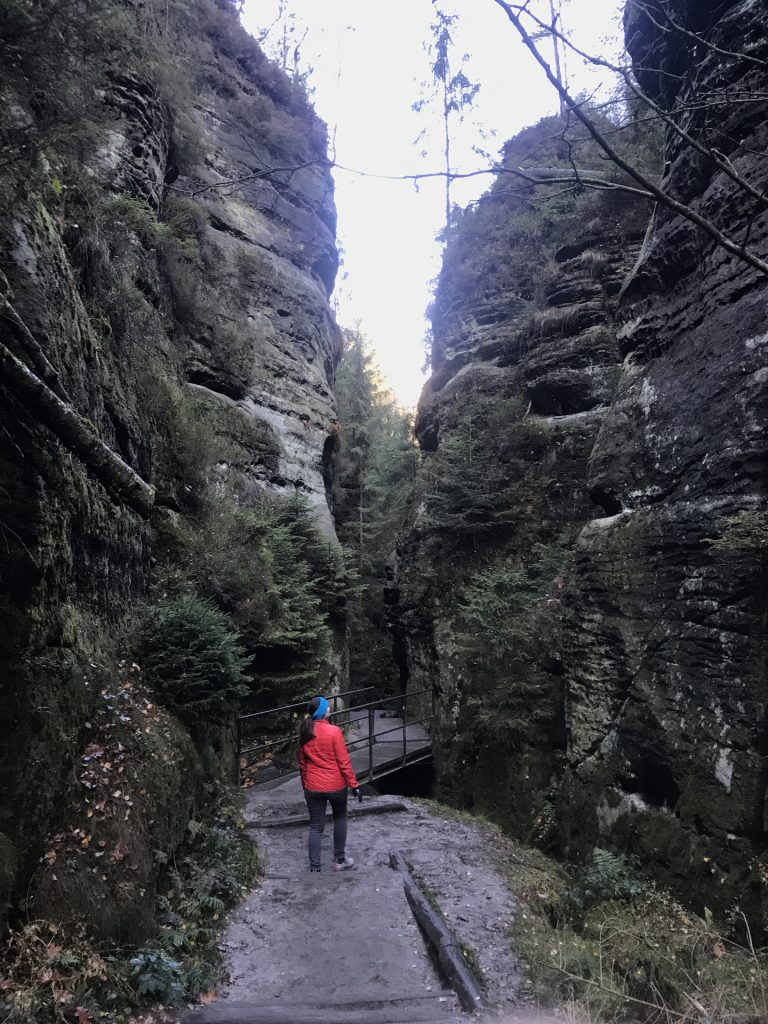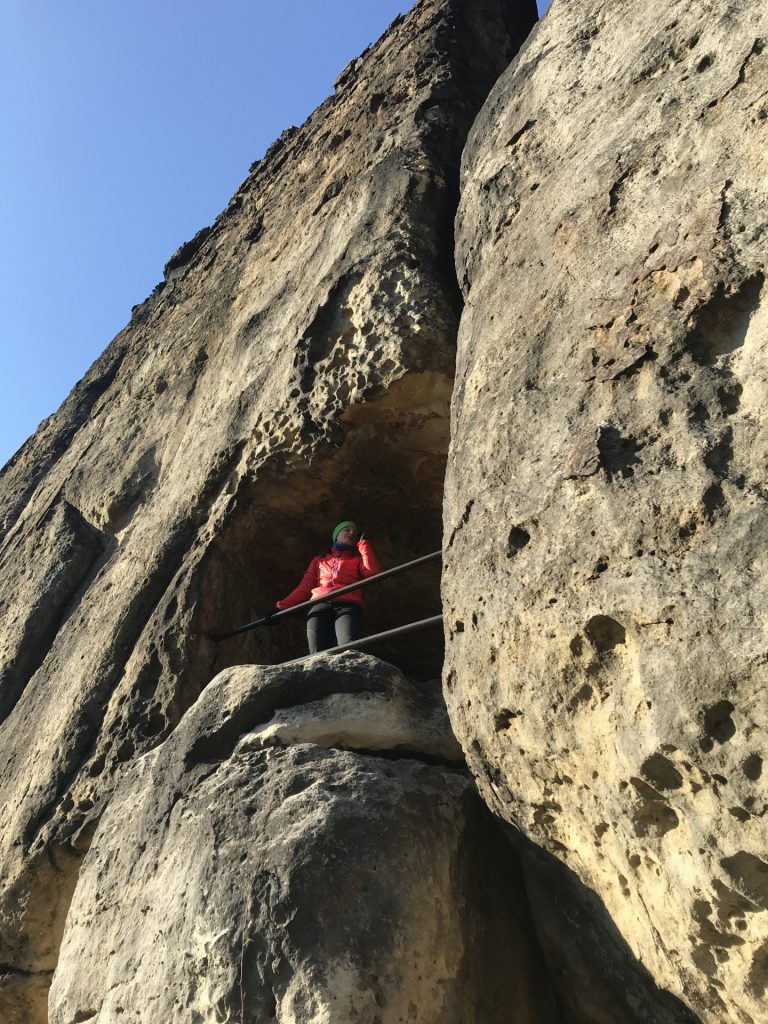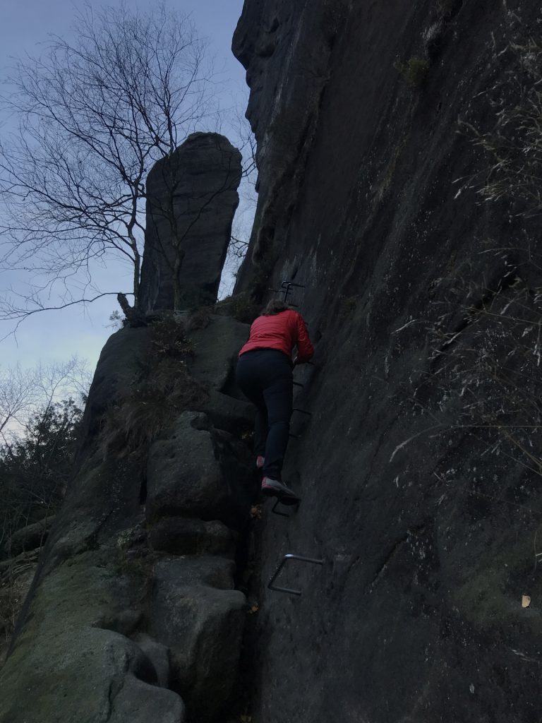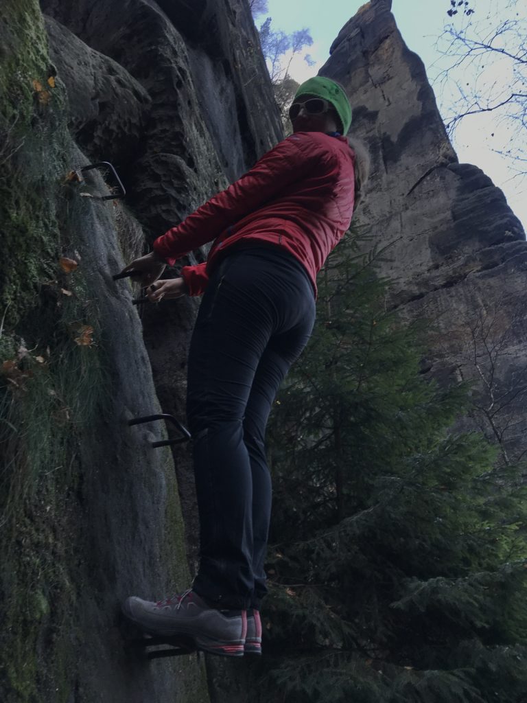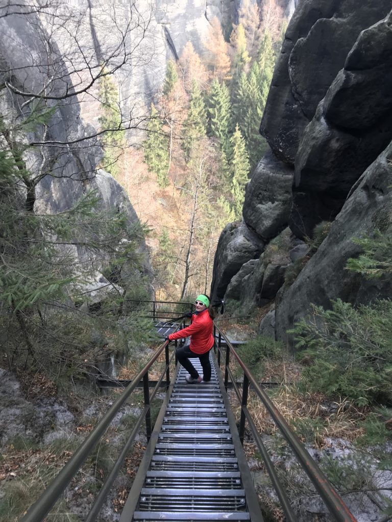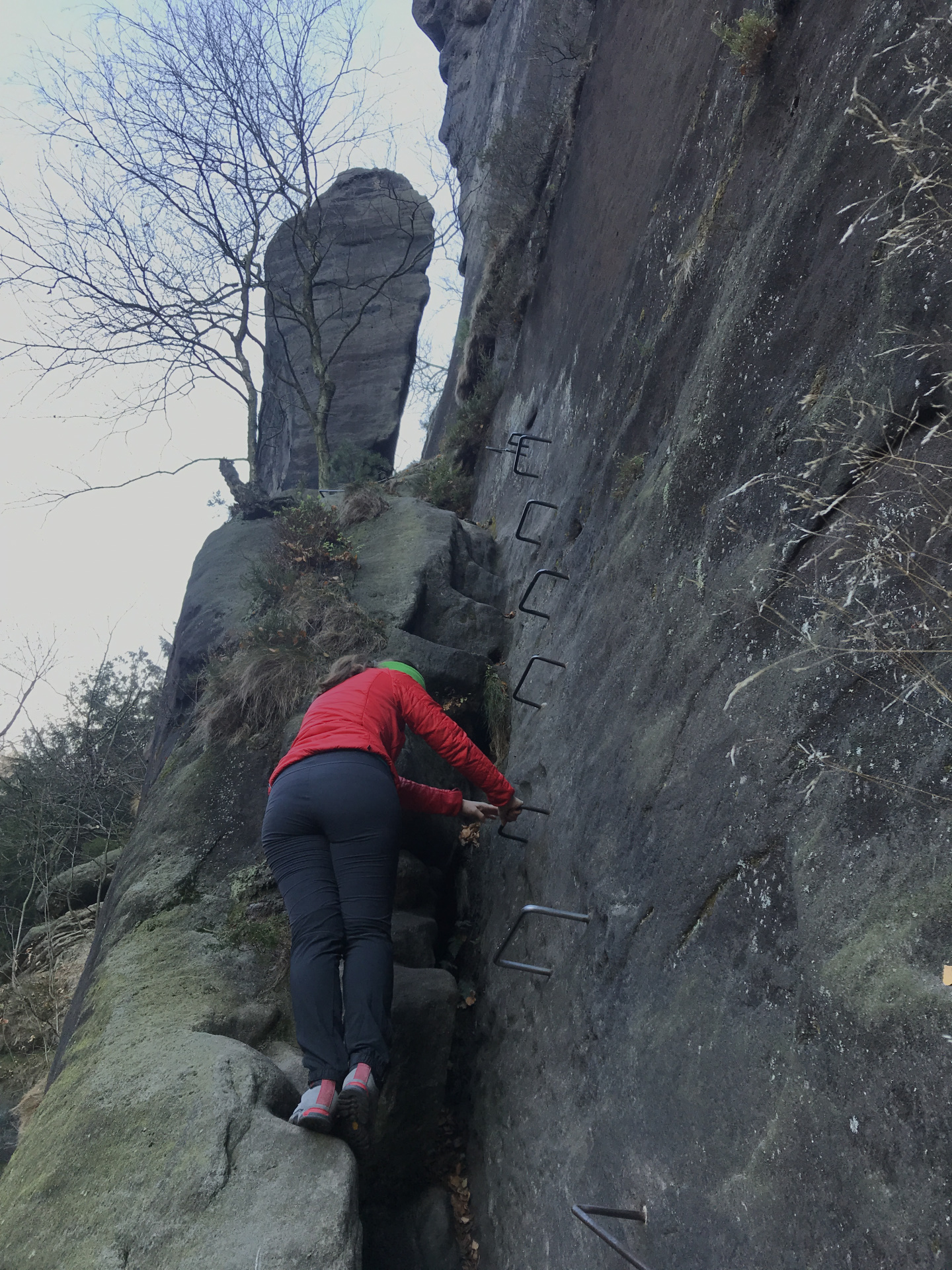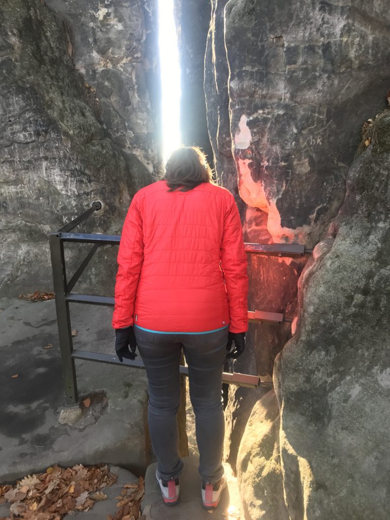 Alex hatte ja die unglaublich gute Idee, auf unserer Fahrt Richtung Süden in die Heimat durch die Sächsische Schweiz zu fahren (dafür haben wir die Weinstraße gekippt :D). Wirklich toll. Wie sich wahrscheinlich jeder vorstellen kann (oder sowieso schon dort war), landet man hier im Märchen-Wunderland. Und weils ja gerade jeder weiss, ist es im Sommer wahrscheinlich unglaublich voll. Nicht so im Dezember.. 😉 Wir haben ein sehr nettes (und kostenloses) Übernachtungsplätzchen auf einem Wanderparkplatz gehabt und es uns ein paar Tage gut gehen lassen. Richtig kalt ist es aber langsam schon geworden! 😉 Genutzt haben wir das gute (traumhafte!) Wetter für ein paar zauberhafte Wanderungen, auf denen wir fast alleine waren. Was für eine unglaublich schöne Gegend! Und soo tolle Treppen und Steige überall 😉 Wirklich ein wunderbarer Platz, um draußen sein zu können. Angesehen und bewandert haben wir die Bastion (Brücke), Schwedenlöcher, Heilige und Zwillingsstiegen, Rübezahl, Kuhställe und noch ein paar trollige Stiege, Steige und Treppen. Allerdings… So viele Stufen findet man auf der Welt nicht noch einmal, glaube ich.. Da wir bei unserer langen Wanderung einige „Klettersteige“ aneinandergereiht haben, sind wir alle dazwischen liegenden Höhenmeter auf den Stufen abwärts gegangen. Gut, gibt auch Knieschwammerl, aber so viele Treppen aufwärts wären auch ein echter Rekord gewesen. Wenn man die „Heilige Stiege“ aufwärts geht, glaubt man am Ende sicherlich an alles.. 😀