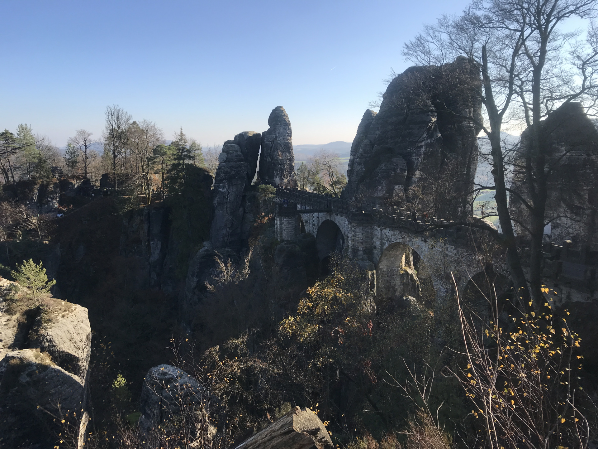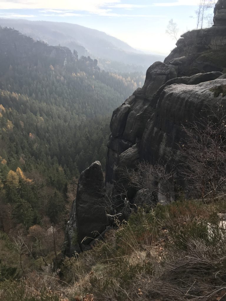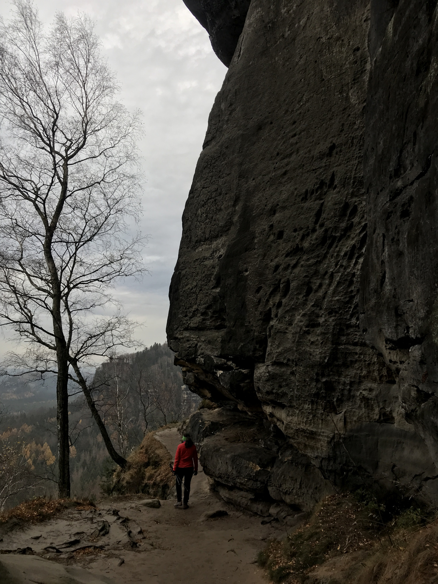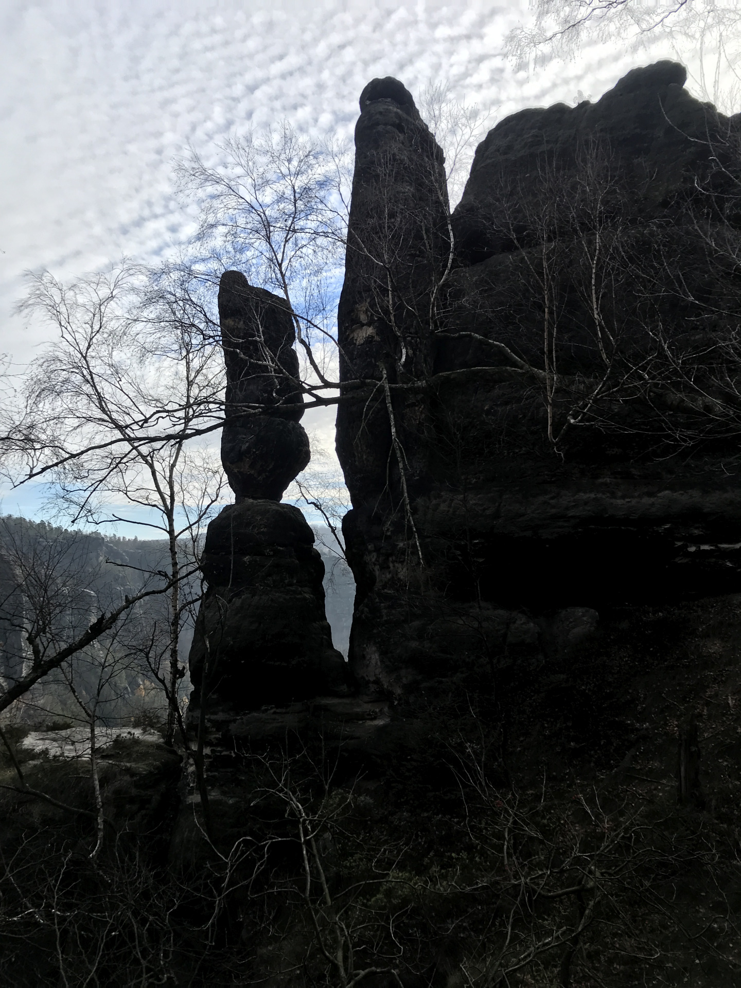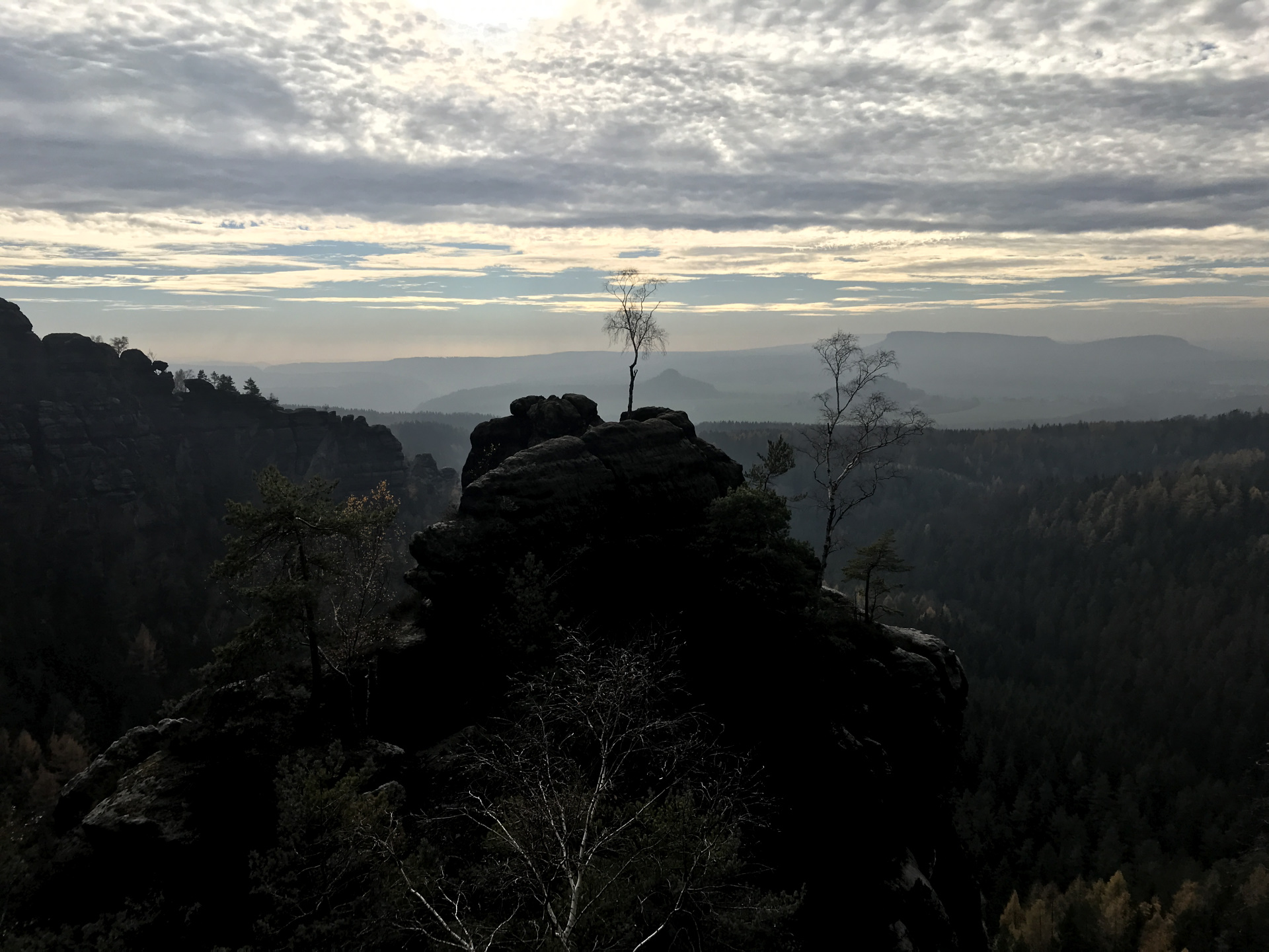 Alex hatte ja die unglaublich gute Idee, auf unserer Fahrt Richtung Süden in die Heimat durch die Sächsische Schweiz zu fahren (dafür haben wir die Weinstraße gekippt :D). Wirklich toll. Wie sich wahrscheinlich jeder vorstellen kann (oder sowieso schon dort war), landet man hier im Märchen-Wunderland. Und weils ja gerade jeder weiss, ist es im Sommer wahrscheinlich unglaublich voll. Nicht so im Dezember.. 😉 Wir haben ein sehr nettes (und kostenloses) Übernachtungsplätzchen auf einem Wanderparkplatz gehabt und es uns ein paar Tage gut gehen lassen. Richtig kalt ist es aber langsam schon geworden! 😉 Genutzt haben wir das gute (traumhafte!) Wetter für ein paar zauberhafte Wanderungen, auf denen wir fast alleine waren. Was für eine unglaublich schöne Gegend! Und soo tolle Treppen und Steige überall 😉 Wirklich ein wunderbarer Platz, um draußen sein zu können. Angesehen und bewandert haben wir die Bastion (Brücke), Schwedenlöcher, Heilige und Zwillingsstiegen, Rübezahl, Kuhställe und noch ein paar trollige Stiege, Steige und Treppen. Allerdings… So viele Stufen findet man auf der Welt nicht noch einmal, glaube ich.. Da wir bei unserer langen Wanderung einige „Klettersteige“ aneinandergereiht haben, sind wir alle dazwischen liegenden Höhenmeter auf den Stufen abwärts gegangen. Gut, gibt auch Knieschwammerl, aber so viele Treppen aufwärts wären auch ein echter Rekord gewesen. Wenn man die „Heilige Stiege“ aufwärts geht, glaubt man am Ende sicherlich an alles.. 😀