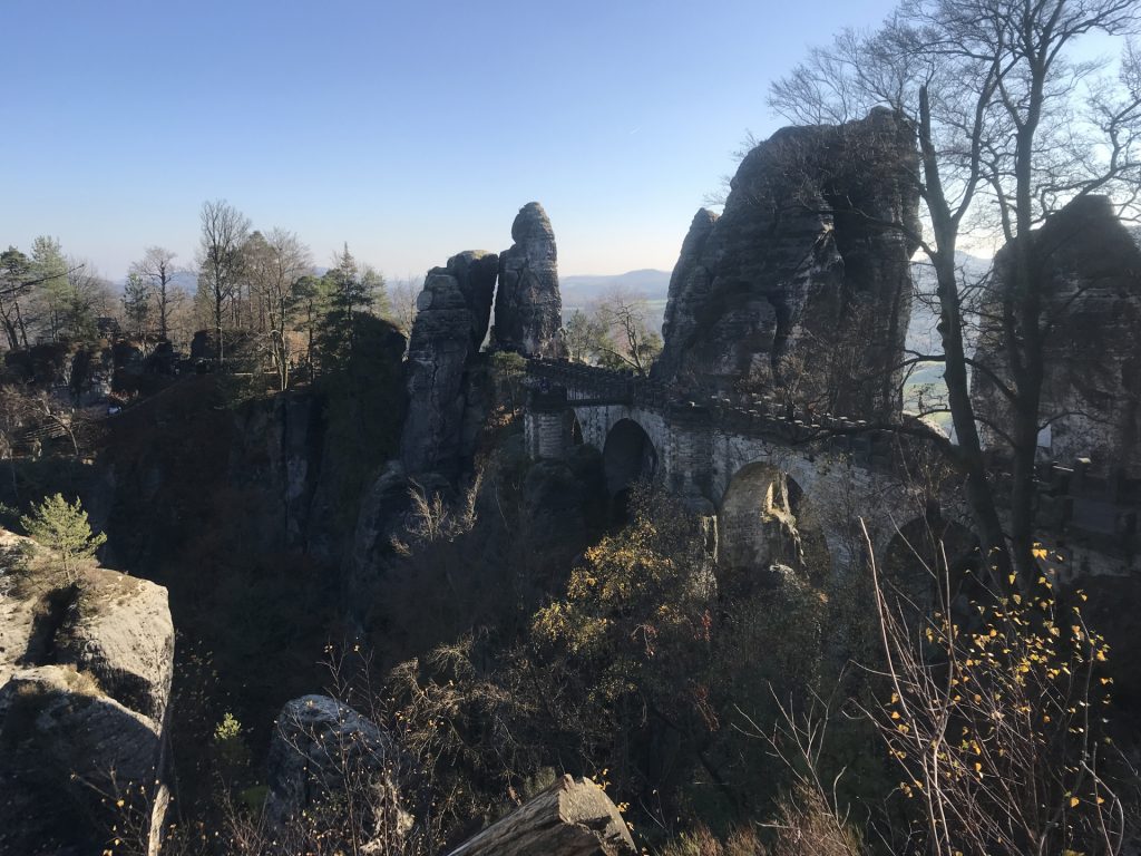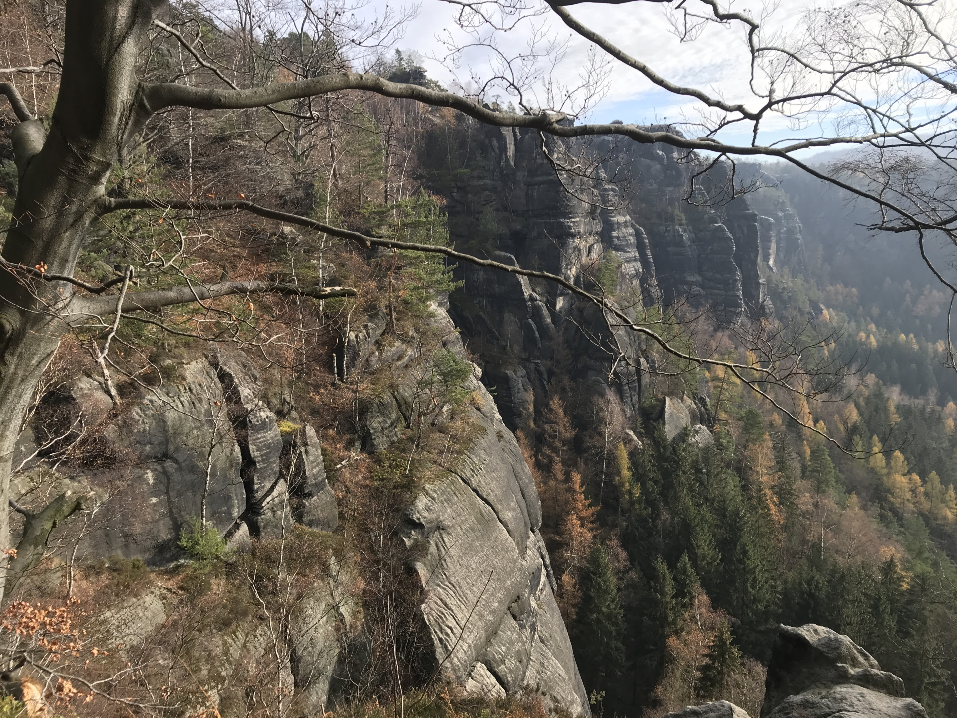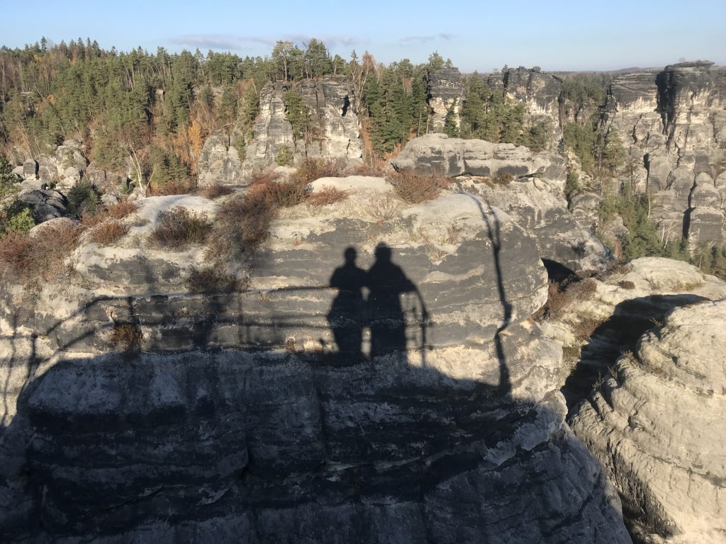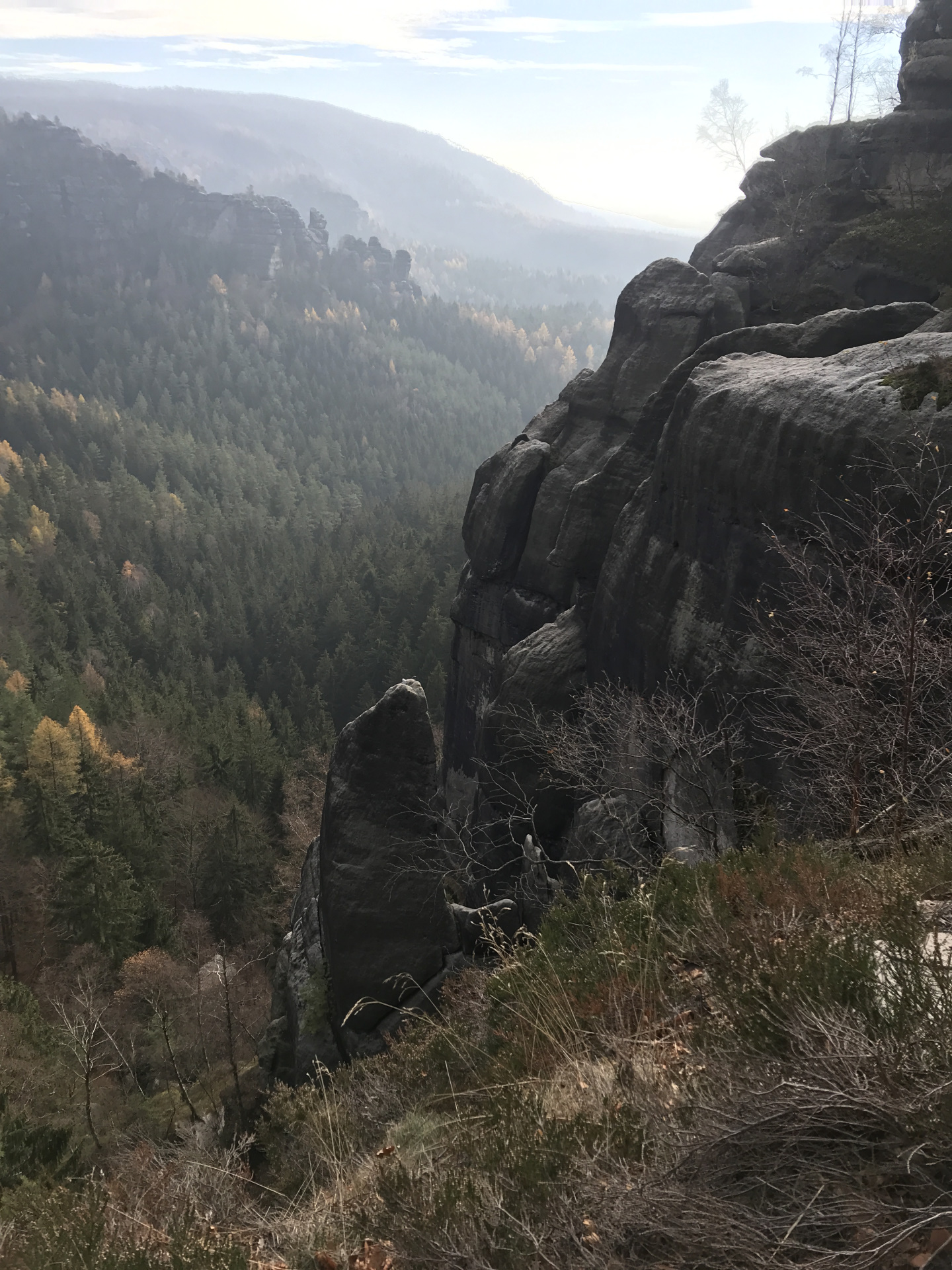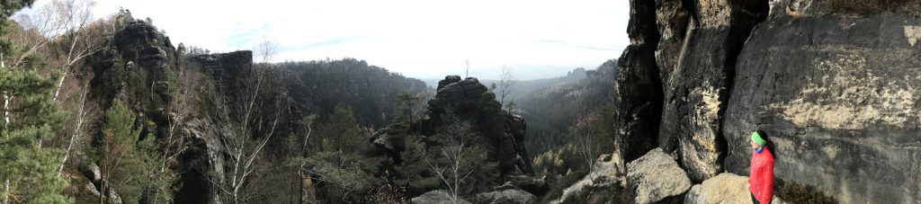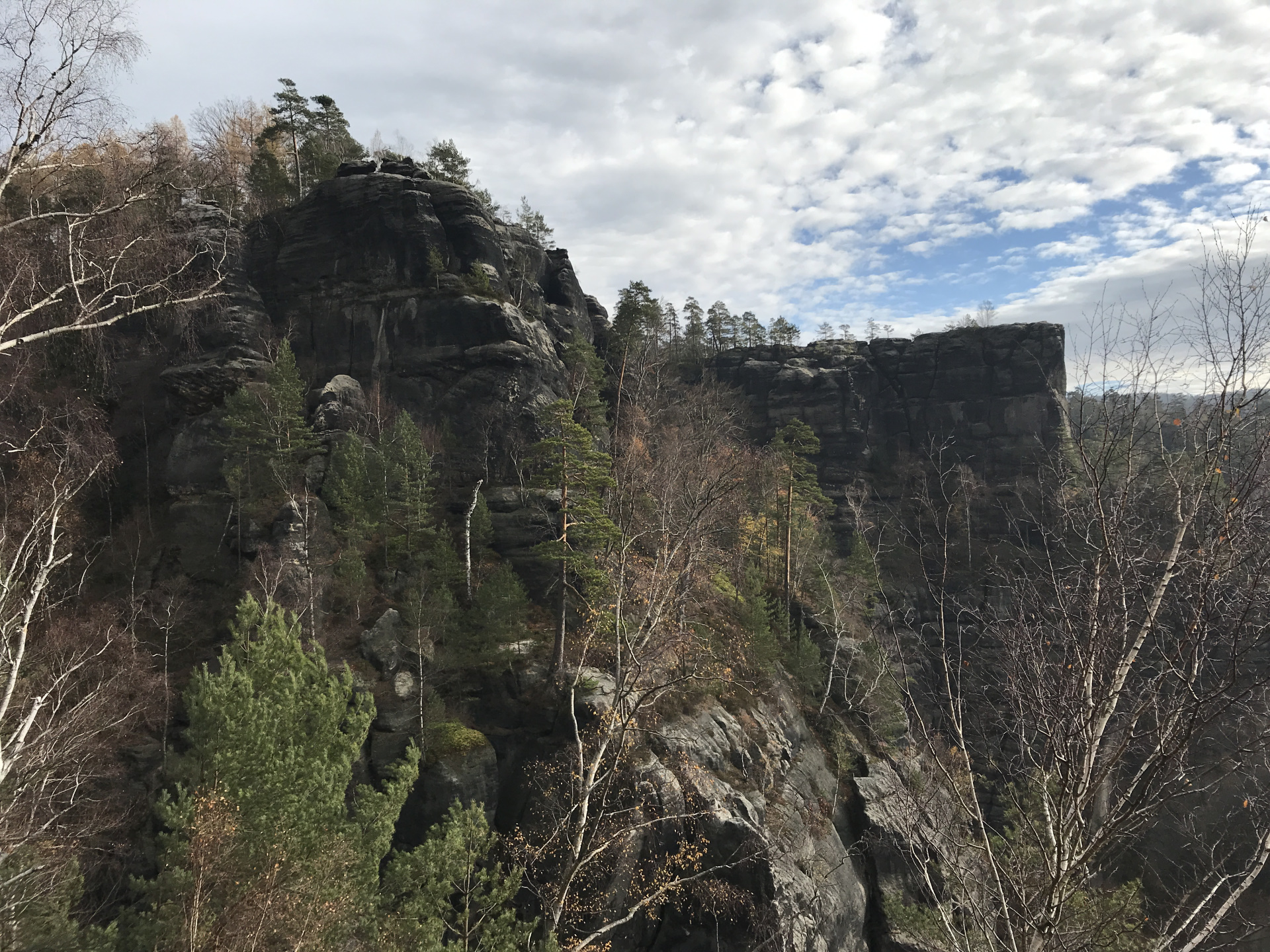 Alex hatte ja die unglaublich gute Idee, auf unserer Fahrt Richtung Süden in die Heimat durch die Sächsische Schweiz zu fahren (dafür haben wir die Weinstraße gekippt :D). Wirklich toll. Wie sich wahrscheinlich jeder vorstellen kann (oder sowieso schon dort war), landet man hier im Märchen-Wunderland. Und weils ja gerade jeder weiss, ist es im Sommer wahrscheinlich unglaublich voll. Nicht so im Dezember.. 😉 Wir haben ein sehr nettes (und kostenloses) Übernachtungsplätzchen auf einem Wanderparkplatz gehabt und es uns ein paar Tage gut gehen lassen. Richtig kalt ist es aber langsam schon geworden! 😉 Genutzt haben wir das gute (traumhafte!) Wetter für ein paar zauberhafte Wanderungen, auf denen wir fast alleine waren. Was für eine unglaublich schöne Gegend! Und soo tolle Treppen und Steige überall 😉 Wirklich ein wunderbarer Platz, um draußen sein zu können. Angesehen und bewandert haben wir die Bastion (Brücke), Schwedenlöcher, Heilige und Zwillingsstiegen, Rübezahl, Kuhställe und noch ein paar trollige Stiege, Steige und Treppen. Allerdings… So viele Stufen findet man auf der Welt nicht noch einmal, glaube ich.. Da wir bei unserer langen Wanderung einige „Klettersteige“ aneinandergereiht haben, sind wir alle dazwischen liegenden Höhenmeter auf den Stufen abwärts gegangen. Gut, gibt auch Knieschwammerl, aber so viele Treppen aufwärts wären auch ein echter Rekord gewesen. Wenn man die „Heilige Stiege“ aufwärts geht, glaubt man am Ende sicherlich an alles.. 😀