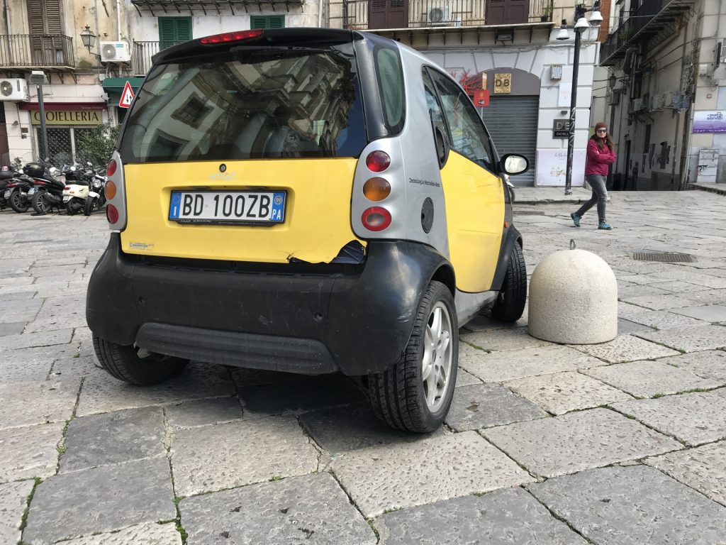 Und ein Smart bazt sich durch ein Absperrung (ein zweiter Beton-Poller ist auf der linken Seite..)