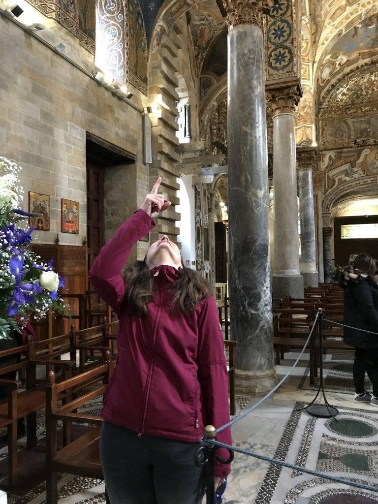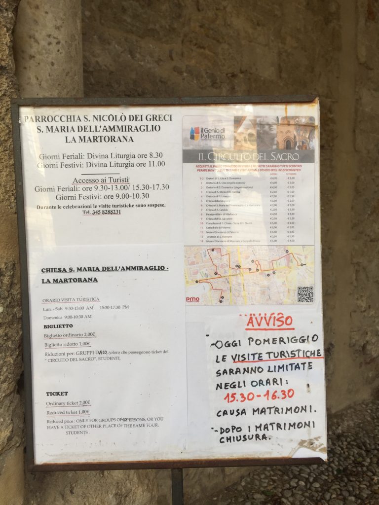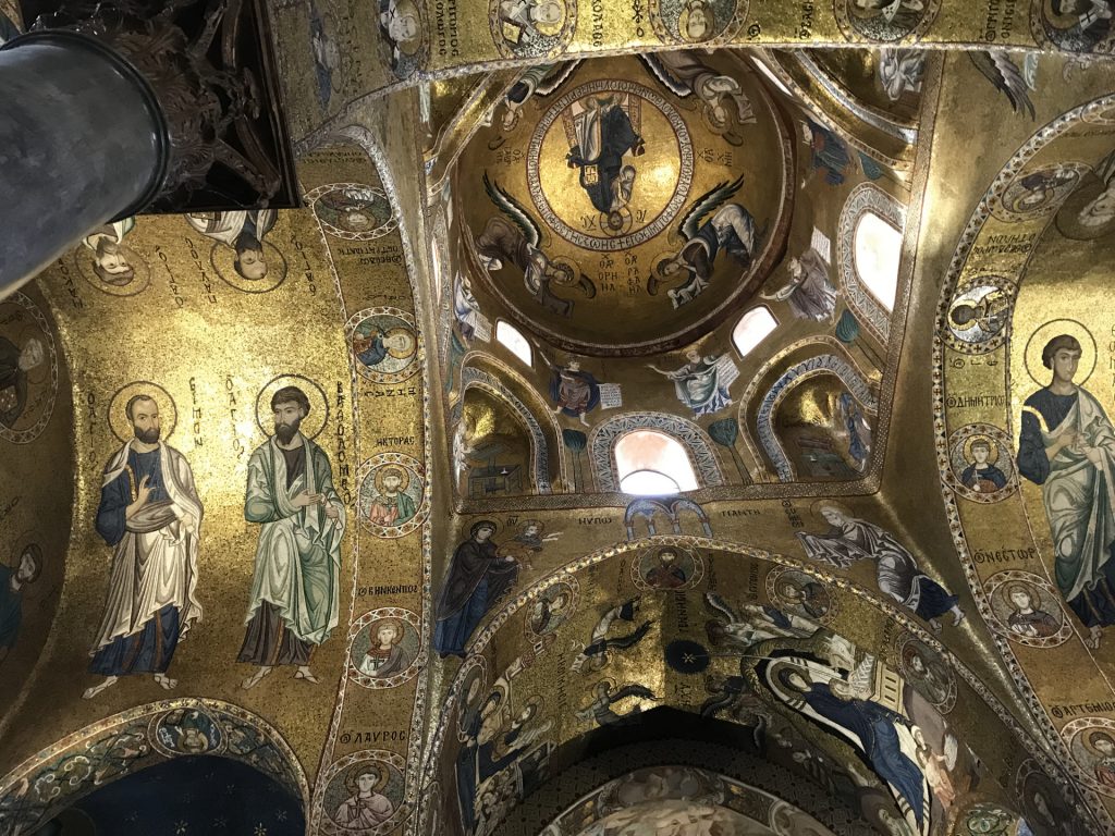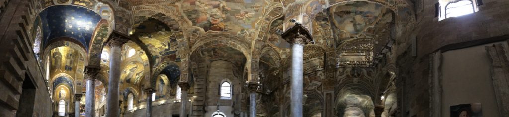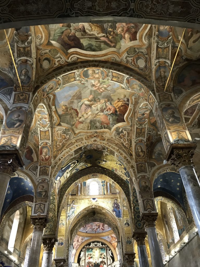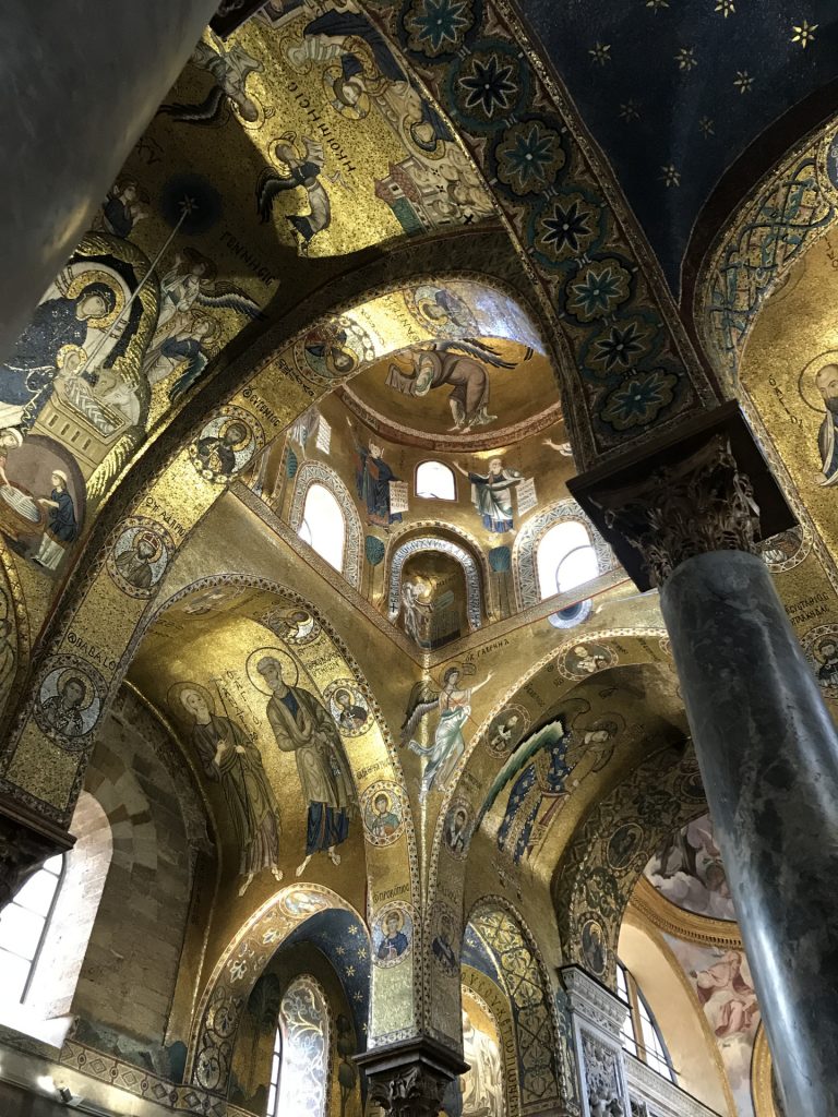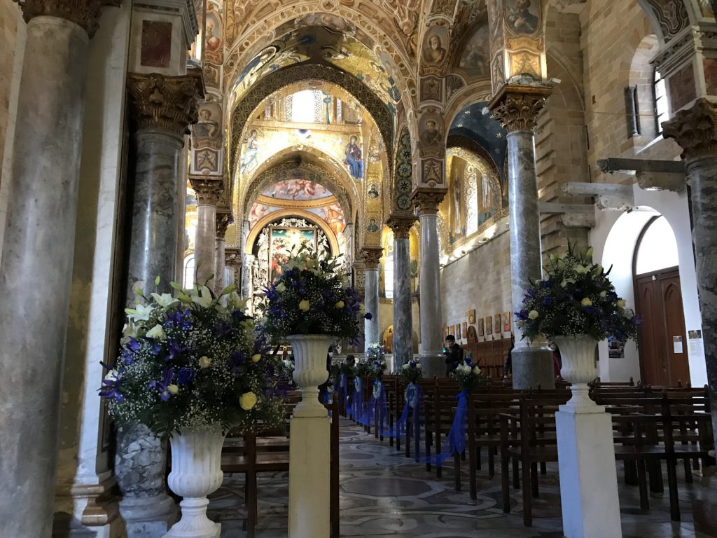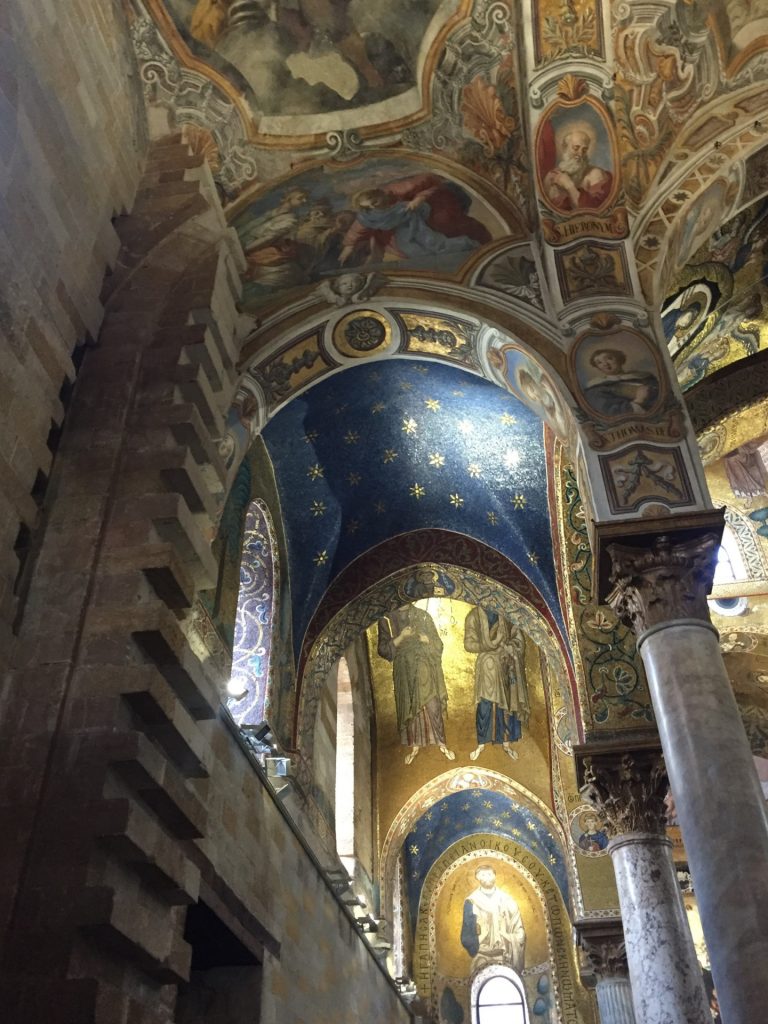 Die Kirche Santa Maria dell’Ammiraglio ist ein ÜBERBORDENDES Mosaik Gesamtkunstwerk, das wir so noch nicht gesehen haben. Die Kirche besteht aus verschiedensten ineinander gebauten Kirchen und ist über und über mit feinstem (Gold-)Mosaik geschmückt. Dazu wieder die roten Kuppel! Sehr aaalt und unheimlich beliebt für Hochzeiten!