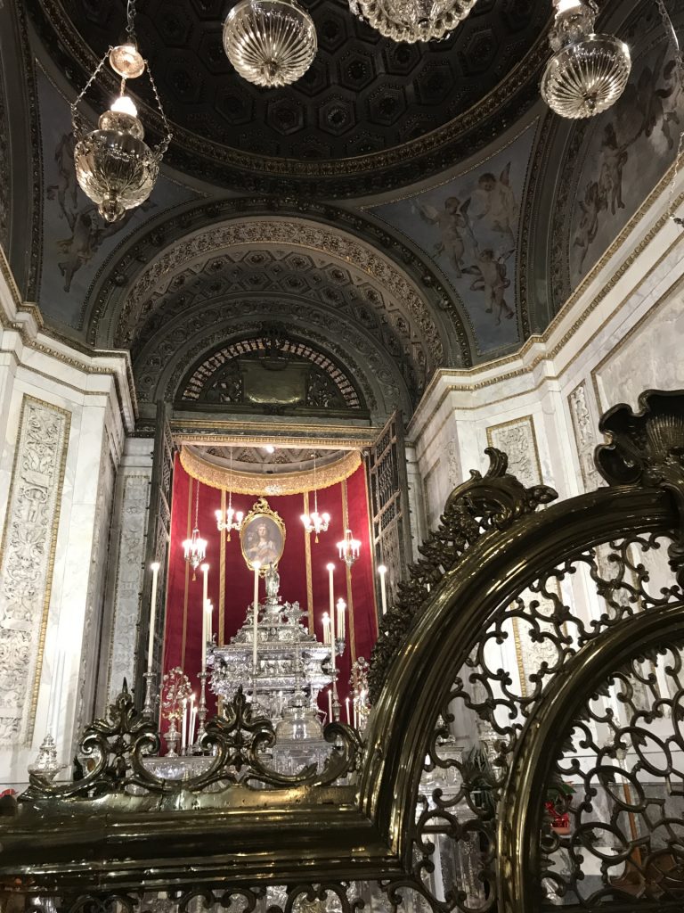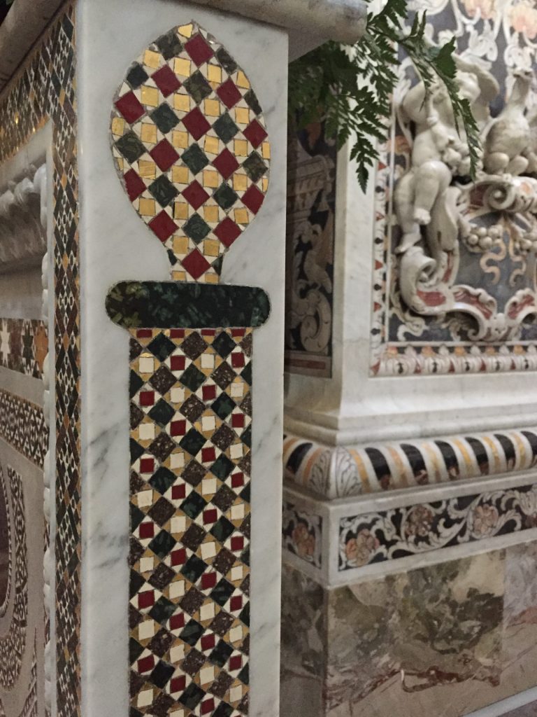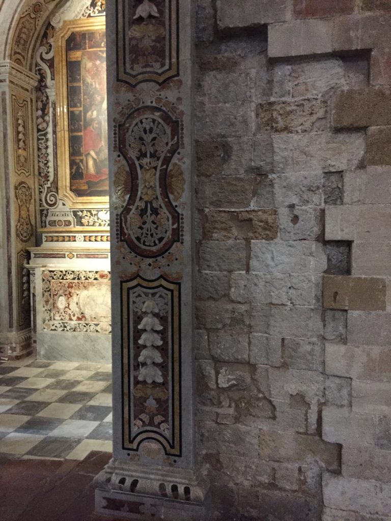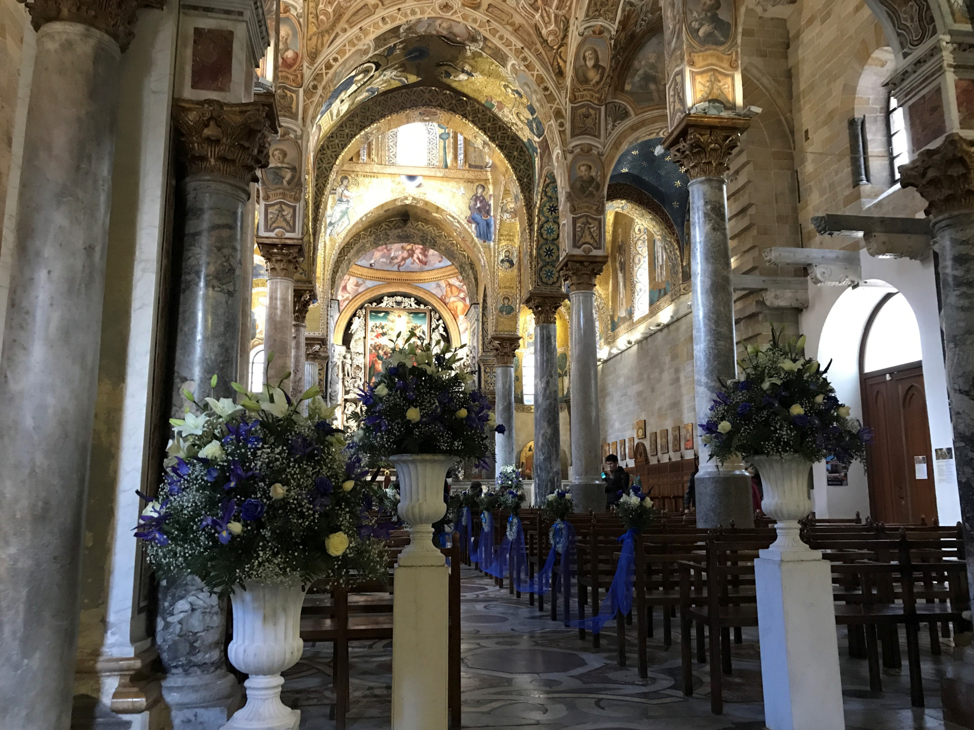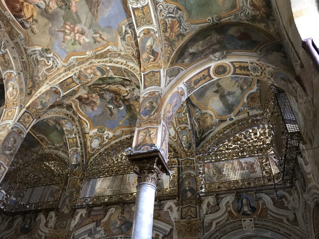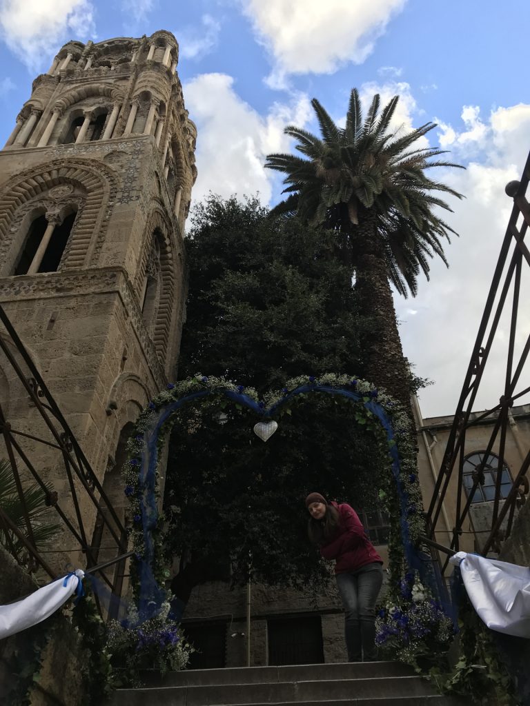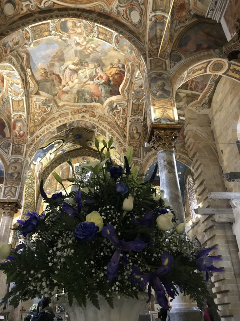 Die Kirche Santa Maria dell’Ammiraglio ist ein ÜBERBORDENDES Mosaik Gesamtkunstwerk, das wir so noch nicht gesehen haben. Die Kirche besteht aus verschiedensten ineinander gebauten Kirchen und ist über und über mit feinstem (Gold-)Mosaik geschmückt. Dazu wieder die roten Kuppel! Sehr aaalt und unheimlich beliebt für Hochzeiten!