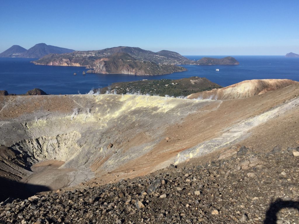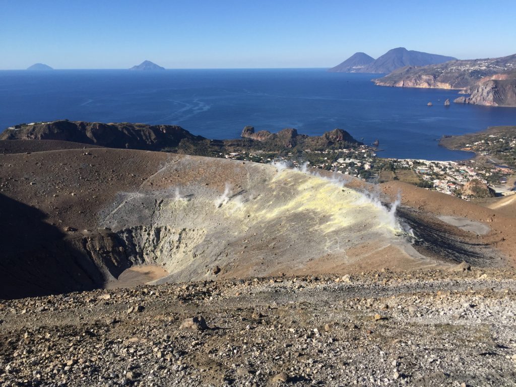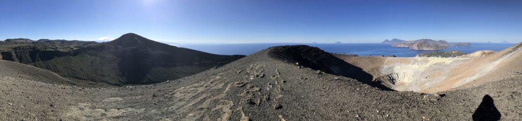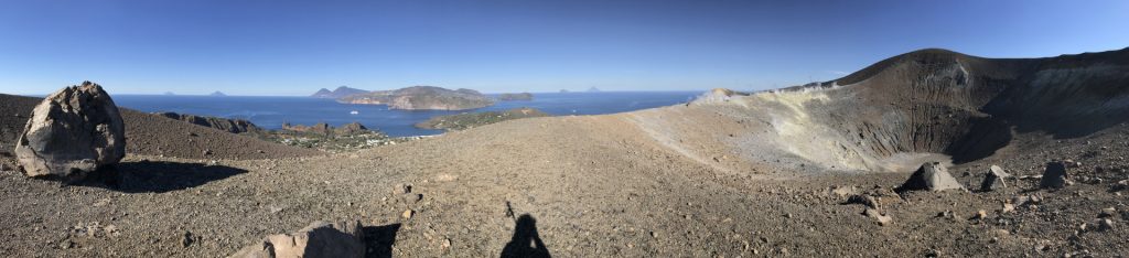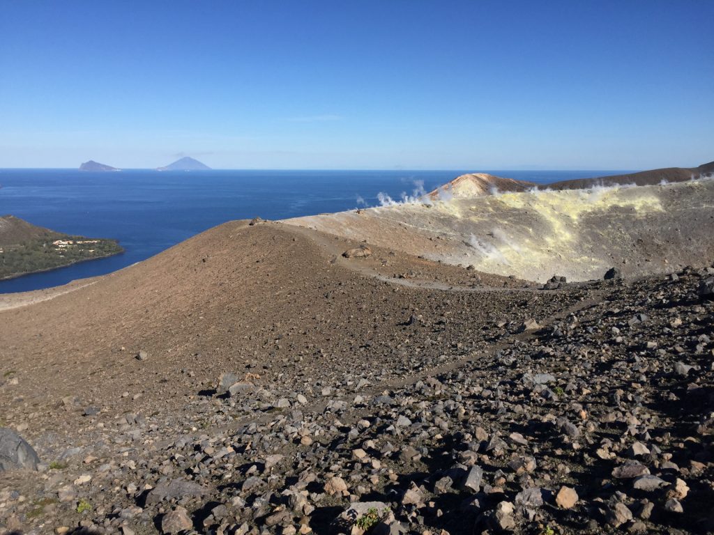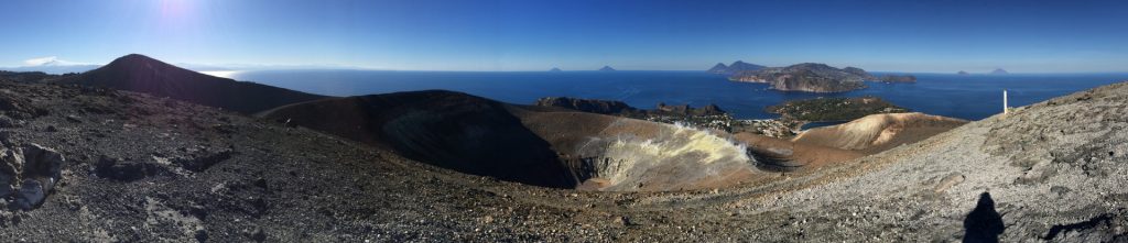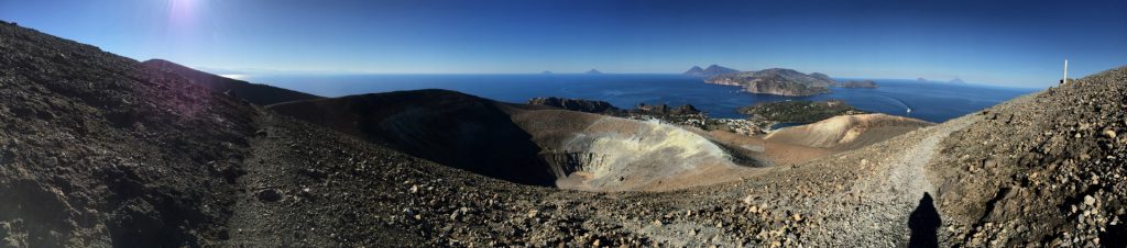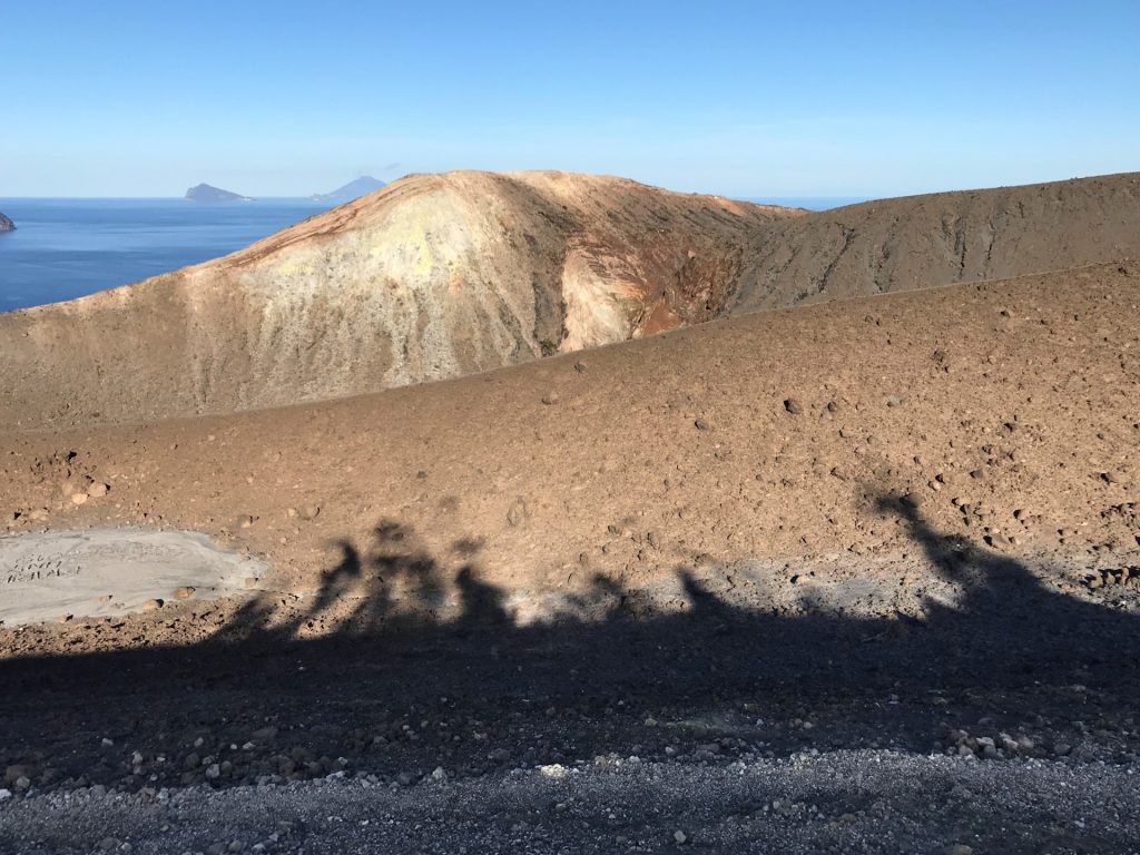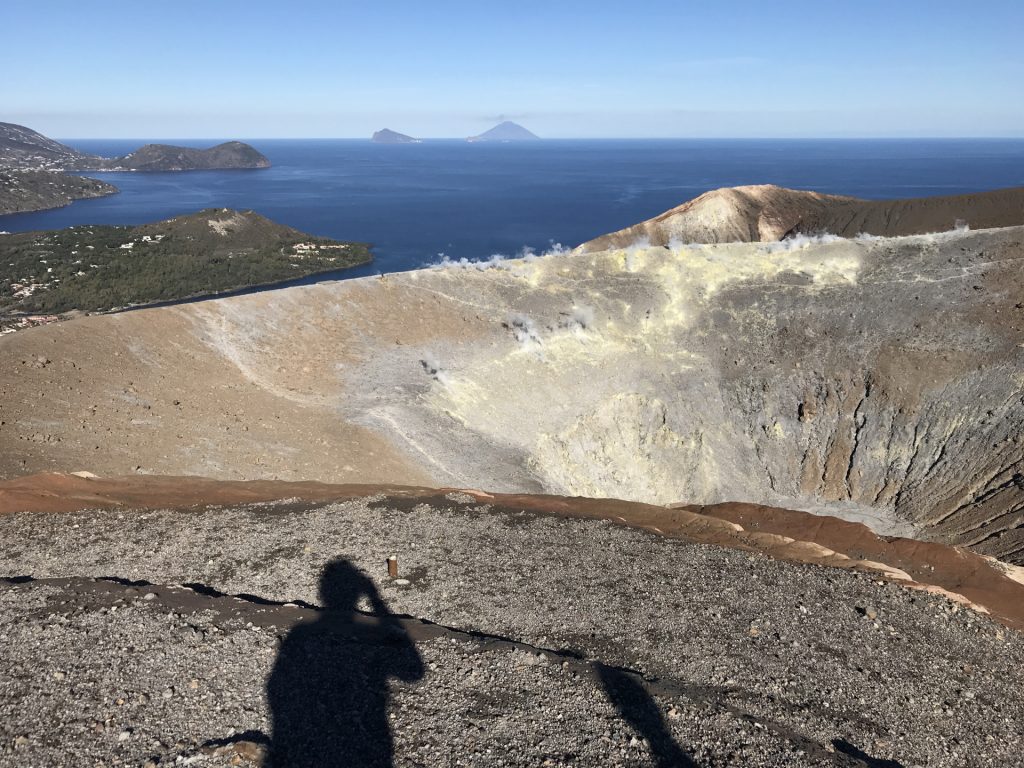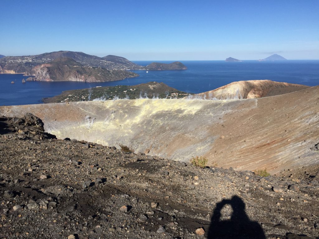 Wir sind mit unserem Teilzeit-Panda hingetuckert (unsere Unterkunft liegt ja „hinter“ dem Krater, in der Bergen; genauer gesagt ist das der uralte erste Krater, der nun ein Gebirge „hinter“ dem neuen Krater bildet) und hatten ab dem ersten Schritt tausend unbeschreibliche Eindrücke: Die unglaubliche Aussicht auf Vulcano und die anderen Liparischen Inseln. Der vielfarbige und rauchende Krater „Grand Cratere“ ist ein Erlebnis: unten geht es über schwarzen Lava Sand. Der ist dann irgendwie abgerutscht und gibt eine Lehm-Schicht frei, die sehr stark erodiert: Das Wasser gräbt Canyons hinein! Es hat scheinbar einmal eine Strasse zum Kraterrand gegeben (für den Mineralien-Abbau vielleicht?), die hat der Vulkan aber schon erfolgreich „bearbeitet“ 😀