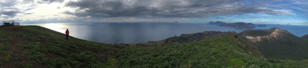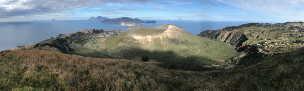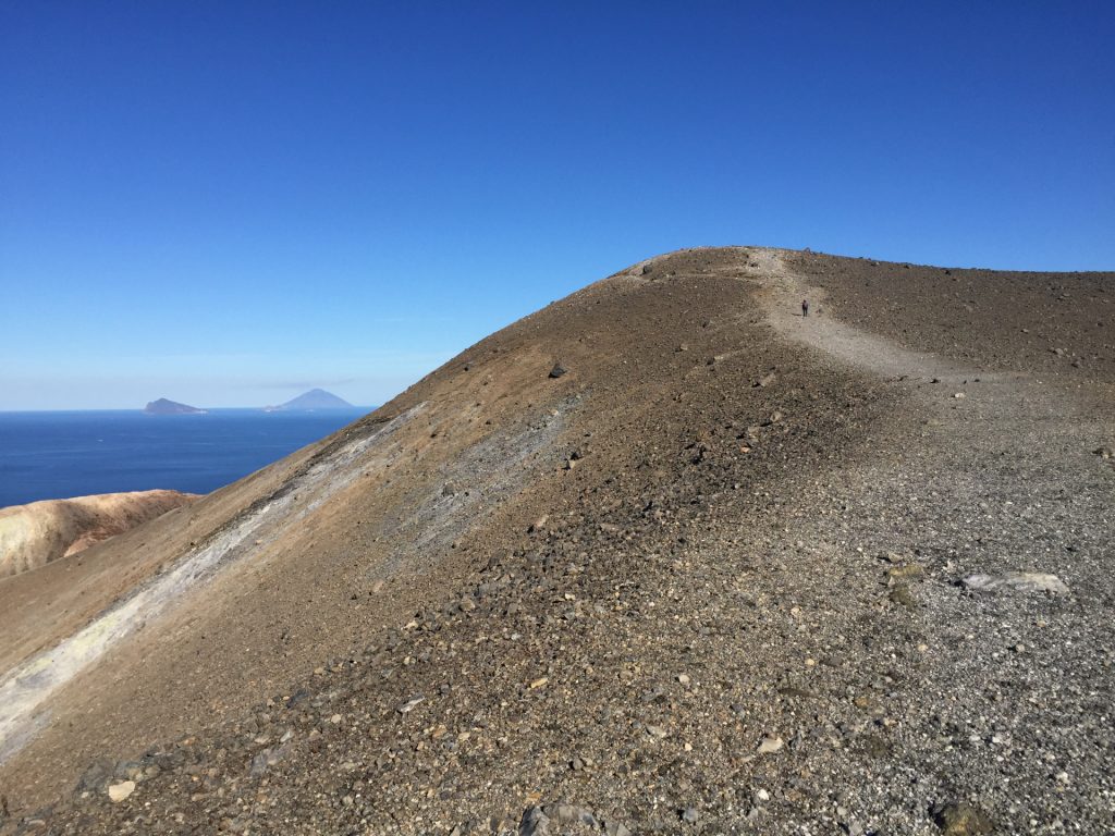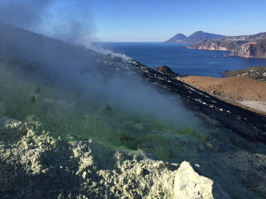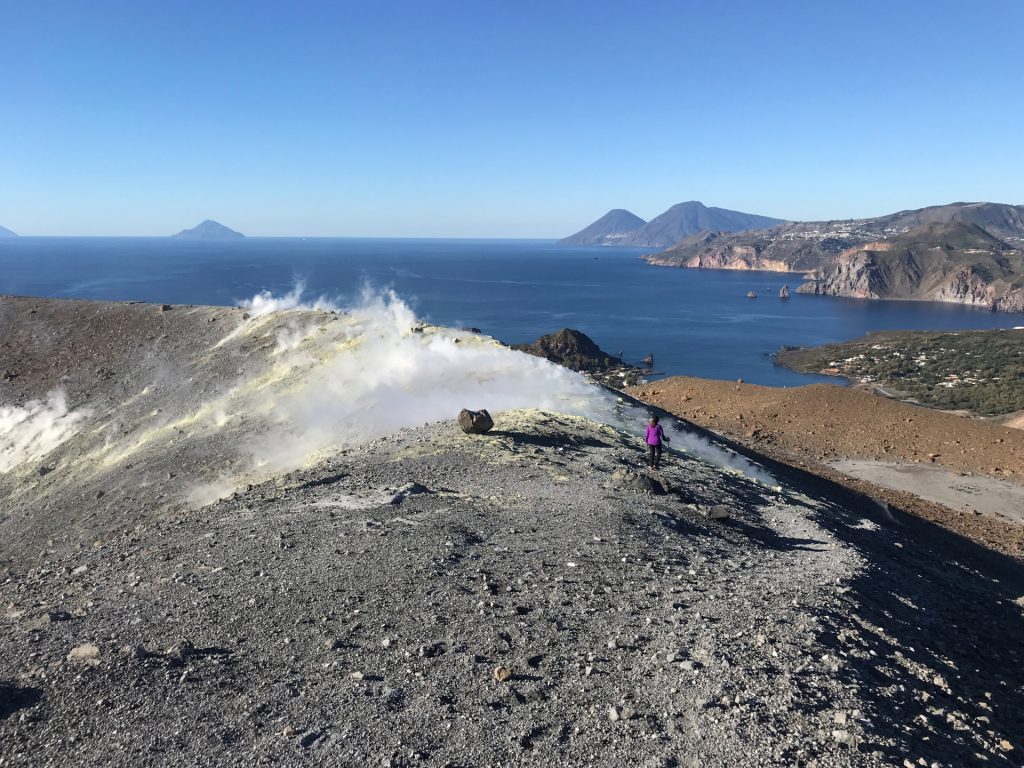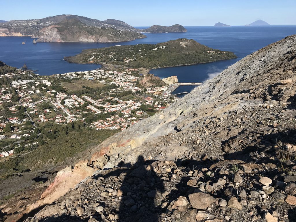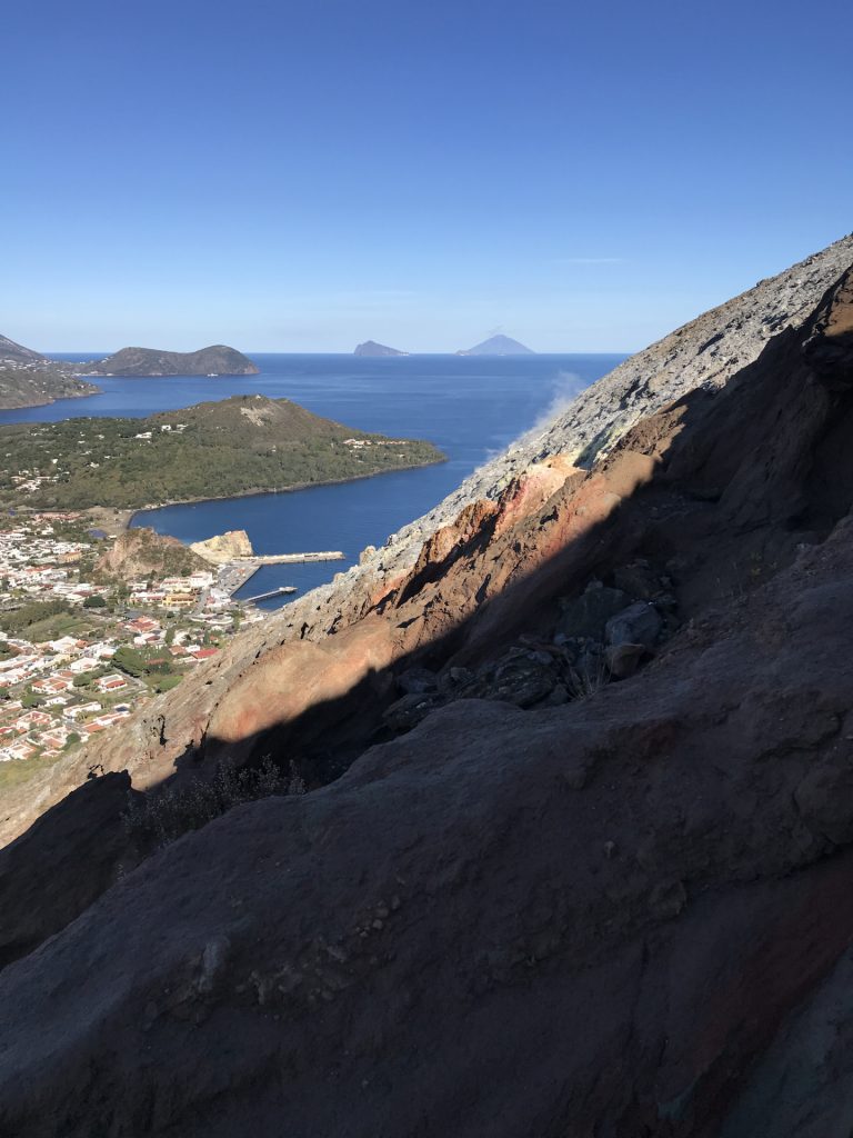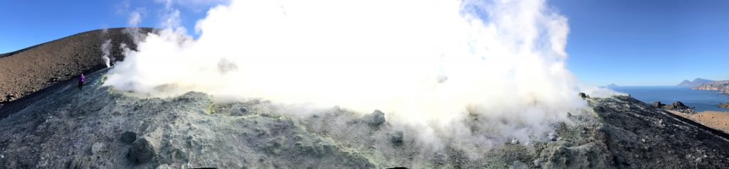 Wir sind mit unserem Teilzeit-Panda hingetuckert (unsere Unterkunft liegt ja „hinter“ dem Krater, in der Bergen; genauer gesagt ist das der uralte erste Krater, der nun ein Gebirge „hinter“ dem neuen Krater bildet) und hatten ab dem ersten Schritt tausend unbeschreibliche Eindrücke: Die unglaubliche Aussicht auf Vulcano und die anderen Liparischen Inseln. Der vielfarbige und rauchende Krater „Grand Cratere“ ist ein Erlebnis: unten geht es über schwarzen Lava Sand. Der ist dann irgendwie abgerutscht und gibt eine Lehm-Schicht frei, die sehr stark erodiert: Das Wasser gräbt Canyons hinein! Es hat scheinbar einmal eine Strasse zum Kraterrand gegeben (für den Mineralien-Abbau vielleicht?), die hat der Vulkan aber schon erfolgreich „bearbeitet“ 😀