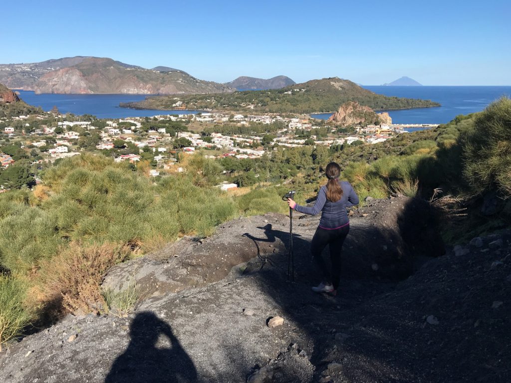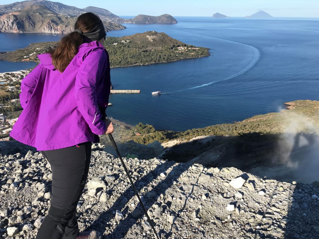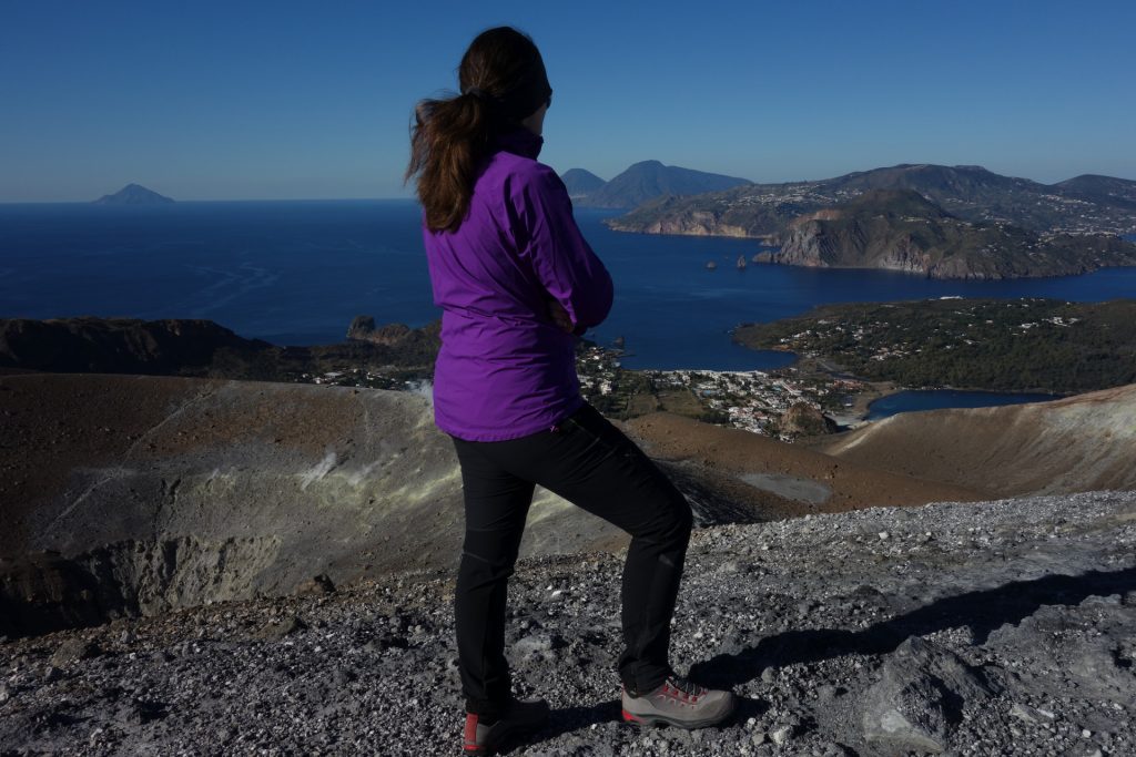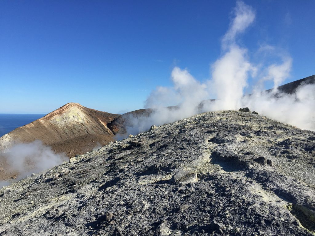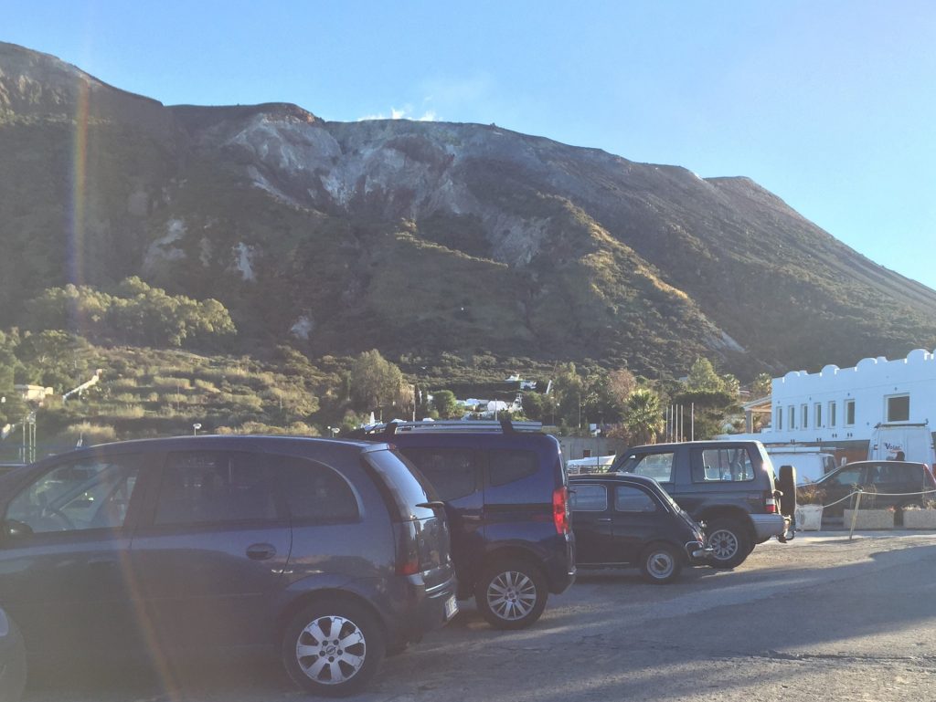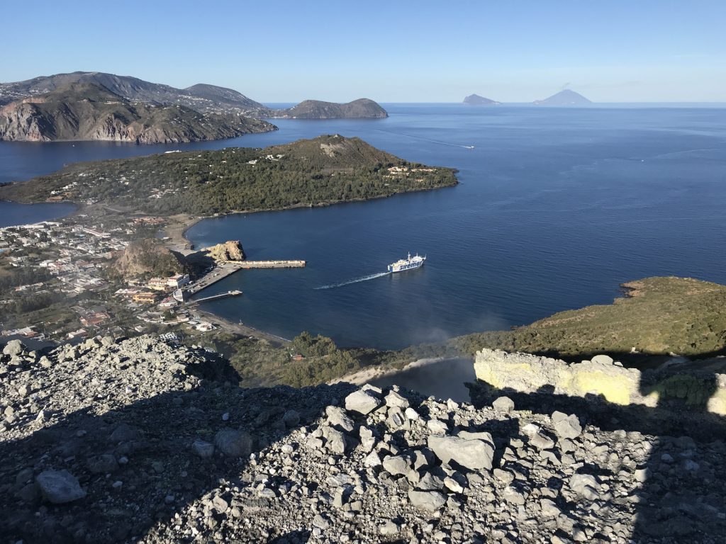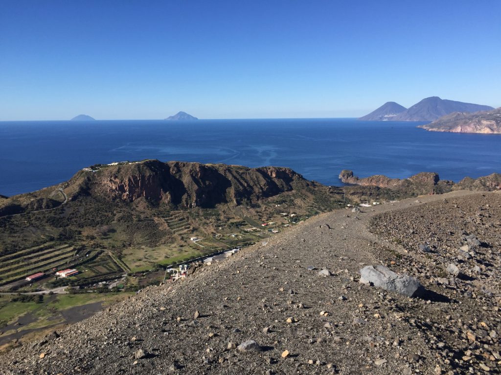 Wir sind mit unserem Teilzeit-Panda hingetuckert (unsere Unterkunft liegt ja „hinter“ dem Krater, in der Bergen; genauer gesagt ist das der uralte erste Krater, der nun ein Gebirge „hinter“ dem neuen Krater bildet) und hatten ab dem ersten Schritt tausend unbeschreibliche Eindrücke: Die unglaubliche Aussicht auf Vulcano und die anderen Liparischen Inseln. Der vielfarbige und rauchende Krater „Grand Cratere“ ist ein Erlebnis: unten geht es über schwarzen Lava Sand. Der ist dann irgendwie abgerutscht und gibt eine Lehm-Schicht frei, die sehr stark erodiert: Das Wasser gräbt Canyons hinein! Es hat scheinbar einmal eine Strasse zum Kraterrand gegeben (für den Mineralien-Abbau vielleicht?), die hat der Vulkan aber schon erfolgreich „bearbeitet“ 😀