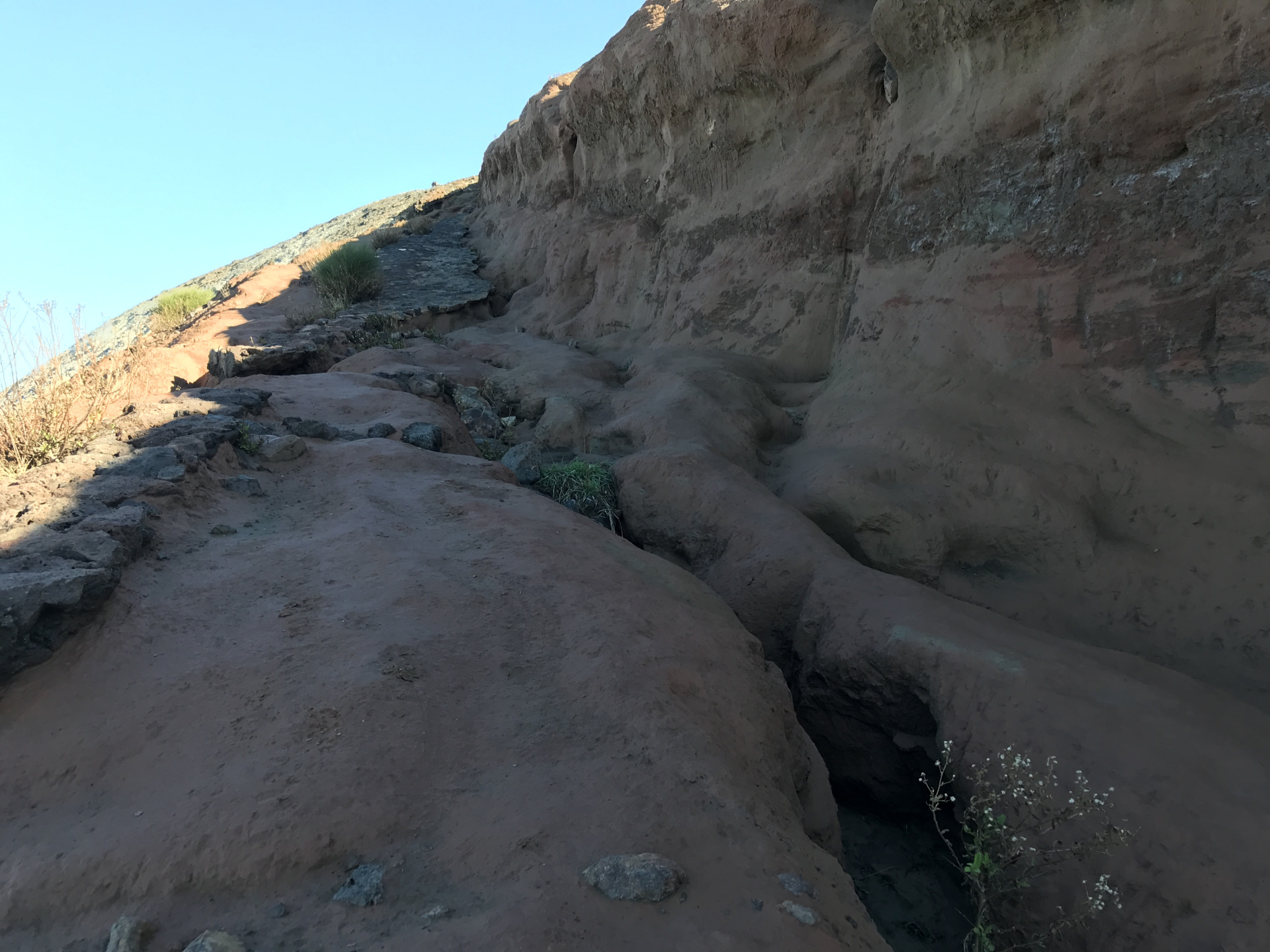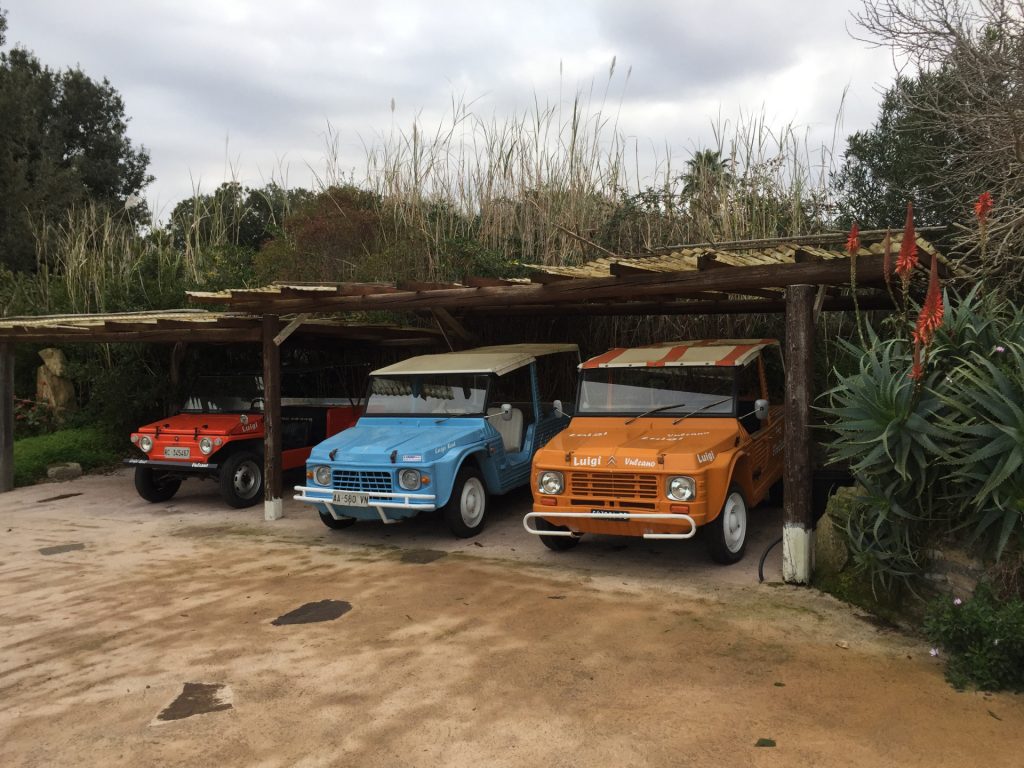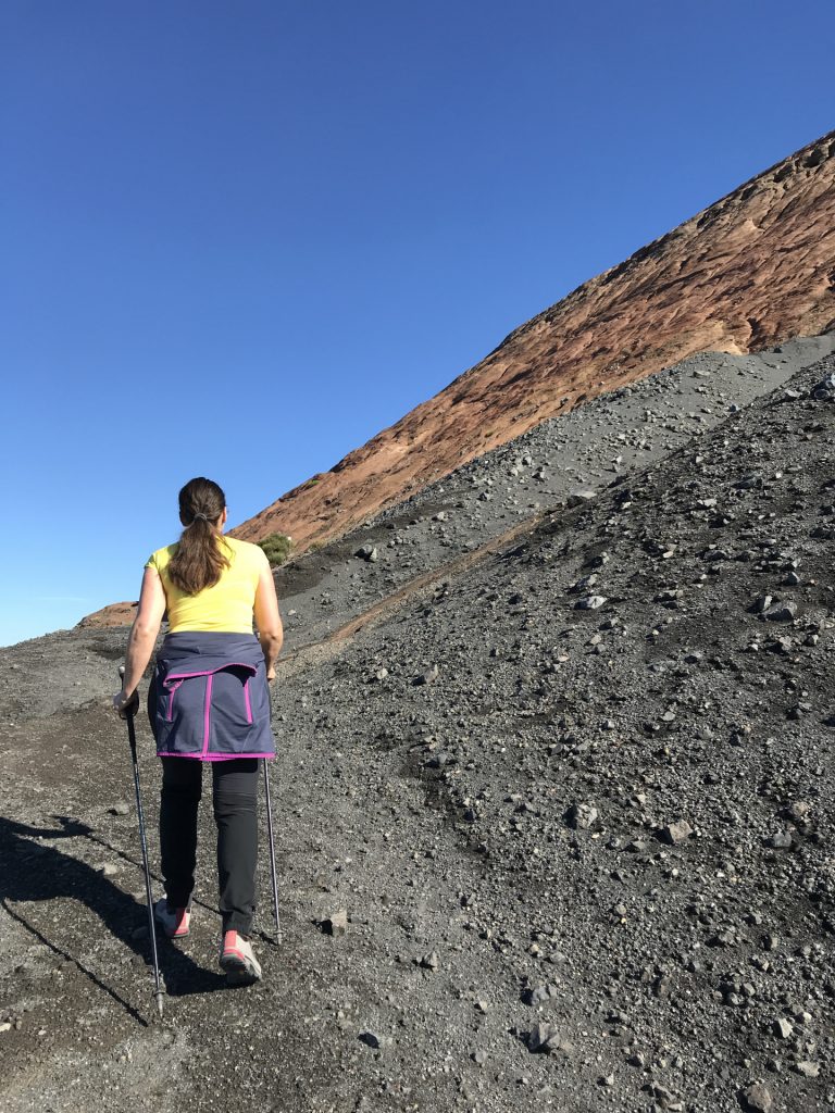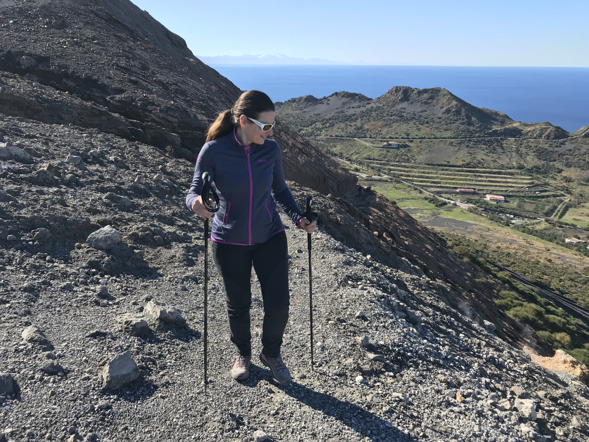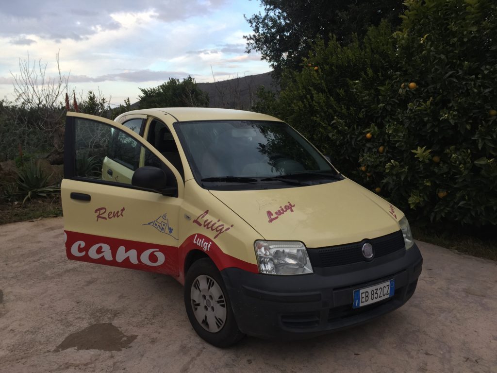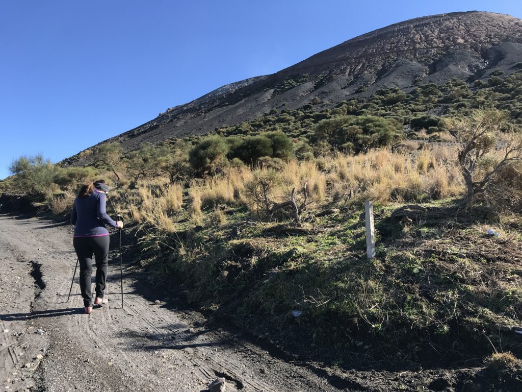 Wir sind mit unserem Teilzeit-Panda hingetuckert (unsere Unterkunft liegt ja „hinter“ dem Krater, in der Bergen; genauer gesagt ist das der uralte erste Krater, der nun ein Gebirge „hinter“ dem neuen Krater bildet) und hatten ab dem ersten Schritt tausend unbeschreibliche Eindrücke: Die unglaubliche Aussicht auf Vulcano und die anderen Liparischen Inseln. Der vielfarbige und rauchende Krater „Grand Cratere“ ist ein Erlebnis: unten geht es über schwarzen Lava Sand. Der ist dann irgendwie abgerutscht und gibt eine Lehm-Schicht frei, die sehr stark erodiert: Das Wasser gräbt Canyons hinein! Es hat scheinbar einmal eine Strasse zum Kraterrand gegeben (für den Mineralien-Abbau vielleicht?), die hat der Vulkan aber schon erfolgreich „bearbeitet“ 😀