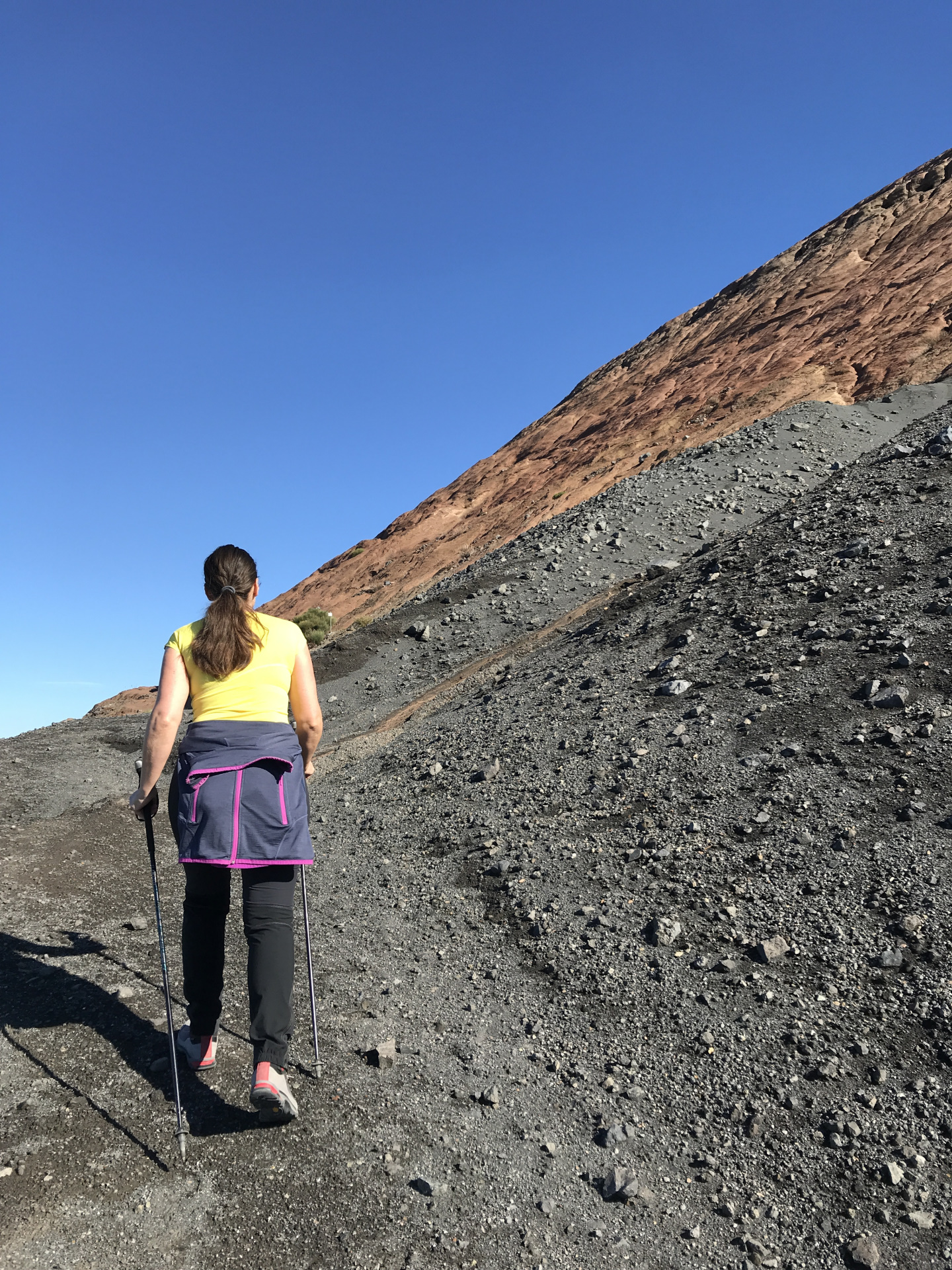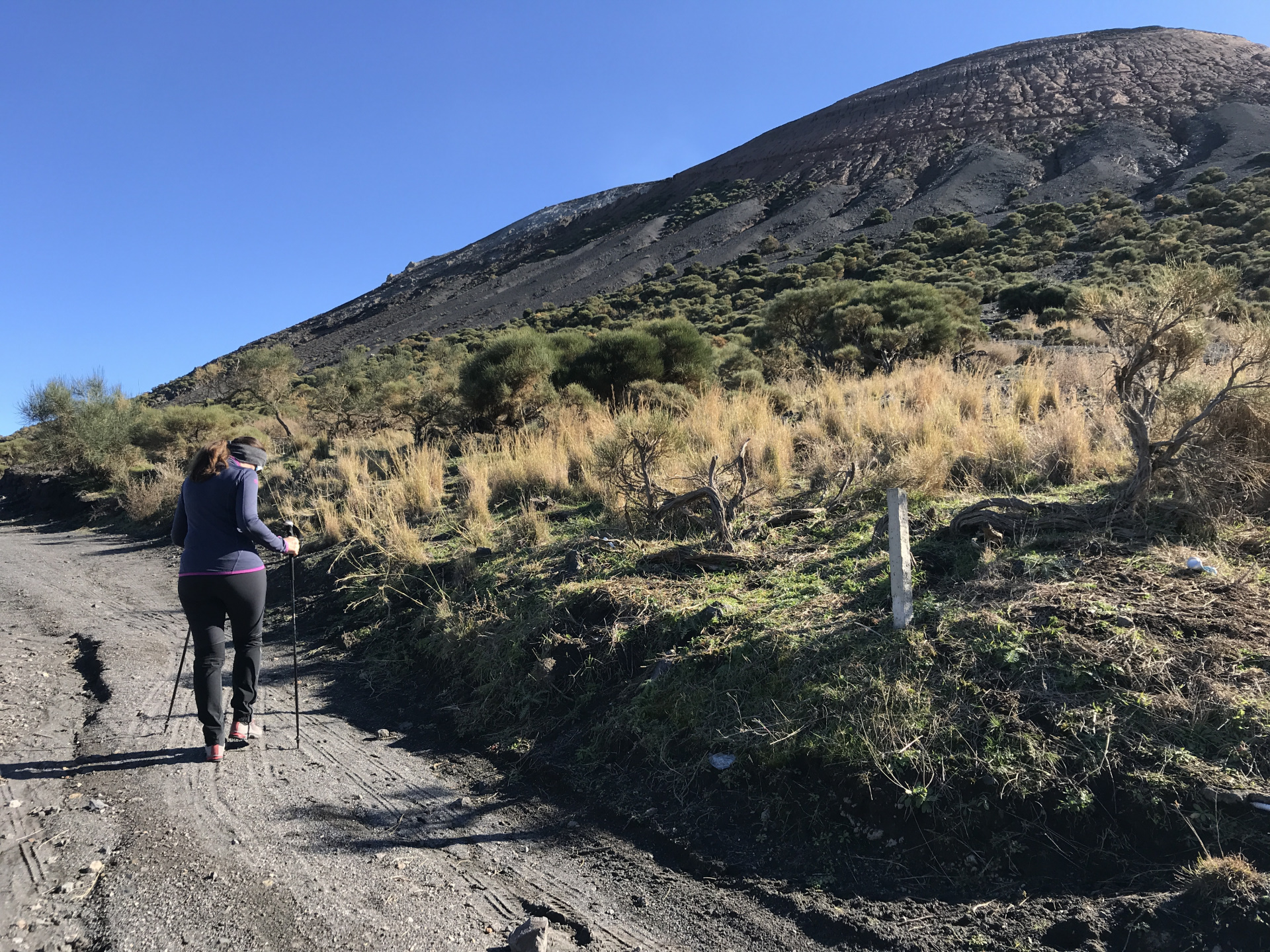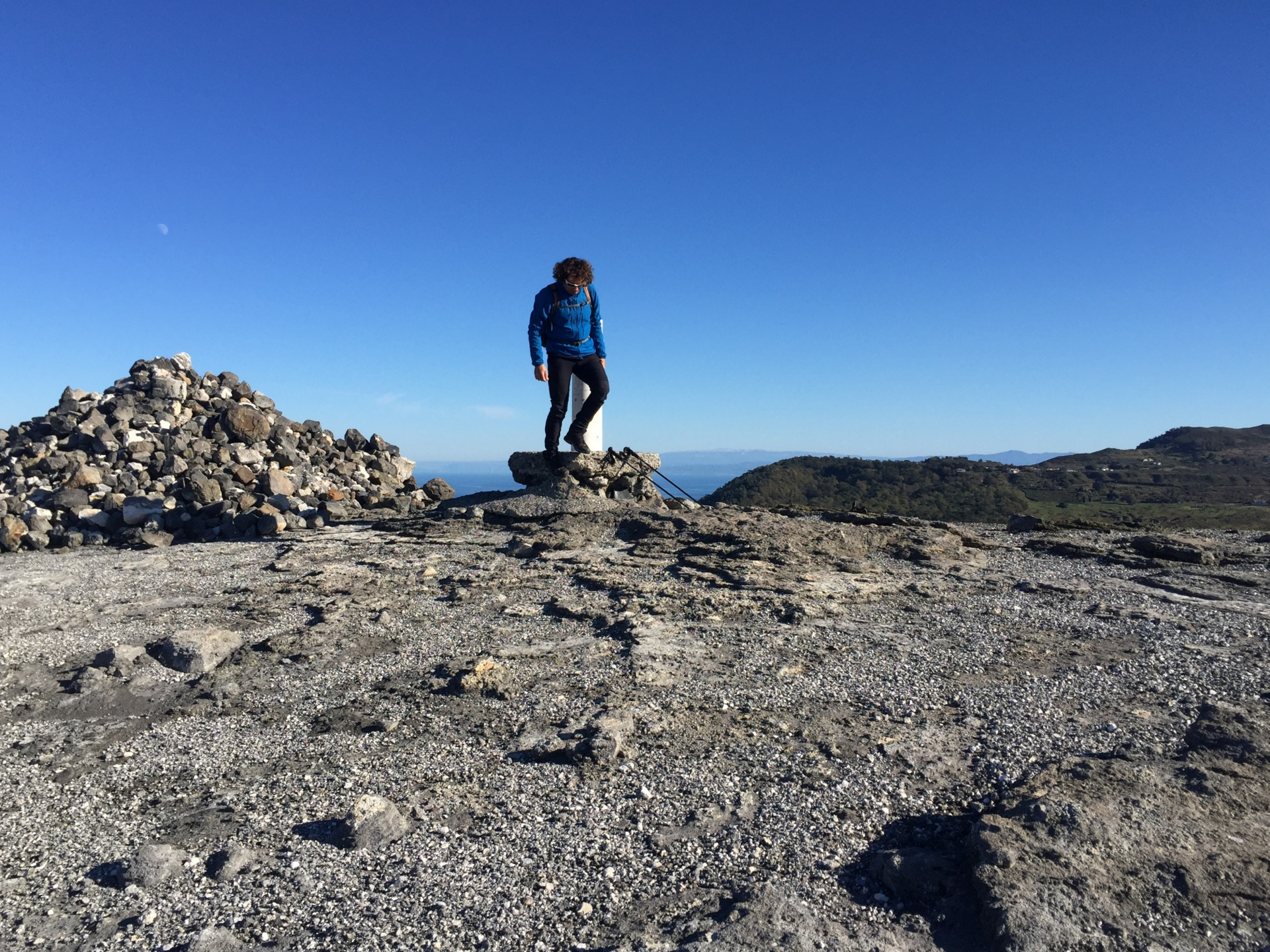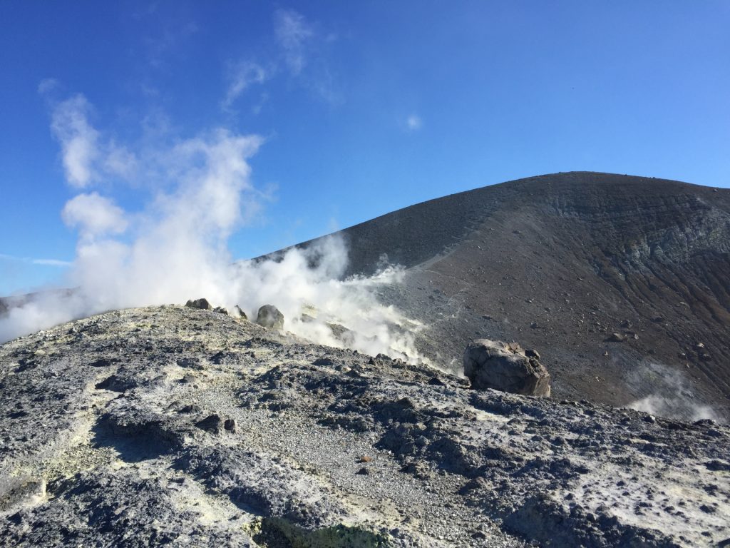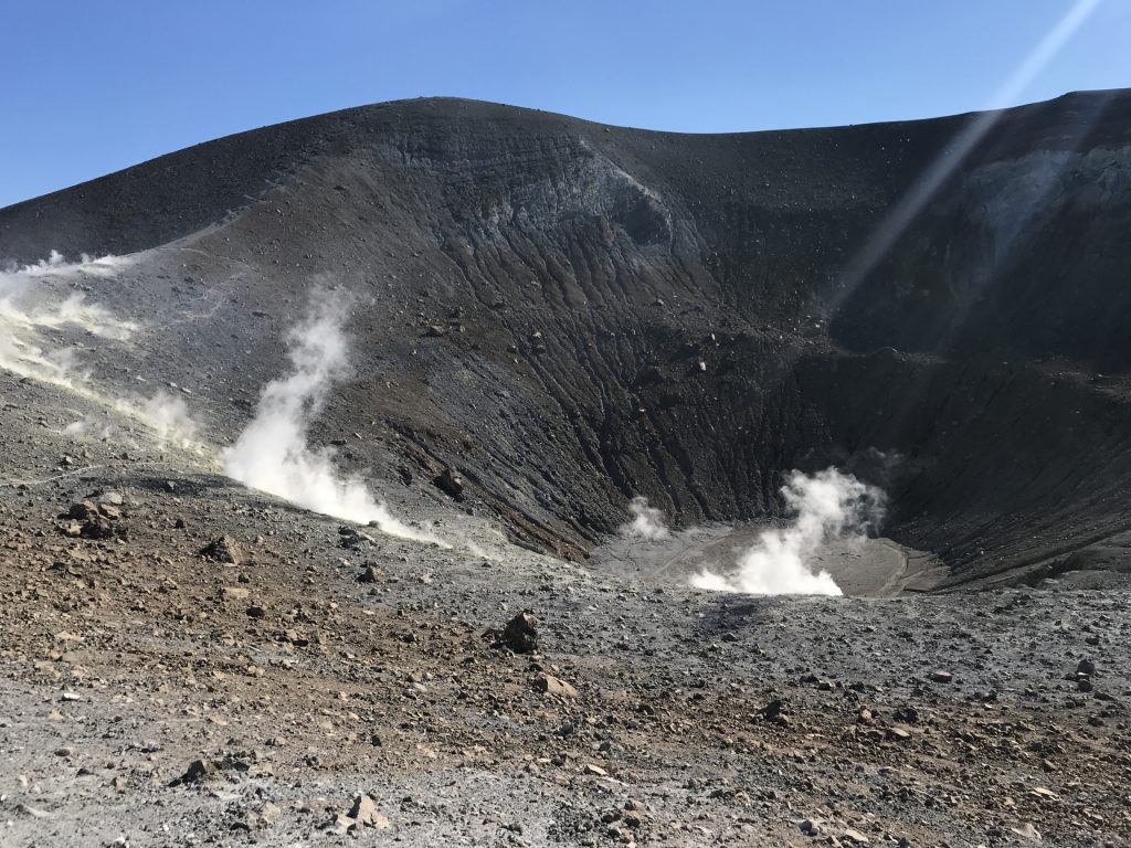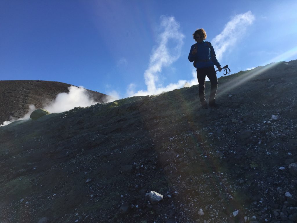 Krater-Gipfel-Tag! Bei strahlendem Wetter und Sicht!!. Und wieder einmal.. ..ALLEINE. Oder.. Fast! Denn drei (junge) Vulkanologen sind mit uns aufgestiegen und haben an der Mess-Station oben gearbeitet. Die Aktivität der Vulkane wird ja laufen überwacht..