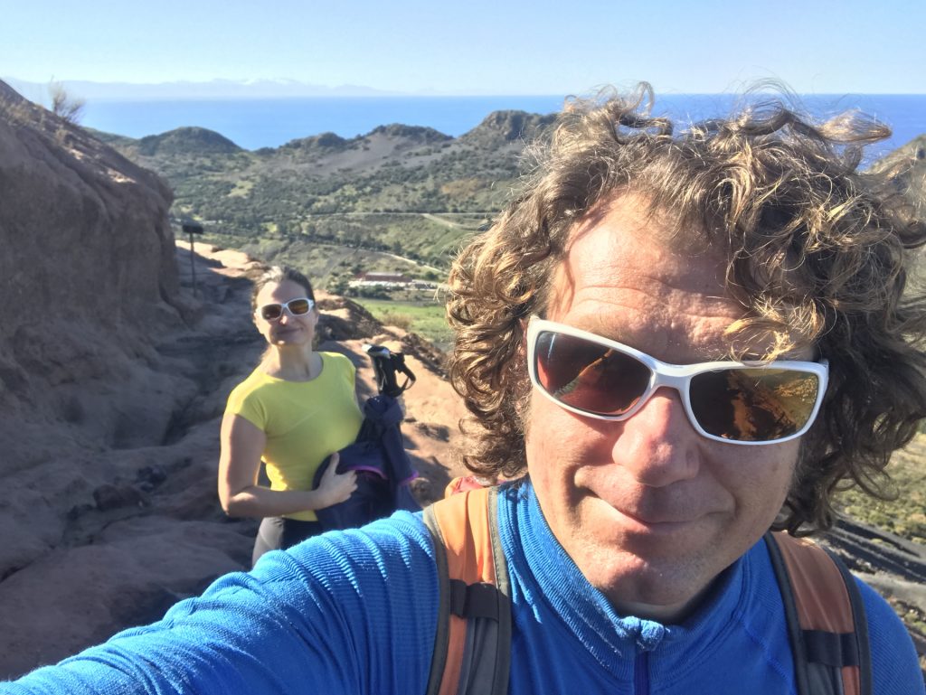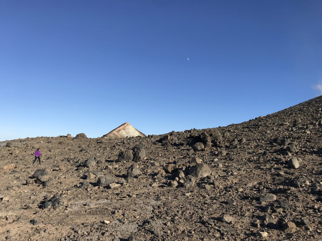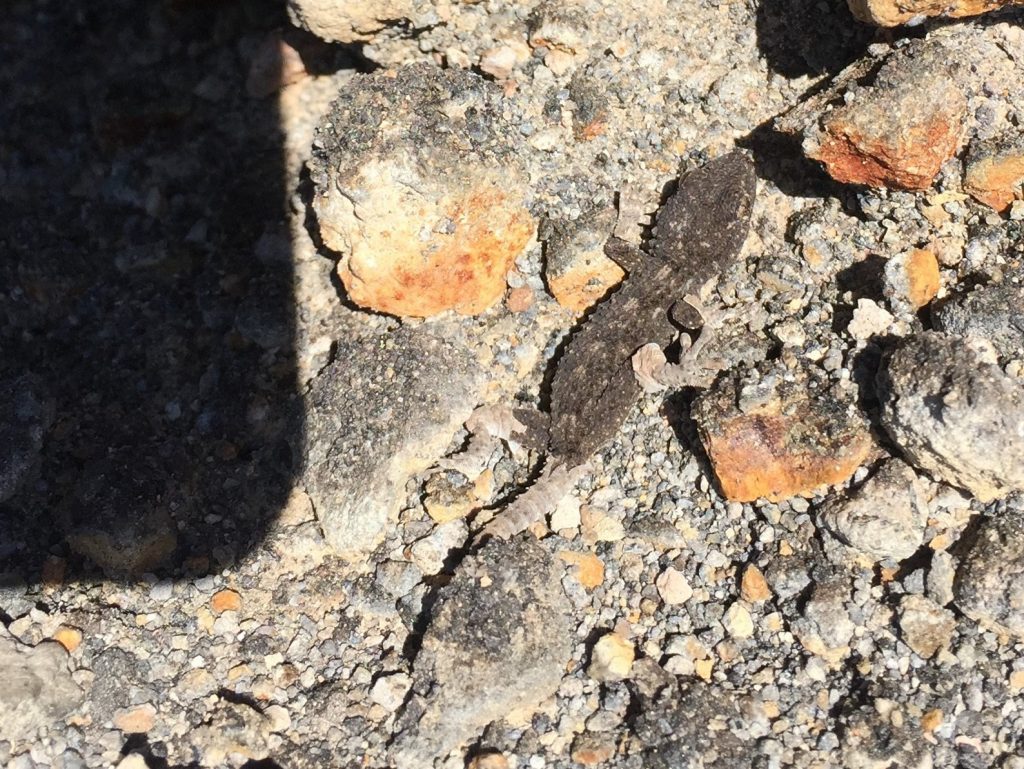 Und zu unserem allergrößten Glück konnte Sandra noch (zufällig) ein endemisches Tier(!) mitten in der Mondlandschaft am Kraterrand entdecken: Einen Gecko!! Er war sehr klein und total verrückt (wovon lebt der eigentlich?): Er ist komisch rumgehüpft, deswegen habe ich ihn überhaupt entdeckt. Dann wollte ich ihn Alex zeigen, und habe mit meinem Brillenbügel (vorsichtig!) drauf gezeigt, weil das Ding ja nur ca. 5 cm groß und mega-gut getarnt war! Hatte also Lava-Farbe (und hat sich wohl gerade gehäutet). Da fängt das Tier voll zum quietschen an! Habe mich auch sehr erschrocken (er wohl auch) und gelernt, dass Geckos (laut!) quietschen können. Bisher wusste ich nur, dass sie schmatzen können…