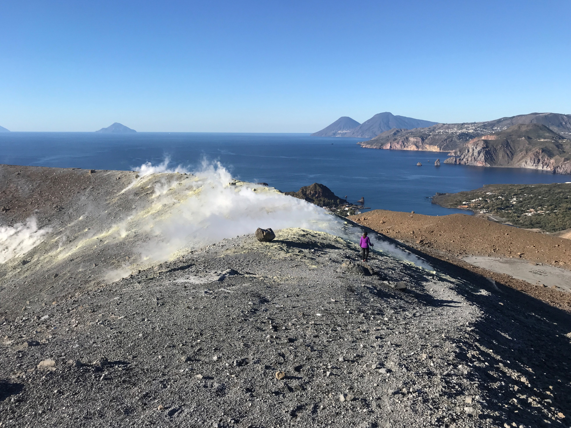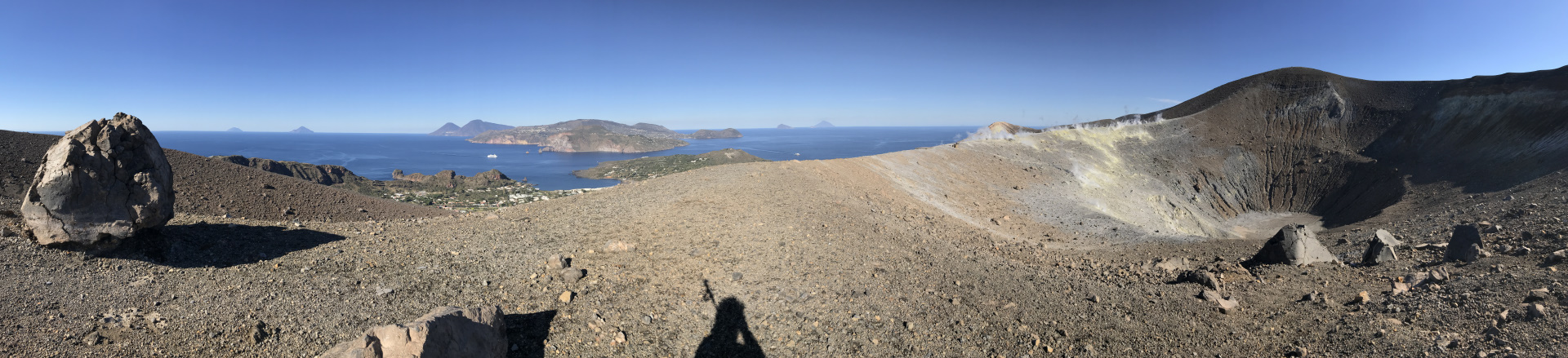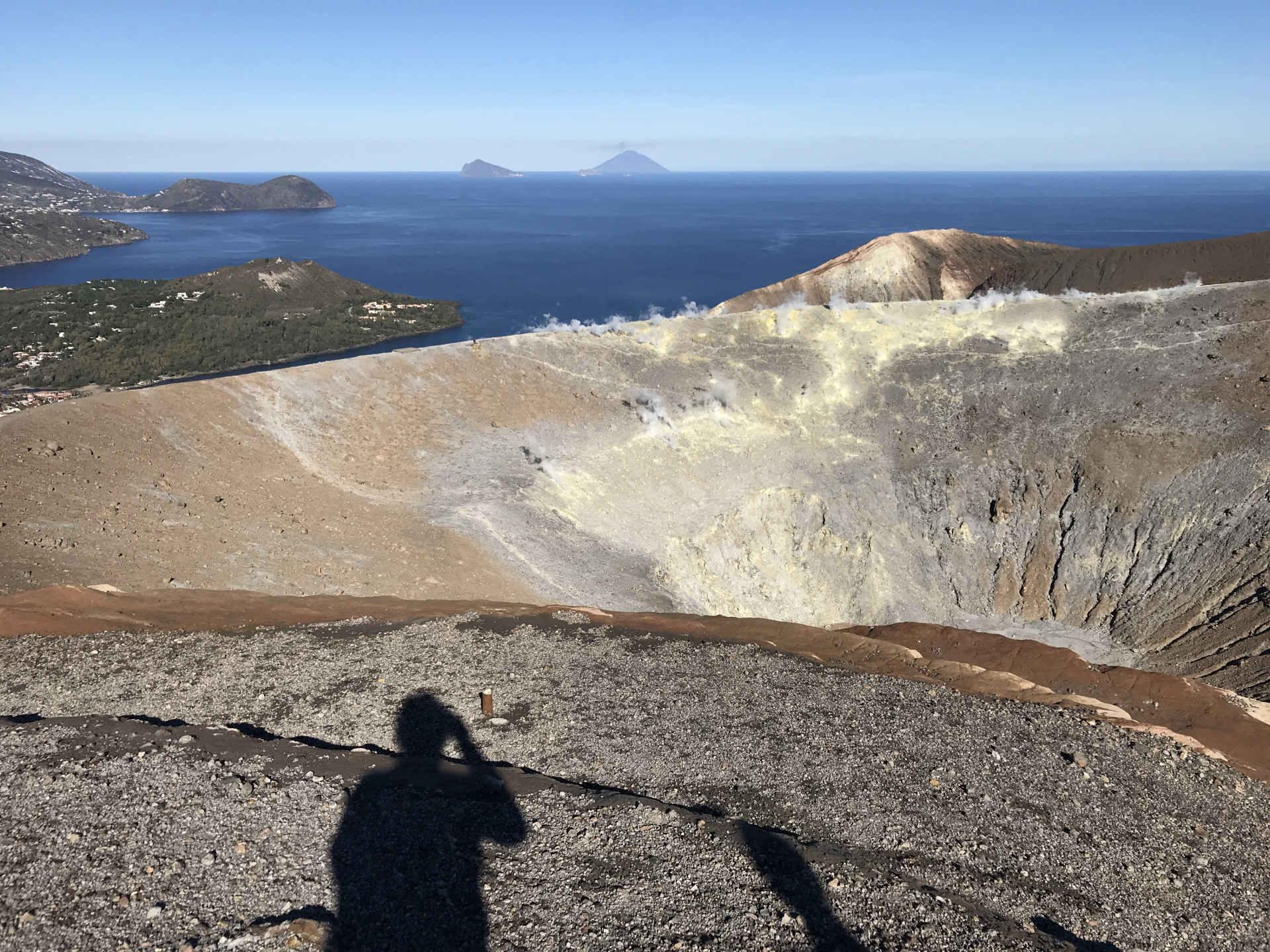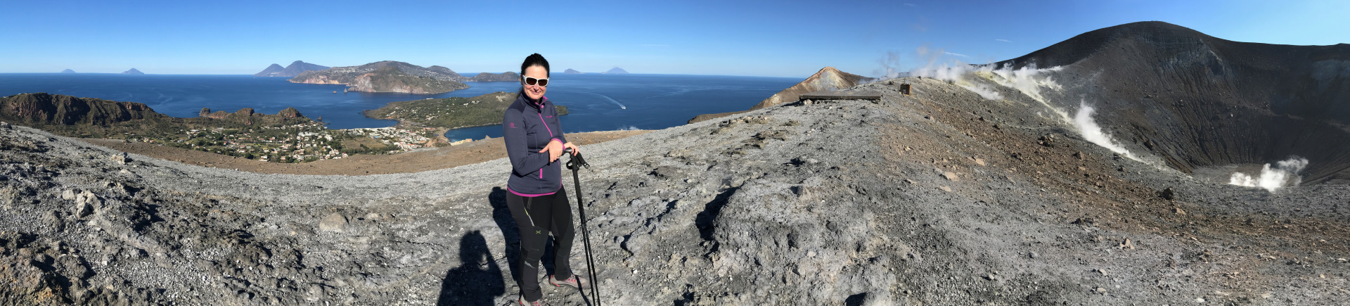 Unglaublich auch: am Krater-Gipfel hatten wir Aussicht auf drei(!) aktive Vulkane: Vulcano direkt vor uns, Stromboli mit Rauchfahne am Horizont und hinter uns: Kaiser Ätna, mit drei Rauch-Schloten!! Wo kann man denn so was sehen?!? Man wird fast verrückt bei der Aussicht. Und, obwohl wir beide doch schon viel unterwegs waren: So etwas haben wir beide noch nicht gehabt…