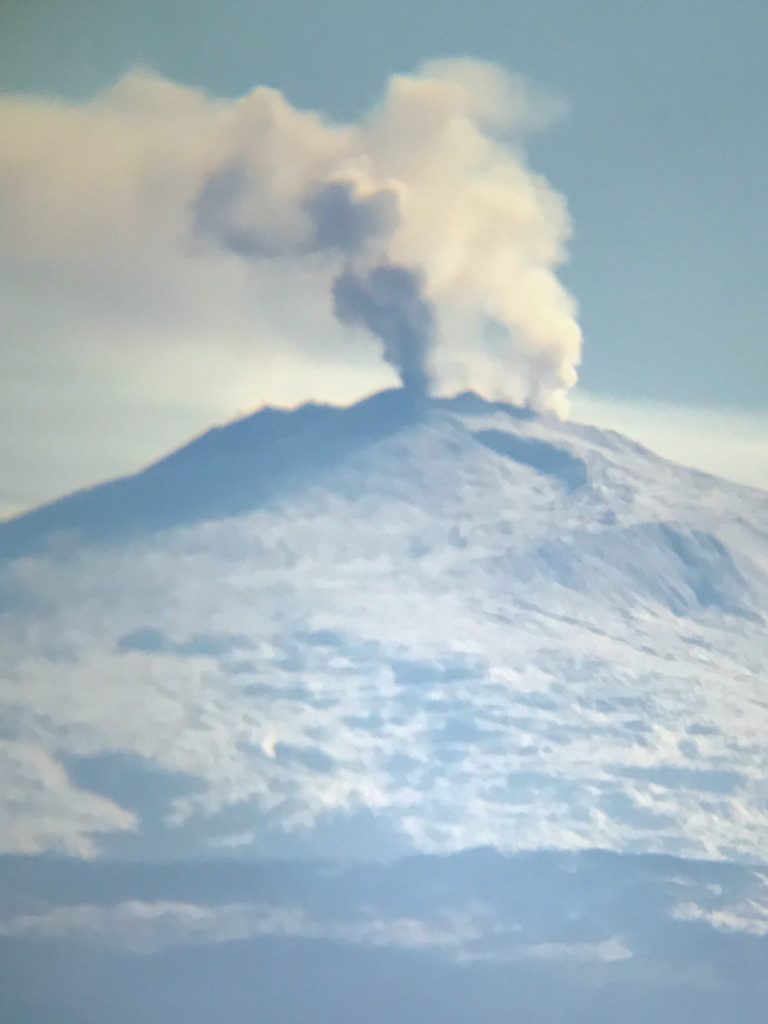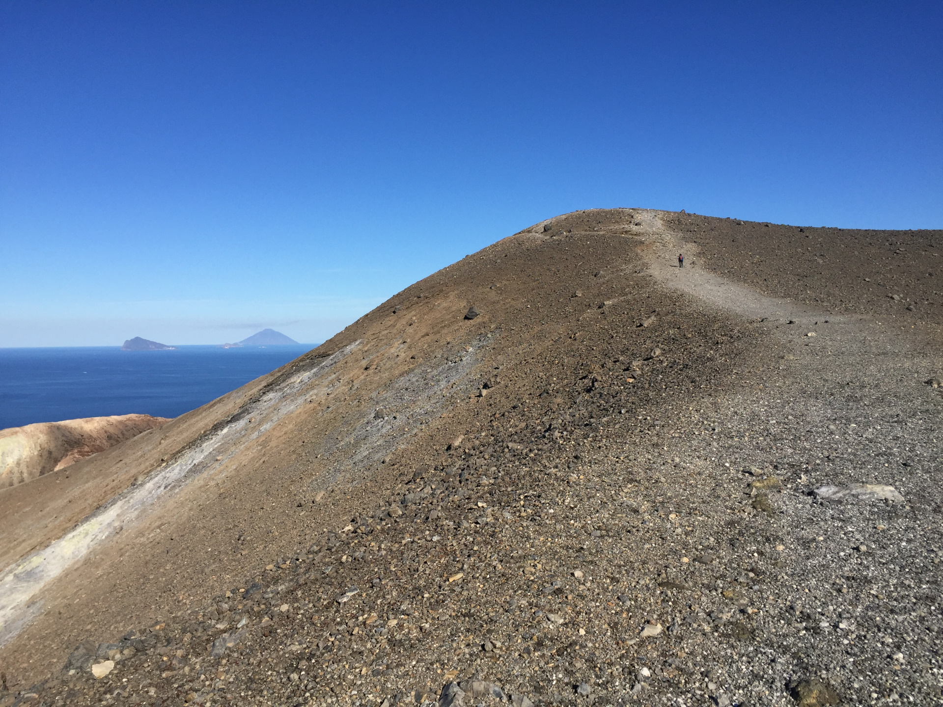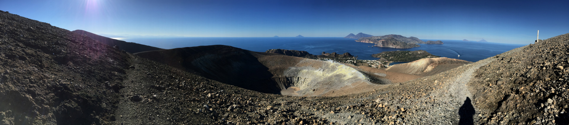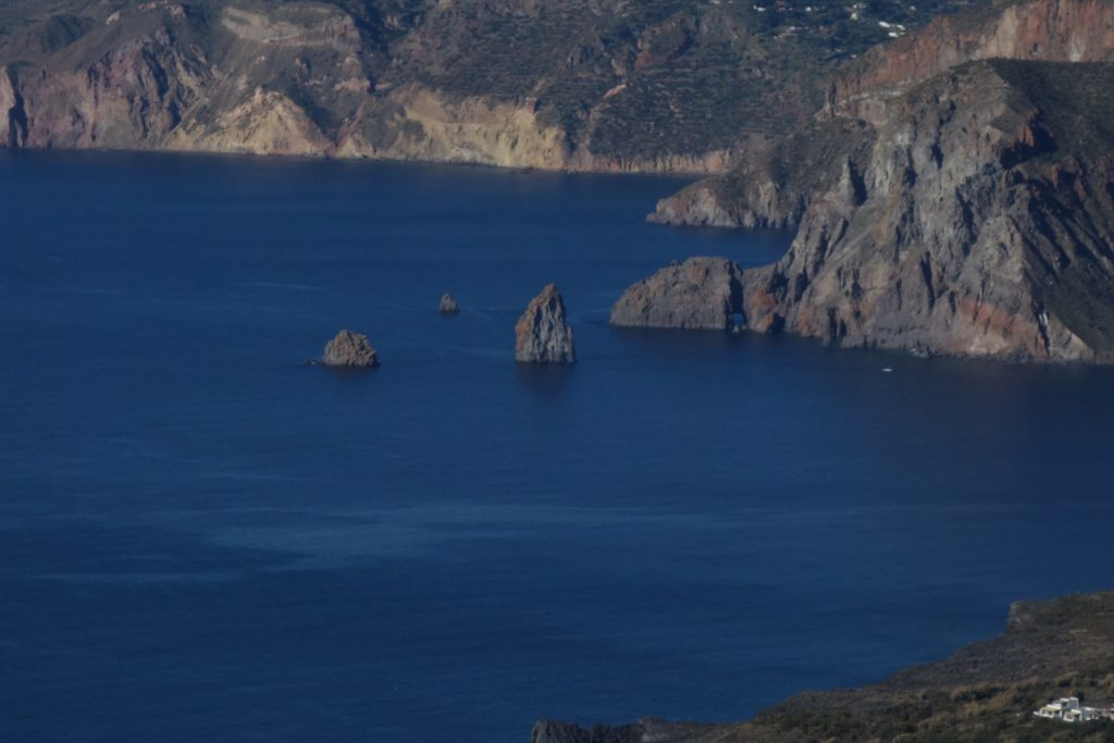 Unglaublich auch: am Krater-Gipfel hatten wir Aussicht auf drei(!) aktive Vulkane: Vulcano direkt vor uns, Stromboli mit Rauchfahne am Horizont und hinter uns: Kaiser Ätna, mit drei Rauch-Schloten!! Wo kann man denn so was sehen?!? Man wird fast verrückt bei der Aussicht. Und, obwohl wir beide doch schon viel unterwegs waren: So etwas haben wir beide noch nicht gehabt…