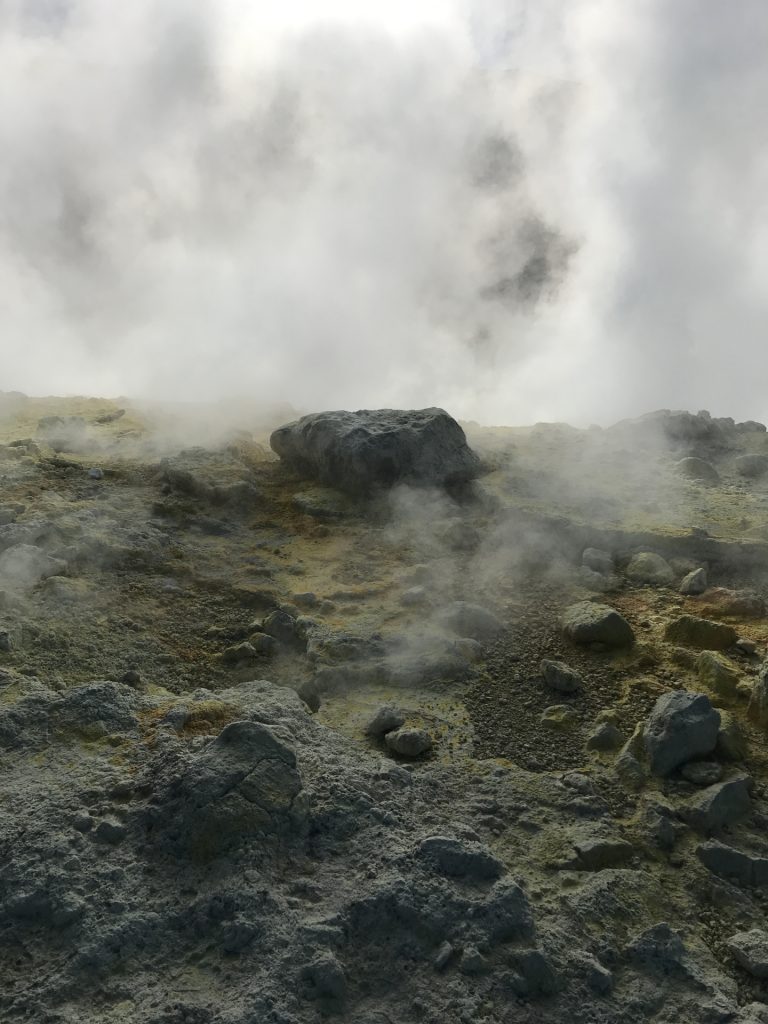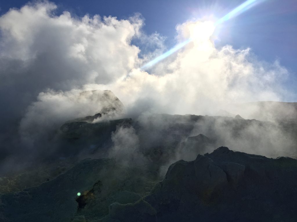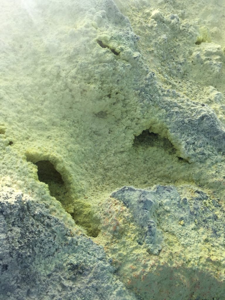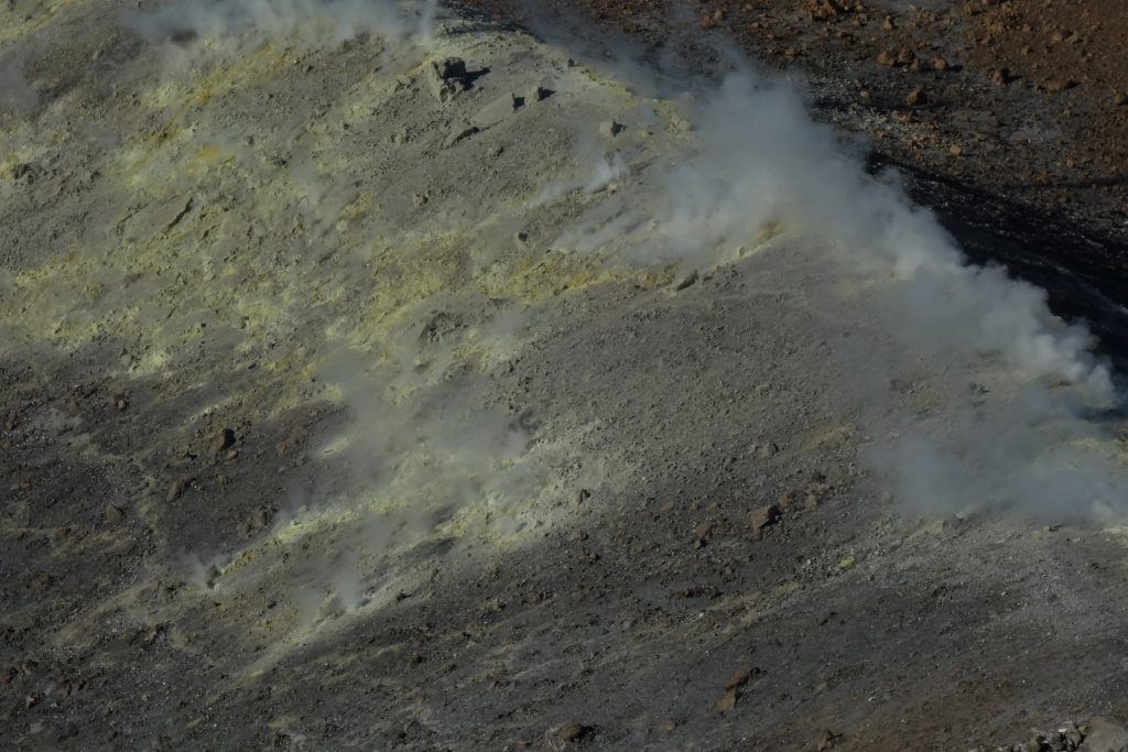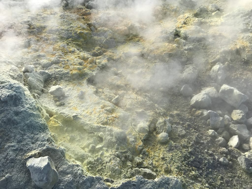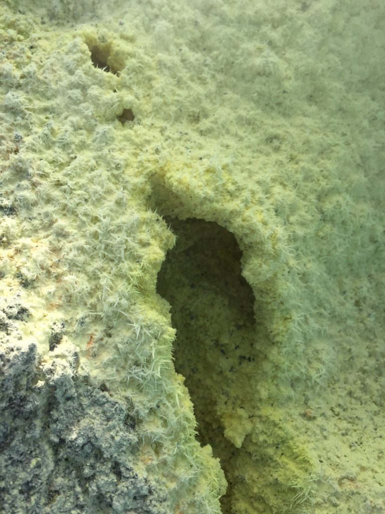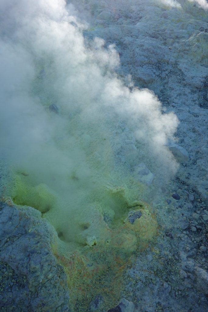 Aus unserem Rückweg konnten wir (dank günstiger Windrichtung) die Schwefel-Auslässe intensivst untersuchen: Unglaublich, was sich das tut. Und die neon-gelben Spitzen Schwefel-Kristalle: unfassbar. Wir haben gehört, dass der Schwefel in alles Löcher frisst. Und ein einziger Waschlappen aus der Schwefel-Fango-Quelle eine ganze Waschmaschinen-Ladung verstinken kann! 😀