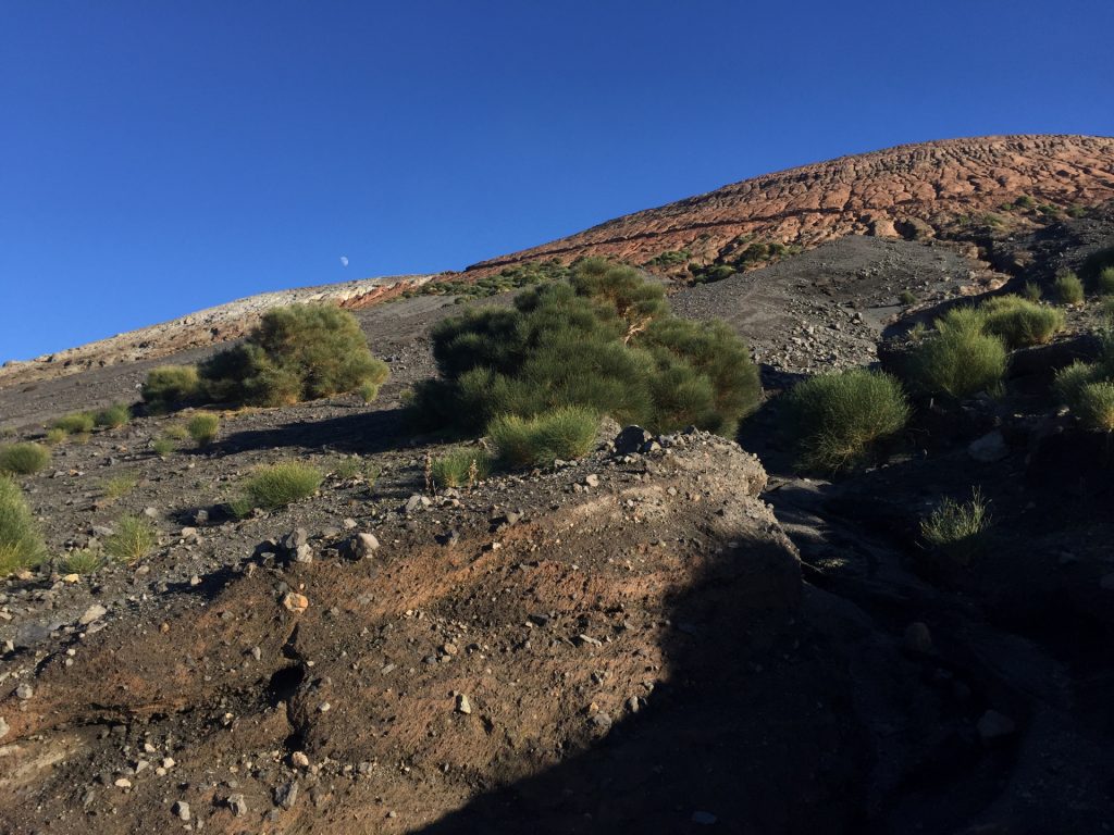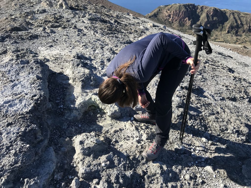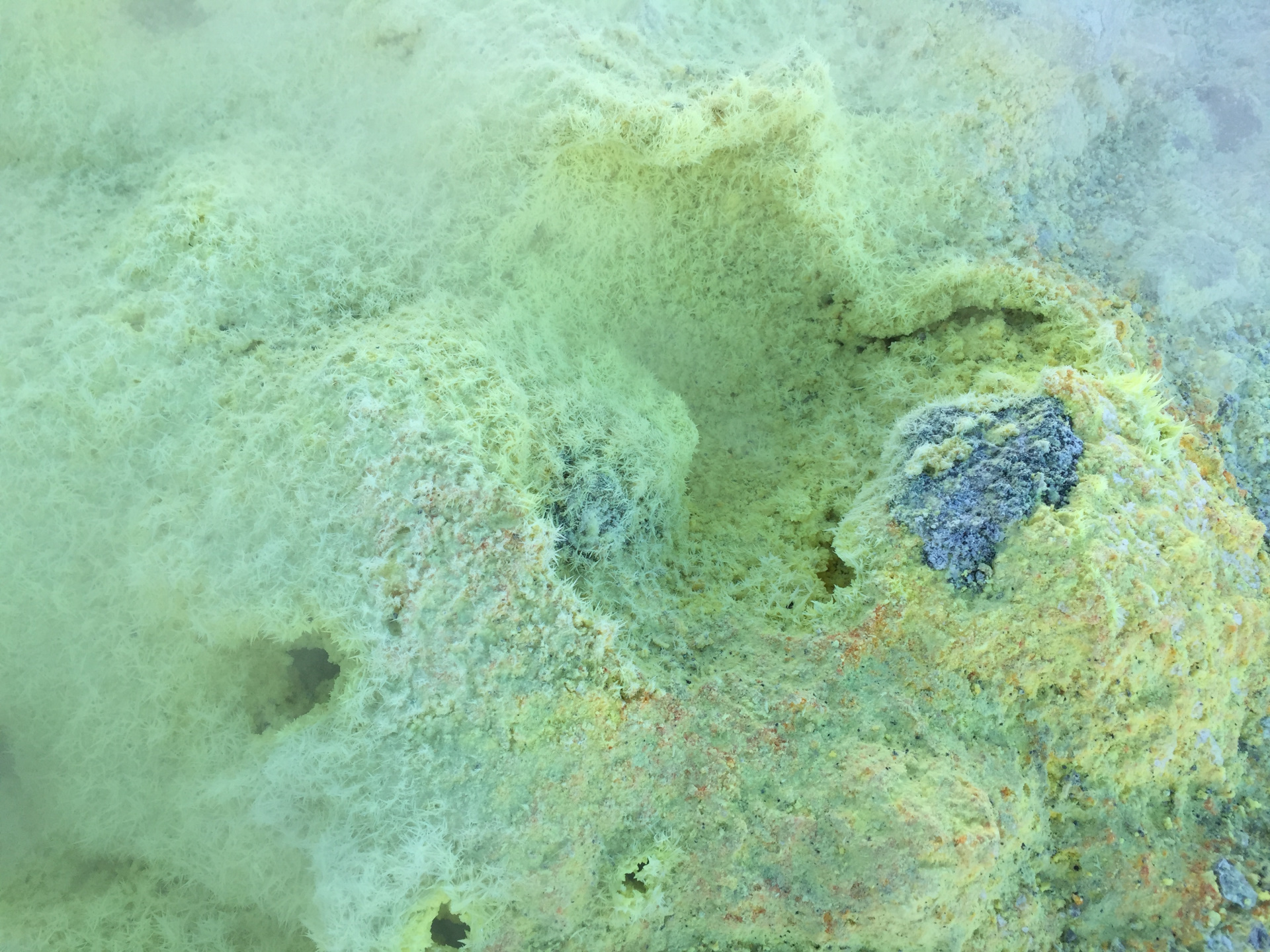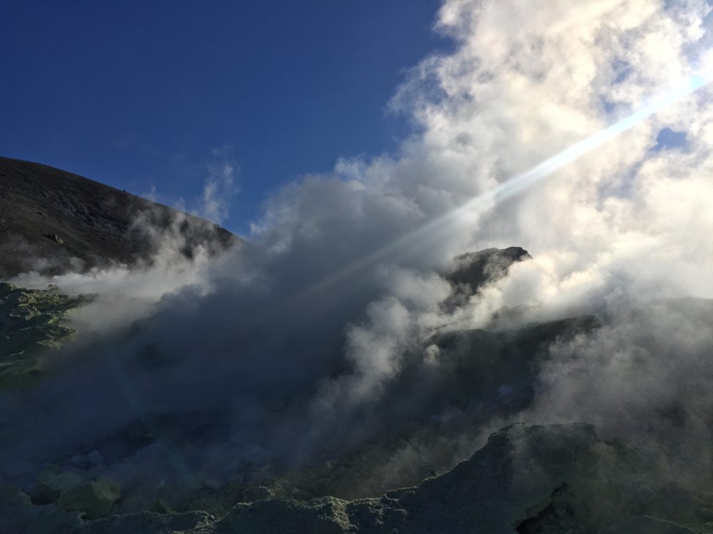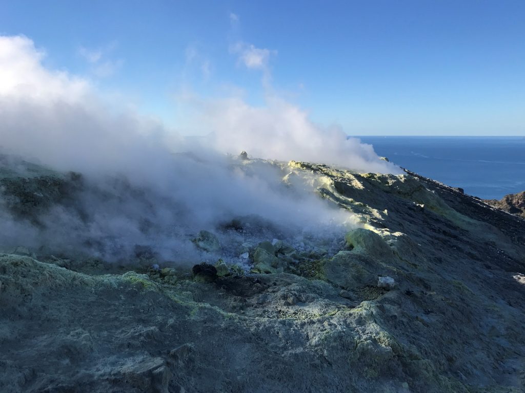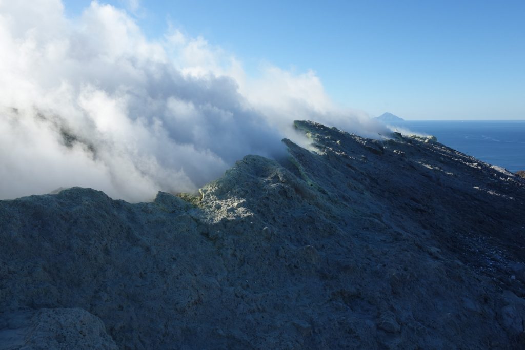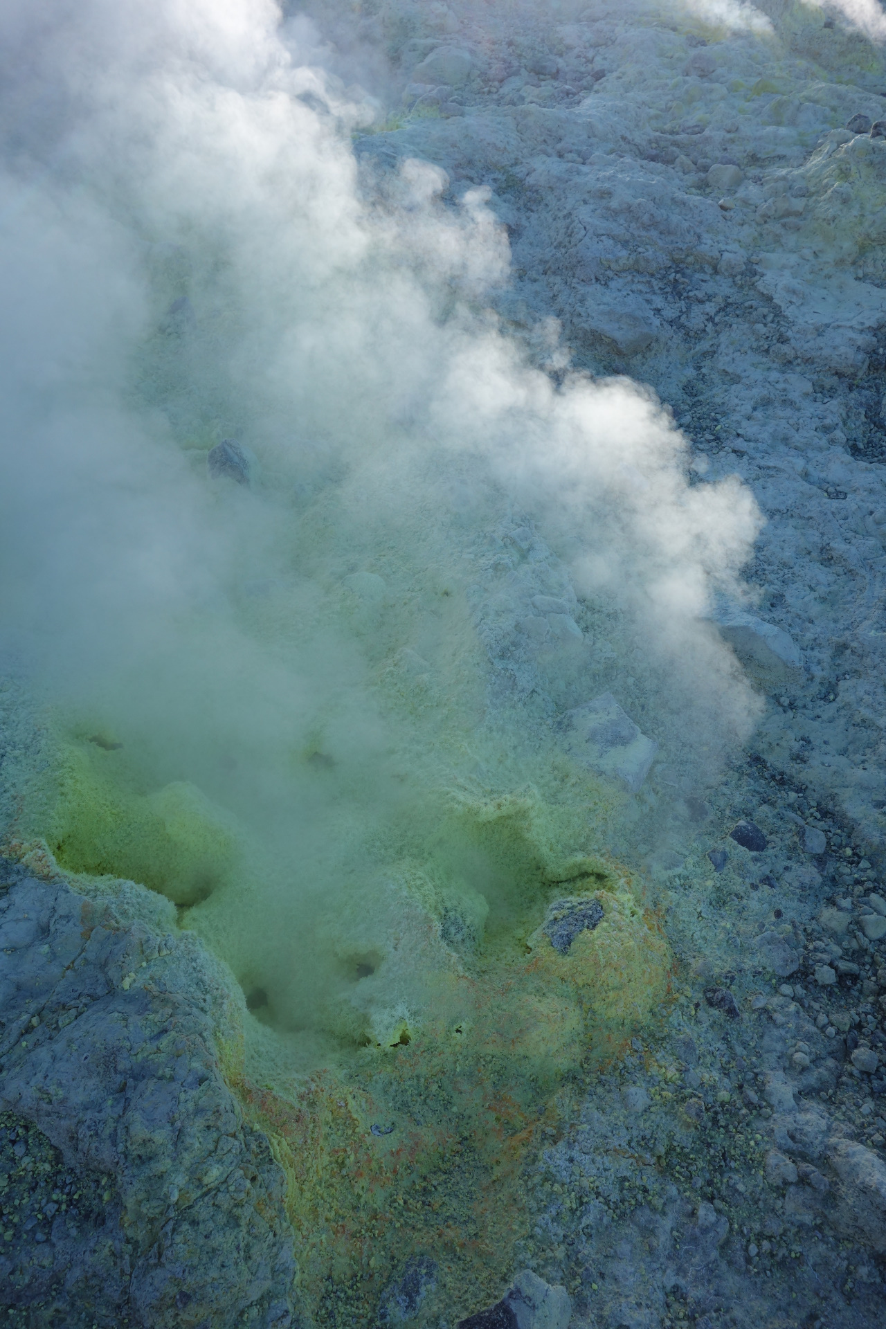 Aus unserem Rückweg konnten wir (dank günstiger Windrichtung) die Schwefel-Auslässe intensivst untersuchen: Unglaublich, was sich das tut. Und die neon-gelben Spitzen Schwefel-Kristalle: unfassbar. Wir haben gehört, dass der Schwefel in alles Löcher frisst. Und ein einziger Waschlappen aus der Schwefel-Fango-Quelle eine ganze Waschmaschinen-Ladung verstinken kann! 😀