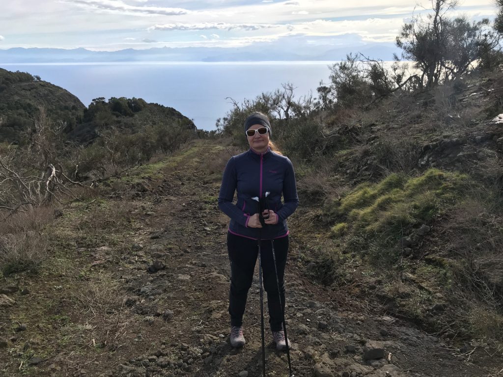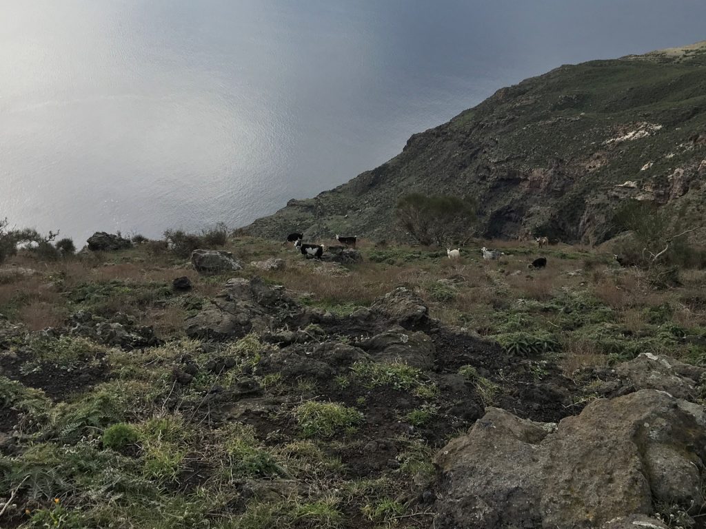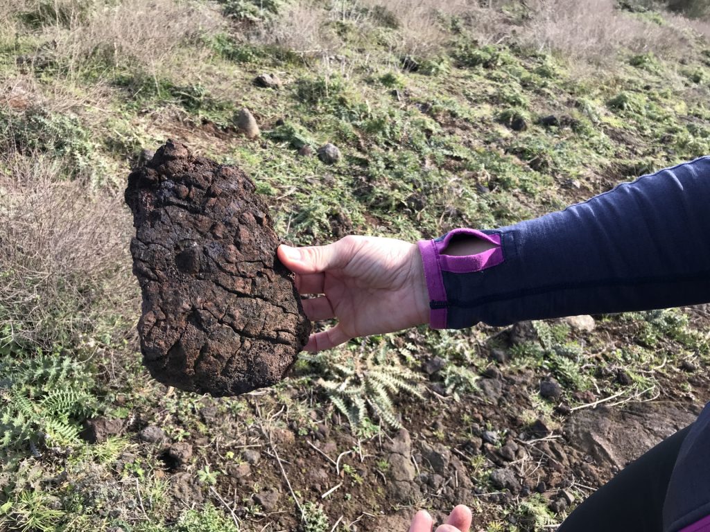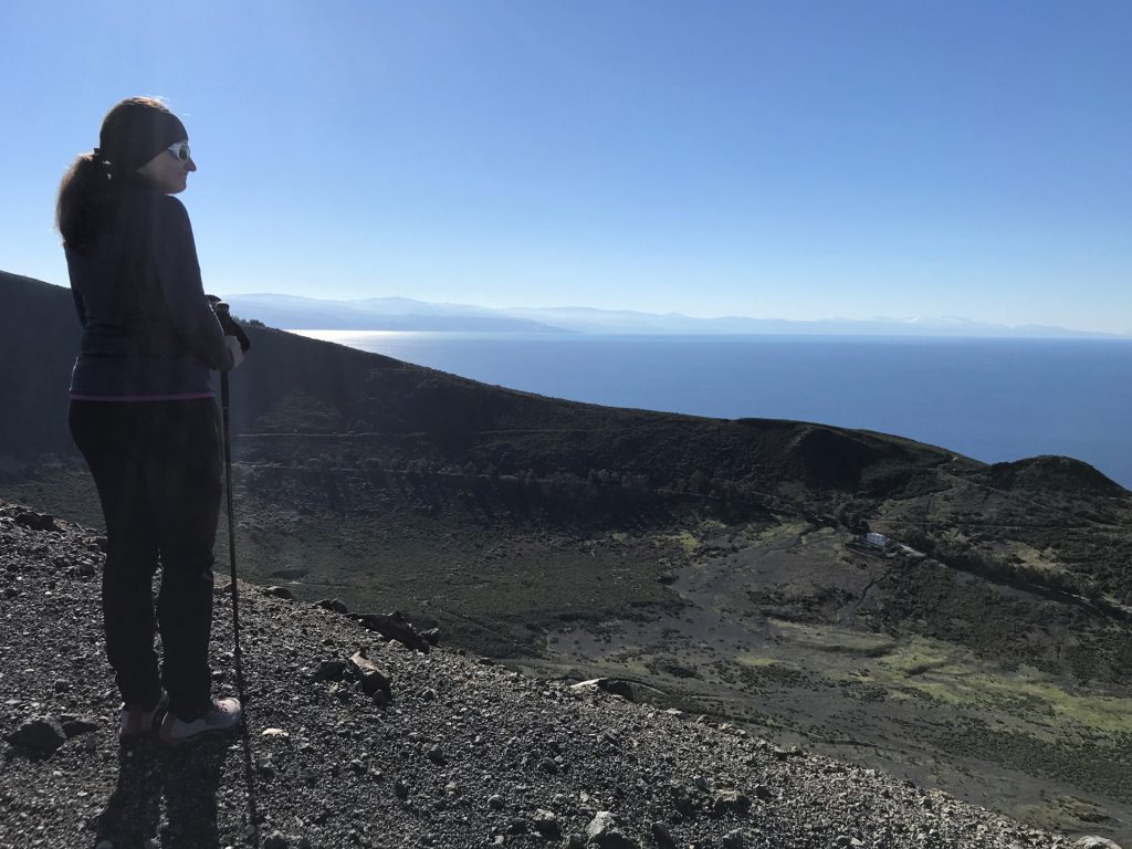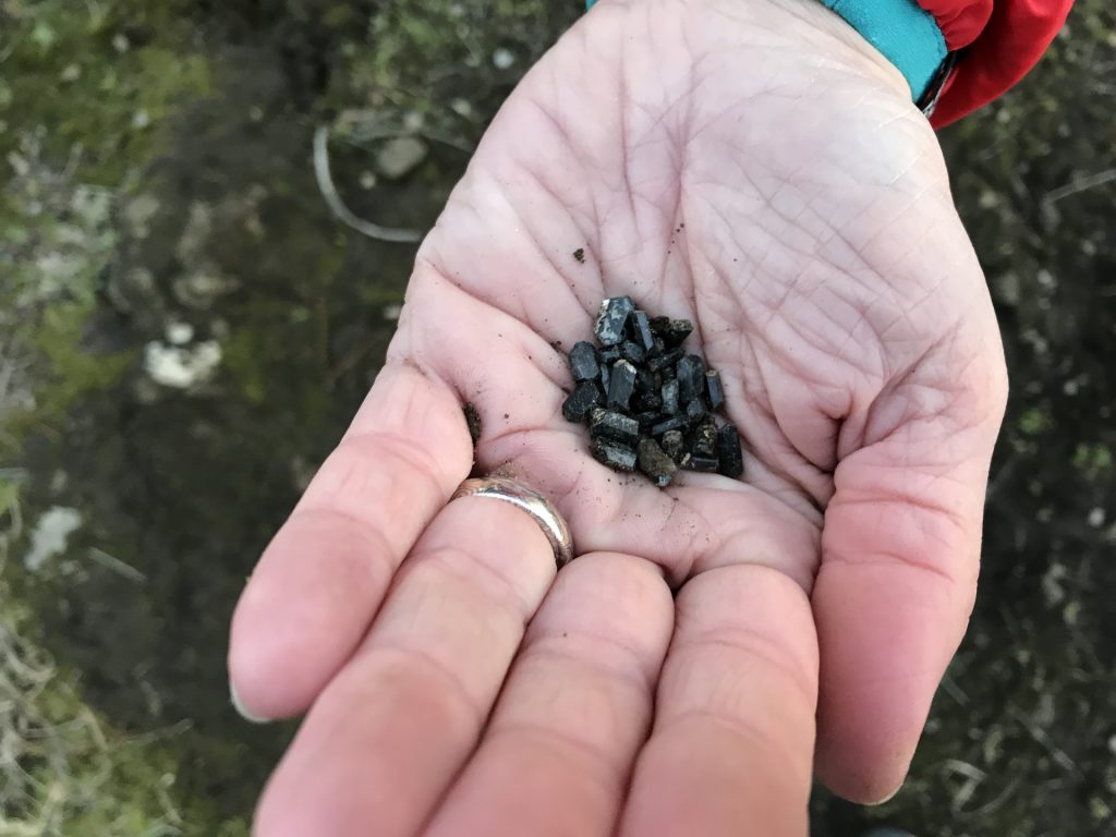 Luigi hat uns dann noch für einen Ausflug (am Abend nach der Krater-Wanderung) einen Geheim-Tipp verraten: Nahe an seinem Haus gibt es eine Stelle mit a) unglaublicher Aussicht und b) kleinen schwarzen Halbedelsteinen. Da musste Sandra natürlich sofort hin!!! 😀 Ich war mir nicht ganz sicher, wonach ich schauen musste, aber Luigi hatte mir die Stelle sehr gut beschrieben. Und als ich mit der Nase fast über dem Boden war, habe ich „etwas“ Besonderes gefunden. Da waren sie, die Kristalle!! Aber.. …sooo klein? Die gibt’s scheinbar nicht in größer.. 😀