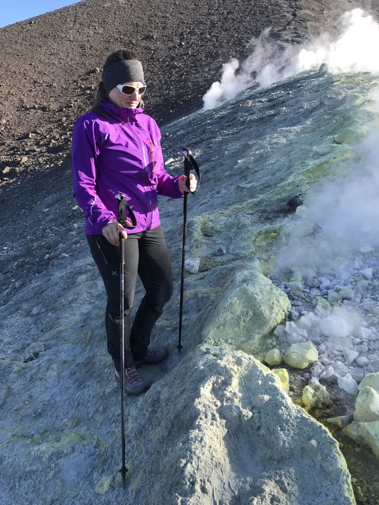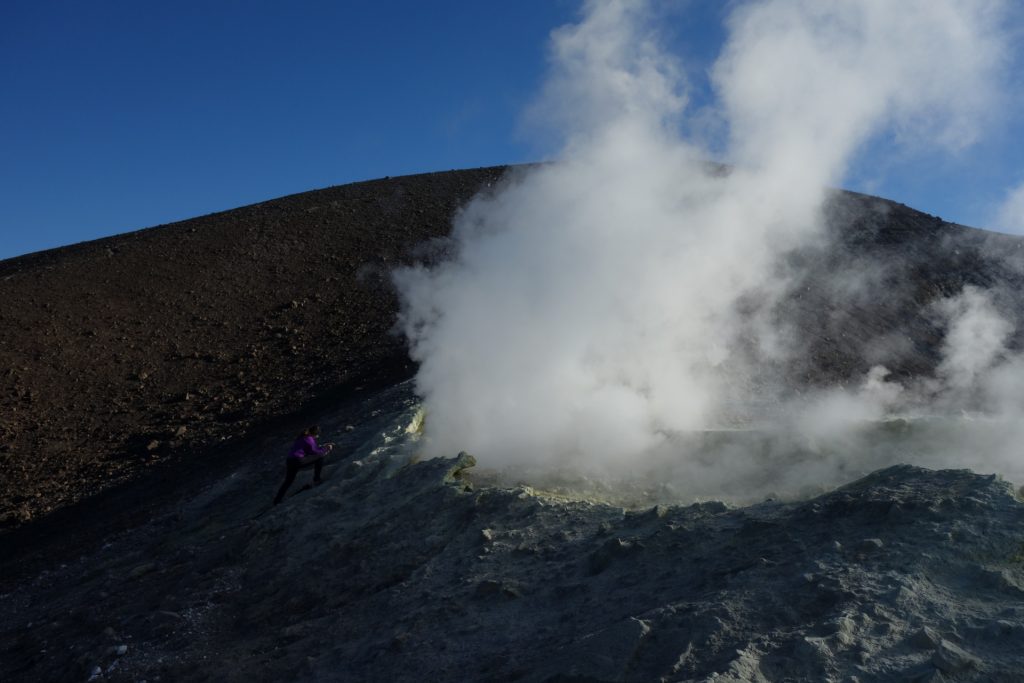 Der Schwefel-Rauch war dann noch eine Sache für sich: Der Wanderweg ging ja mitten durch.. Man konnte den Schwaden gut aus dem Wege gehen, wenn man auf die Windrichtung geachtet hat.. ..die sich aber jederzeitgeändert! Als ich meine ersten Fotos vom Schwefel-Dampf geknipst habe (einen kleinen Fumolen-Auslass), haben sich die großen Schwaden frech von hinten „angeschlichen“ und mich ziemlich eingenebelt: BRENNENDE Augen!! KRATZENDER Hals!! Und das Gefühl, sowieso gleich tot umzufallen! Öchött, schnell weg. Ich denke, lange würde man es in der „Hells-Kitchen“ nicht aushalten.. Etwas zugeschwefelt bin ich dann zu Alex auf die Heli-Plattform zurück. Er hat dort gerade seine Drohne fliegen lassen und man sieht mich am Ende des Videos noch etwas gaga im Film..