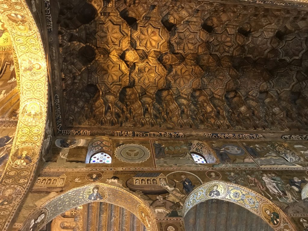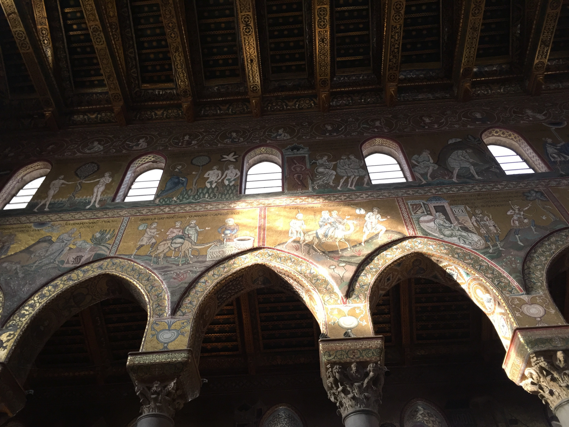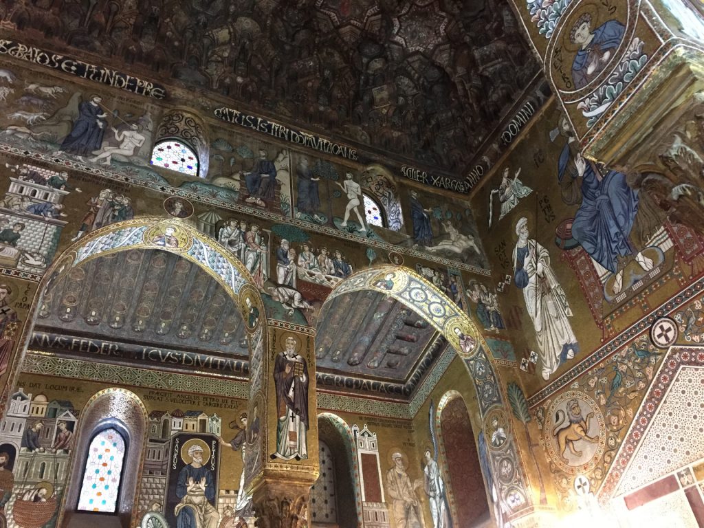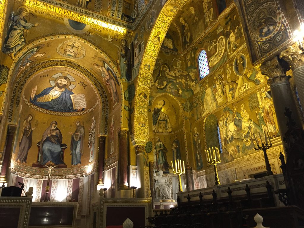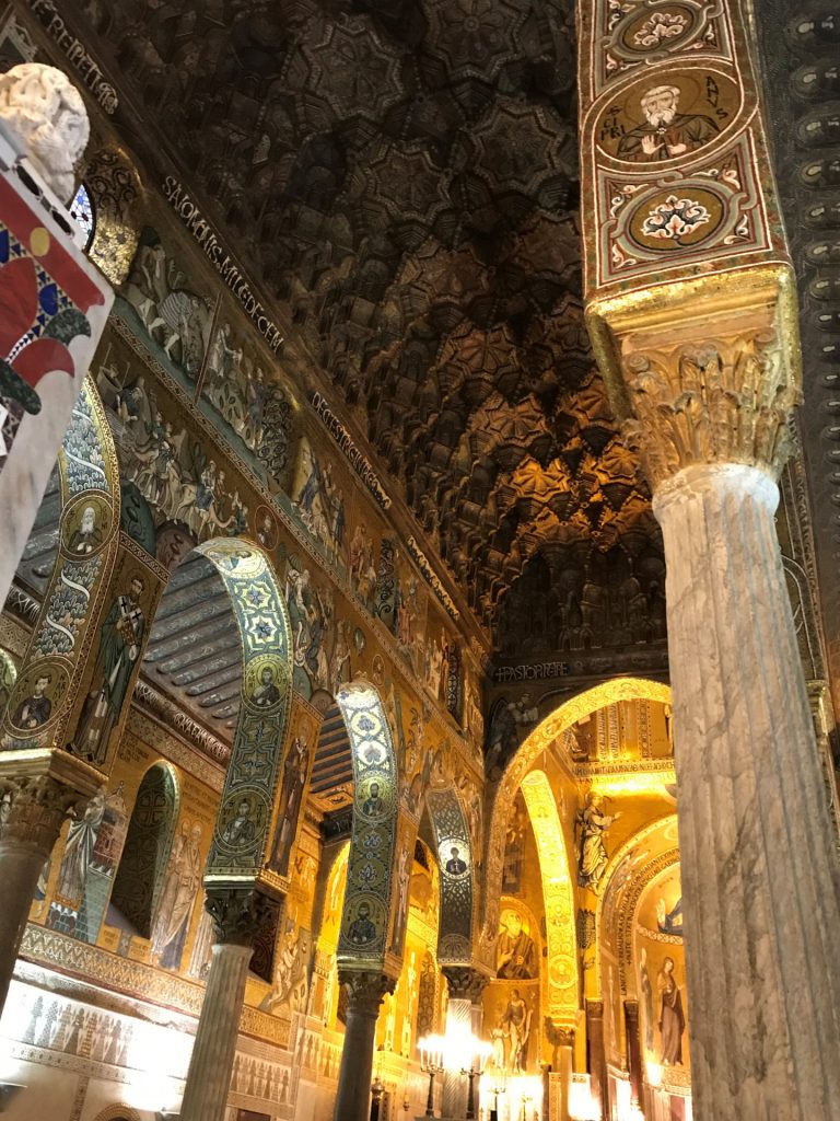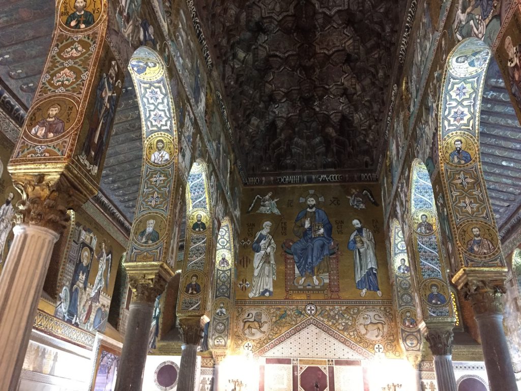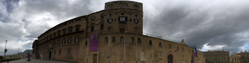 Im Normannenpalast war auch noch eine Ausstellung der Stadtheiligen Rosalia gewidmet, die im Mittelalter die Pest vertrieben haben soll. Sehr alte riesige Ölschinken, aber nett als Kontrast zum Mosaik :-). Der Palast wurde ursprünglich als Sommerresidenz des Emirs gebaut, von den Normannen und die Jahrhunderte danach aber immer wieder massiv umgebaut. Heute gibt es zwei herausragende Sehenswürdigkeiten: Die Kapelle Cappella Palatina, die im arabisch-byzantinisch-normannischen Stil erbaut und reichhaltig ausgeschmückt ist, sowie die königlichen Gemächer. Unter diesen ist der „Sala di Ercole“ (Herkulessaal) besonders, er ist der Sitzungssaal des sizilianischen Parlament und nur zu besichtigen, wenn nicht getagt wird :-). Alles super gut gepflegt und restauriert (es waren gerade drei junge Frauen an am restaurieren eines Sims). Der Normannenpalast beinhaltet eine weltkultur-Besonderheit von unbeschreiblicher Pracht (was sonst :D), die „Cappella Palatina“. Ganz versteckt im Inneren! Der gute und berühmte Normannen-König (der in Sizilien echt super viel und überall hat bauen lassen), hat sie begonnen. So kleine Mosaike brauchen aber ewig und (natürlich) ist er vor der Fertigstellung gestorben. Macht aber nix, dein Nachfolger hat sie noch fertig bekommen! War ja noch kein Italiener.. 😀 Die Bauzeit war seehr lange..