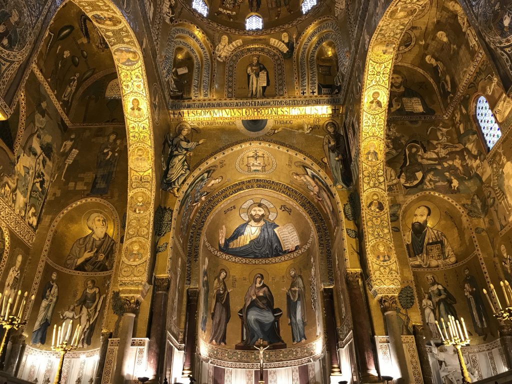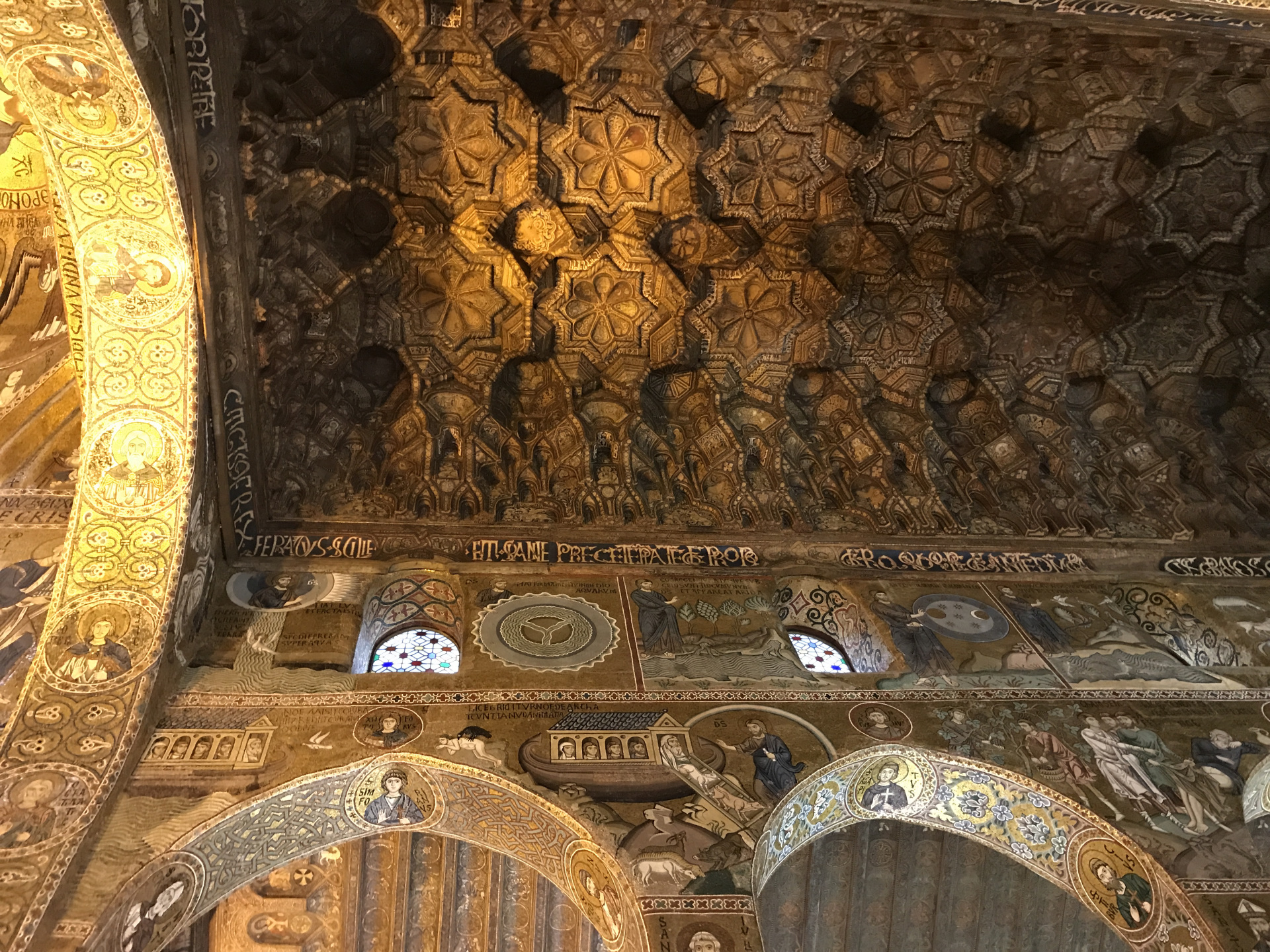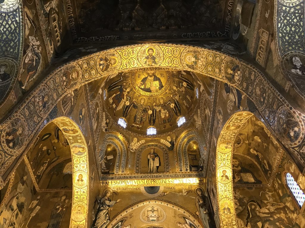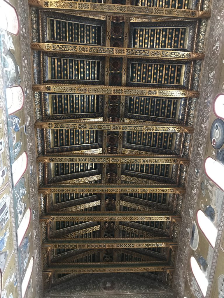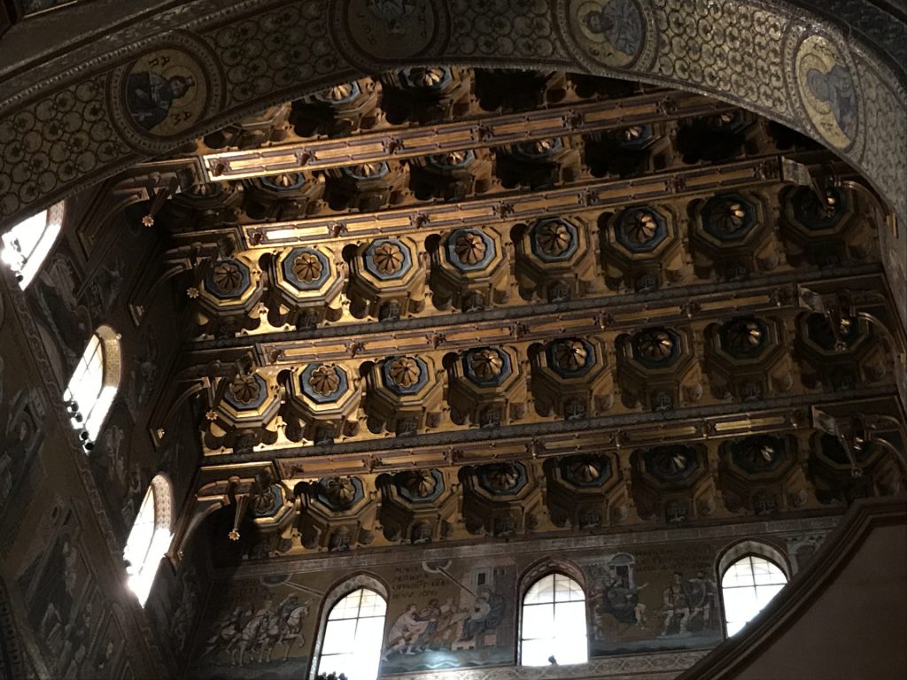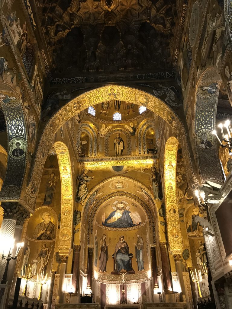 Im Normannenpalast war auch noch eine Ausstellung der Stadtheiligen Rosalia gewidmet, die im Mittelalter die Pest vertrieben haben soll. Sehr alte riesige Ölschinken, aber nett als Kontrast zum Mosaik :-). Der Palast wurde ursprünglich als Sommerresidenz des Emirs gebaut, von den Normannen und die Jahrhunderte danach aber immer wieder massiv umgebaut. Heute gibt es zwei herausragende Sehenswürdigkeiten: Die Kapelle Cappella Palatina, die im arabisch-byzantinisch-normannischen Stil erbaut und reichhaltig ausgeschmückt ist, sowie die königlichen Gemächer. Unter diesen ist der „Sala di Ercole“ (Herkulessaal) besonders, er ist der Sitzungssaal des sizilianischen Parlament und nur zu besichtigen, wenn nicht getagt wird :-). Alles super gut gepflegt und restauriert (es waren gerade drei junge Frauen an am restaurieren eines Sims). Der Normannenpalast beinhaltet eine weltkultur-Besonderheit von unbeschreiblicher Pracht (was sonst :D), die „Cappella Palatina“. Ganz versteckt im Inneren! Der gute und berühmte Normannen-König (der in Sizilien echt super viel und überall hat bauen lassen), hat sie begonnen. So kleine Mosaike brauchen aber ewig und (natürlich) ist er vor der Fertigstellung gestorben. Macht aber nix, dein Nachfolger hat sie noch fertig bekommen! War ja noch kein Italiener.. 😀 Die Bauzeit war seehr lange..
