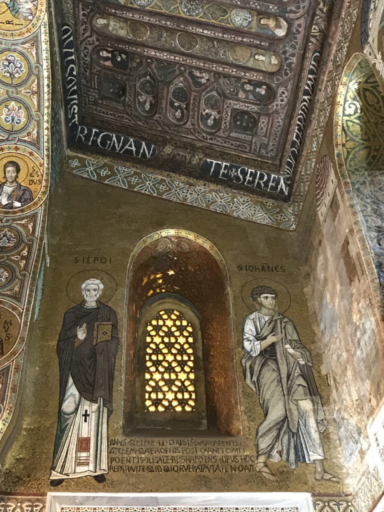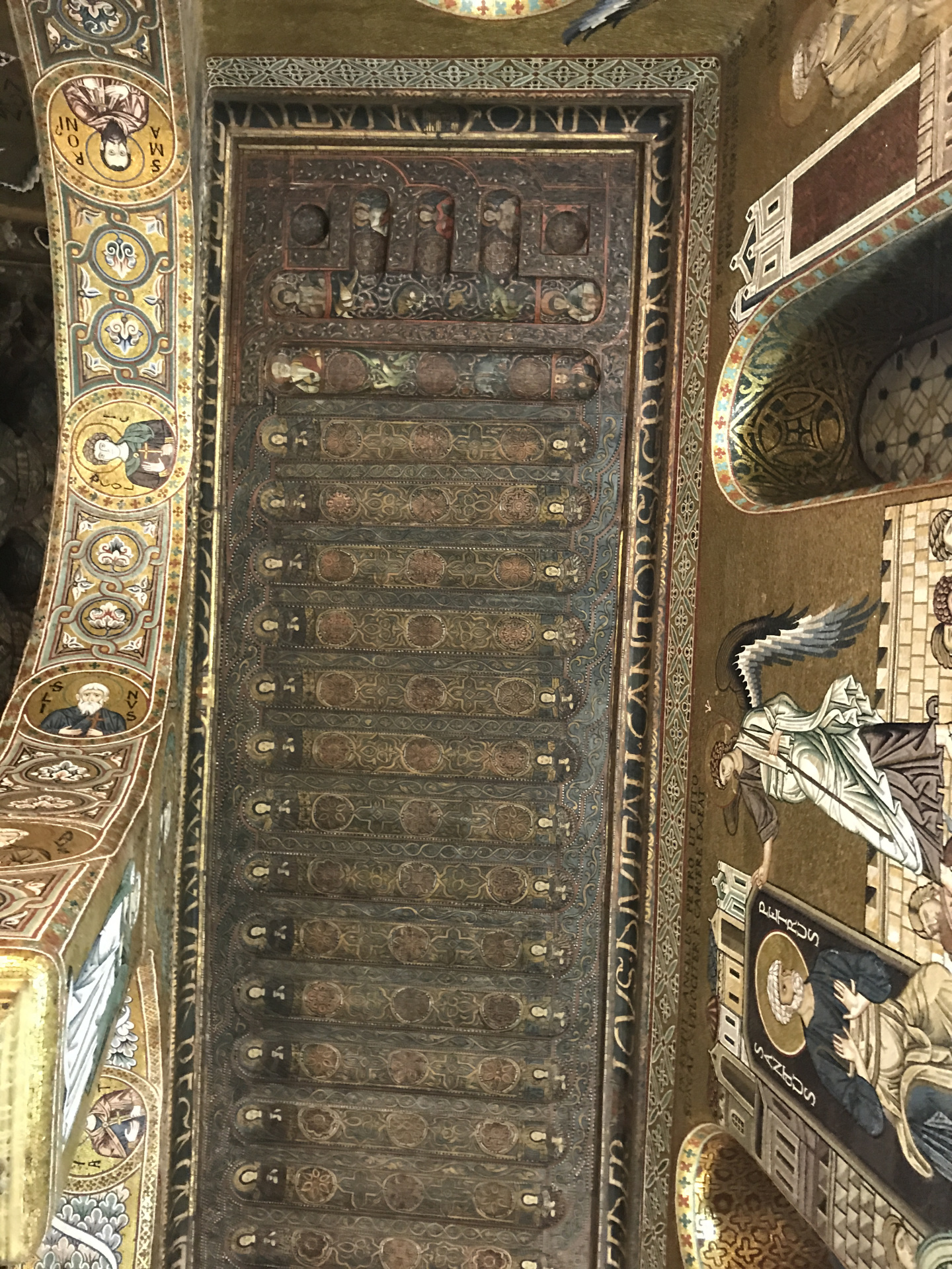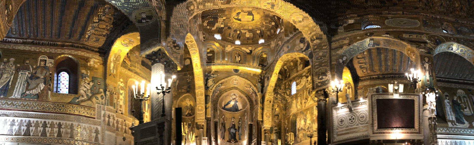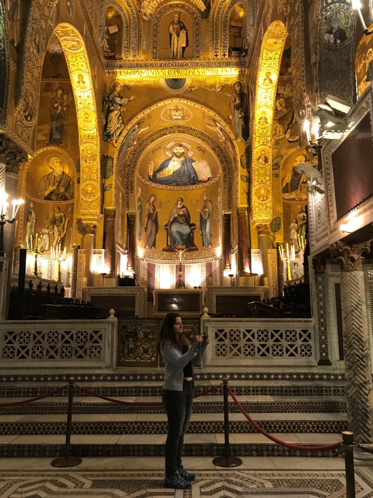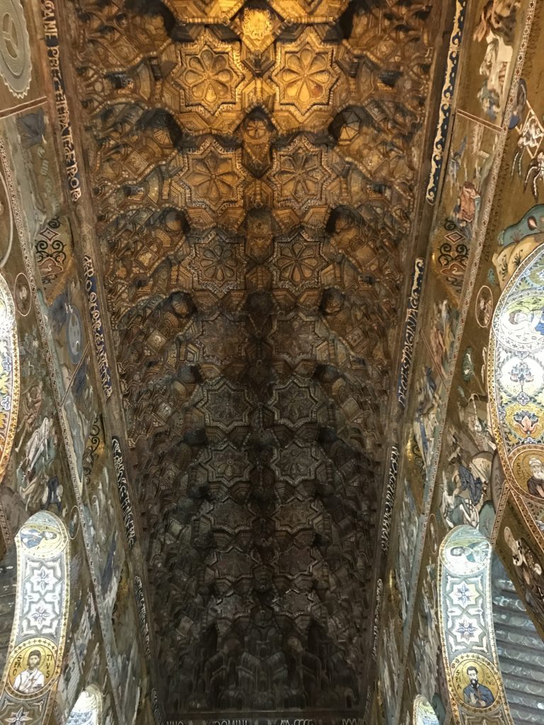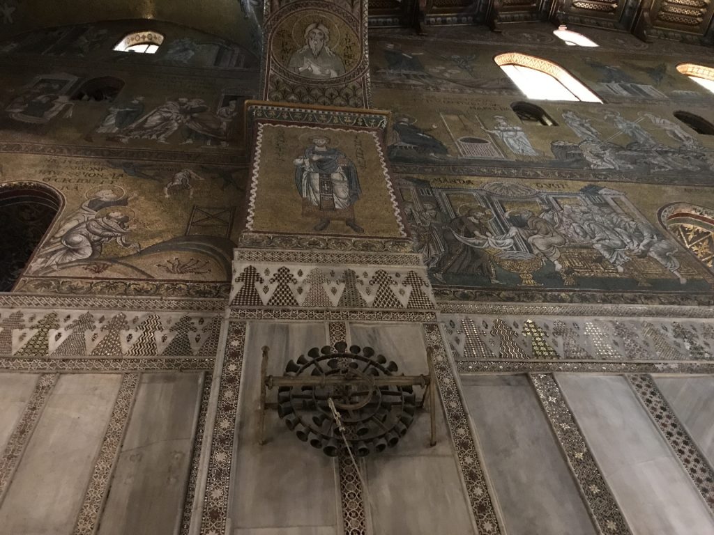 Im Normannenpalast war auch noch eine Ausstellung der Stadtheiligen Rosalia gewidmet, die im Mittelalter die Pest vertrieben haben soll. Sehr alte riesige Ölschinken, aber nett als Kontrast zum Mosaik :-). Der Palast wurde ursprünglich als Sommerresidenz des Emirs gebaut, von den Normannen und die Jahrhunderte danach aber immer wieder massiv umgebaut. Heute gibt es zwei herausragende Sehenswürdigkeiten: Die Kapelle Cappella Palatina, die im arabisch-byzantinisch-normannischen Stil erbaut und reichhaltig ausgeschmückt ist, sowie die königlichen Gemächer. Unter diesen ist der „Sala di Ercole“ (Herkulessaal) besonders, er ist der Sitzungssaal des sizilianischen Parlament und nur zu besichtigen, wenn nicht getagt wird :-). Alles super gut gepflegt und restauriert (es waren gerade drei junge Frauen an am restaurieren eines Sims). Der Normannenpalast beinhaltet eine weltkultur-Besonderheit von unbeschreiblicher Pracht (was sonst :D), die „Cappella Palatina“. Ganz versteckt im Inneren! Der gute und berühmte Normannen-König (der in Sizilien echt super viel und überall hat bauen lassen), hat sie begonnen. So kleine Mosaike brauchen aber ewig und (natürlich) ist er vor der Fertigstellung gestorben. Macht aber nix, dein Nachfolger hat sie noch fertig bekommen! War ja noch kein Italiener.. 😀 Die Bauzeit war seehr lange..