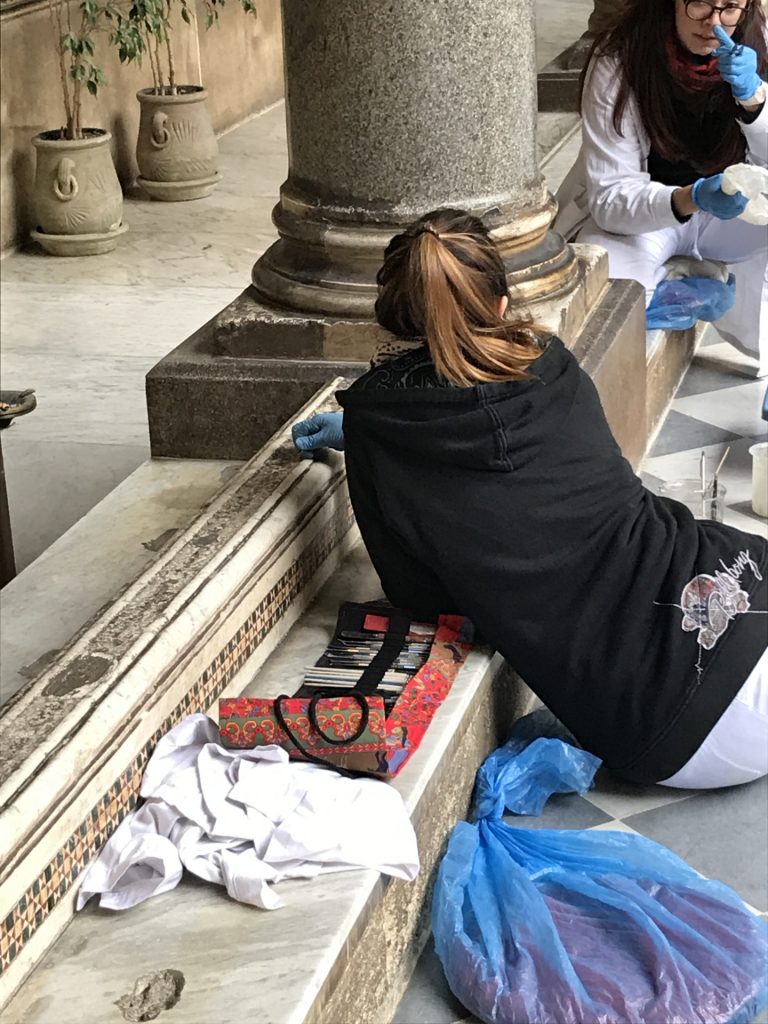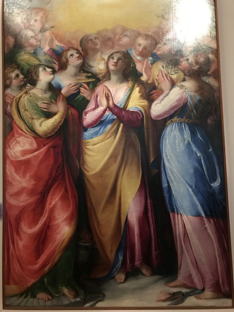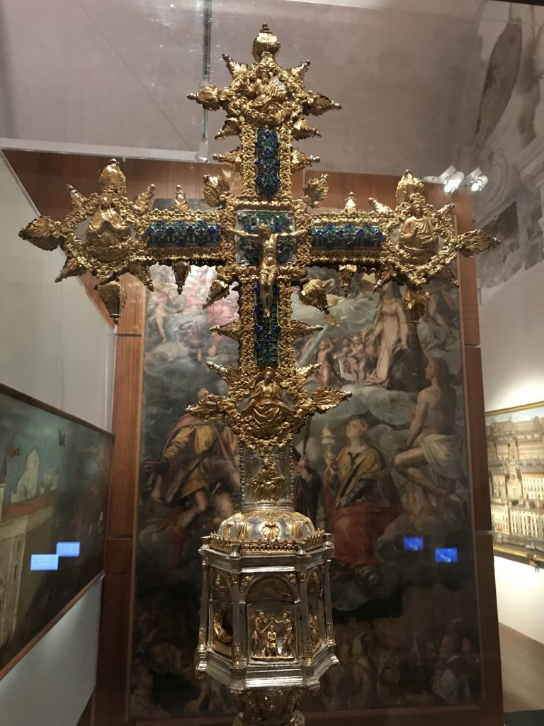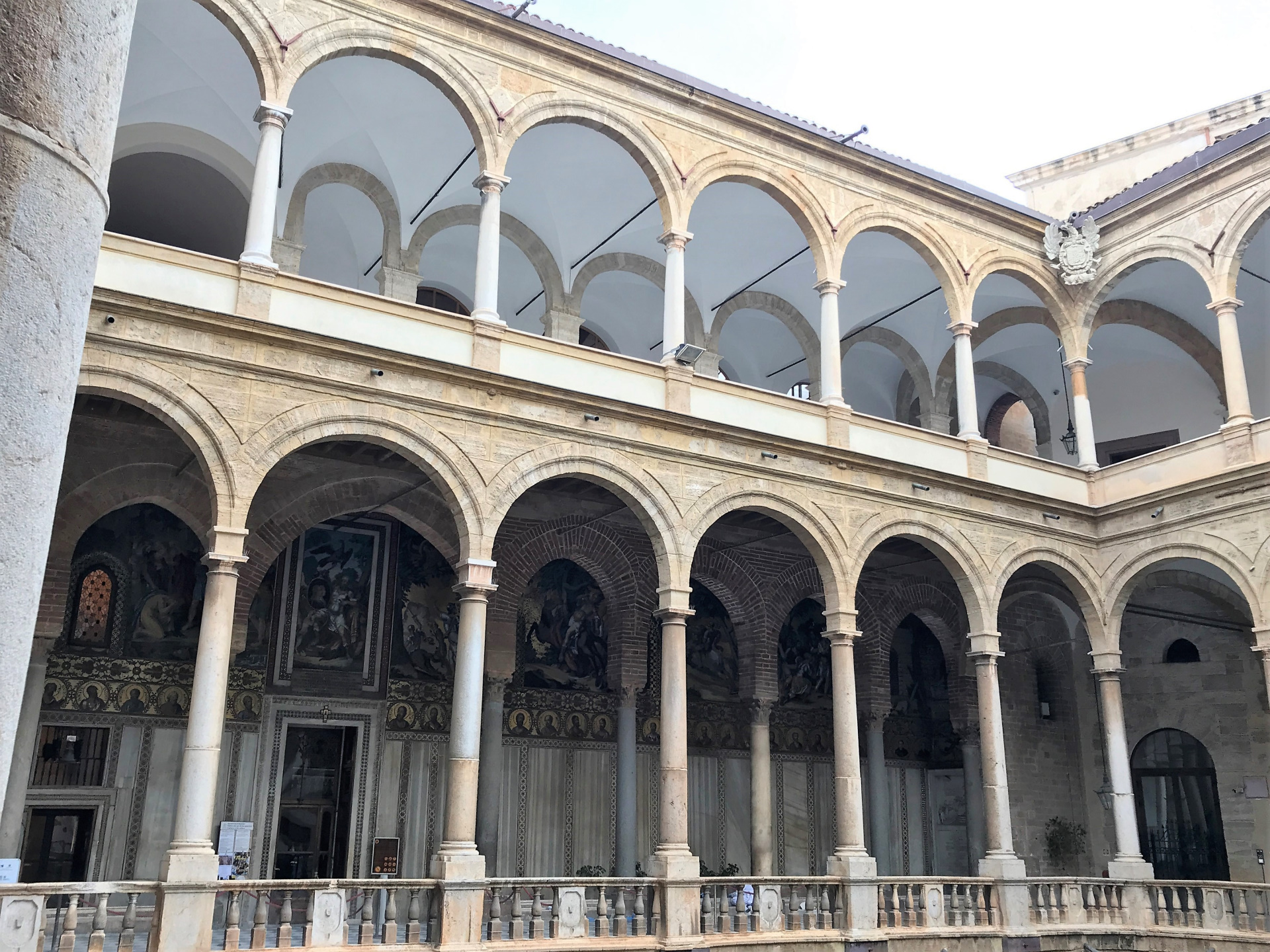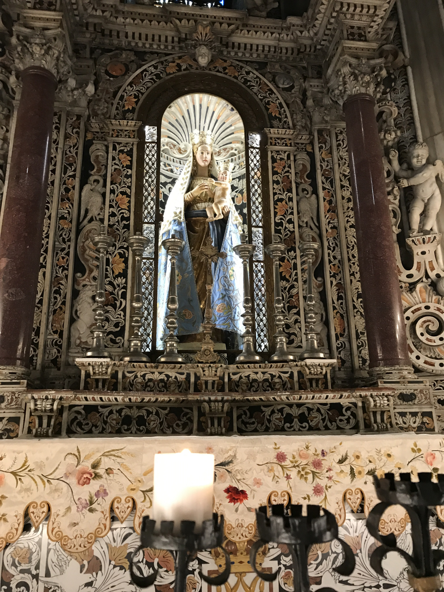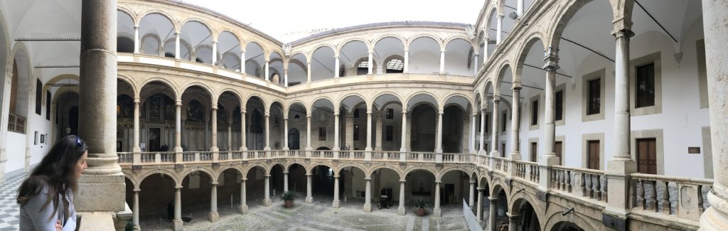 Im Normannenpalast war auch noch eine Ausstellung der Stadtheiligen Rosalia gewidmet, die im Mittelalter die Pest vertrieben haben soll. Sehr alte riesige Ölschinken, aber nett als Kontrast zum Mosaik :-). Der Palast wurde ursprünglich als Sommerresidenz des Emirs gebaut, von den Normannen und die Jahrhunderte danach aber immer wieder massiv umgebaut. Heute gibt es zwei herausragende Sehenswürdigkeiten: Die Kapelle Cappella Palatina, die im arabisch-byzantinisch-normannischen Stil erbaut und reichhaltig ausgeschmückt ist, sowie die königlichen Gemächer. Unter diesen ist der „Sala di Ercole“ (Herkulessaal) besonders, er ist der Sitzungssaal des sizilianischen Parlament und nur zu besichtigen, wenn nicht getagt wird :-). Alles super gut gepflegt und restauriert (es waren gerade drei junge Frauen an am restaurieren eines Sims). Der Normannenpalast beinhaltet eine weltkultur-Besonderheit von unbeschreiblicher Pracht (was sonst :D), die „Cappella Palatina“. Ganz versteckt im Inneren! Der gute und berühmte Normannen-König (der in Sizilien echt super viel und überall hat bauen lassen), hat sie begonnen. So kleine Mosaike brauchen aber ewig und (natürlich) ist er vor der Fertigstellung gestorben. Macht aber nix, dein Nachfolger hat sie noch fertig bekommen! War ja noch kein Italiener.. 😀 Die Bauzeit war seehr lange..