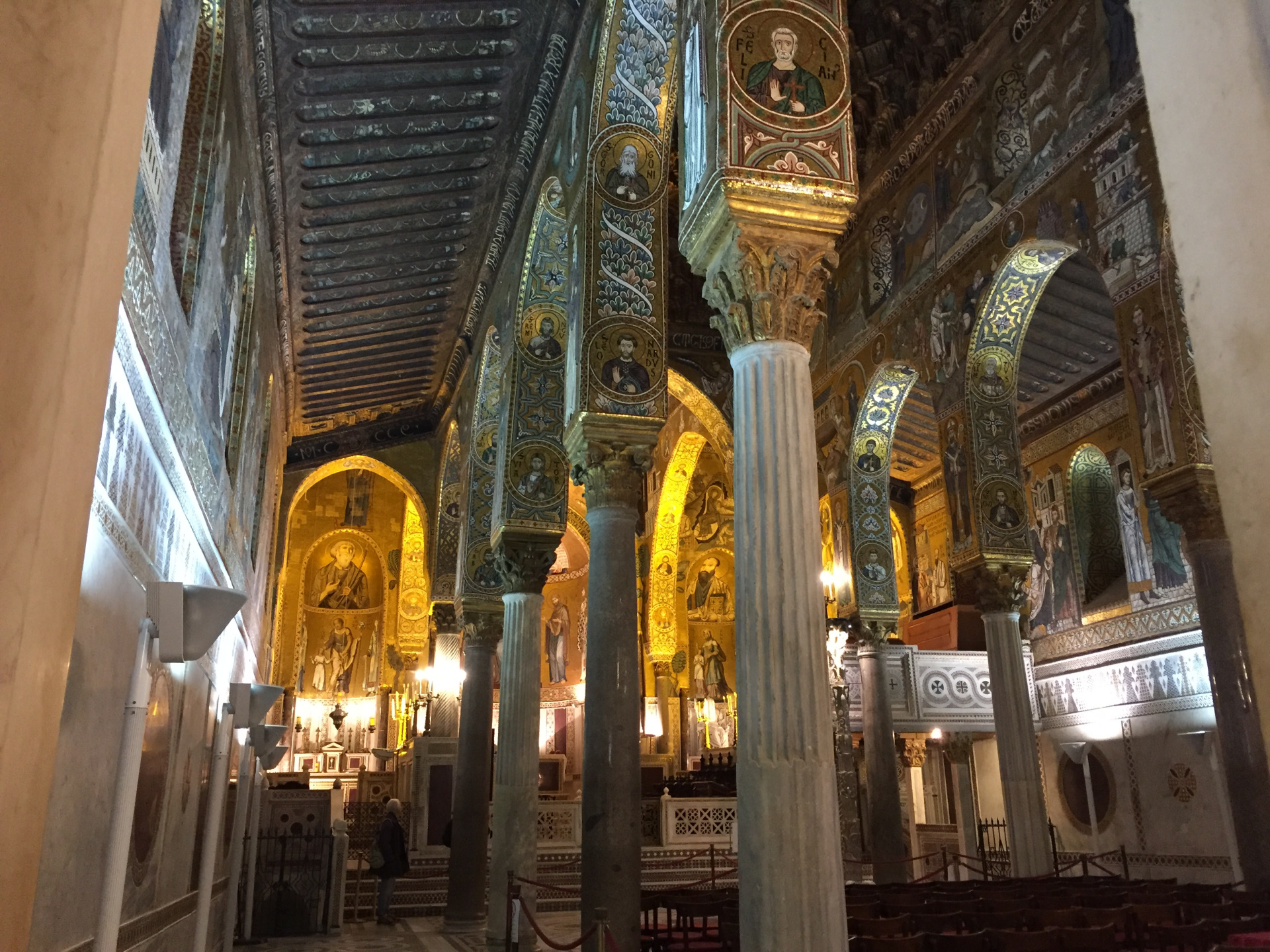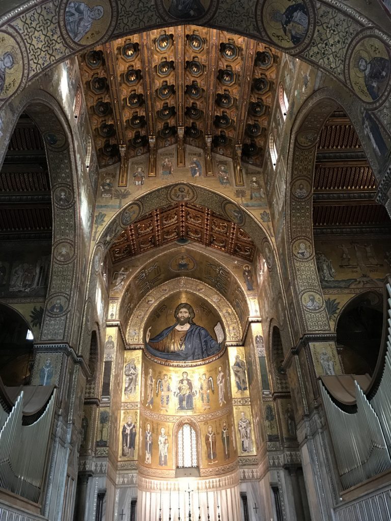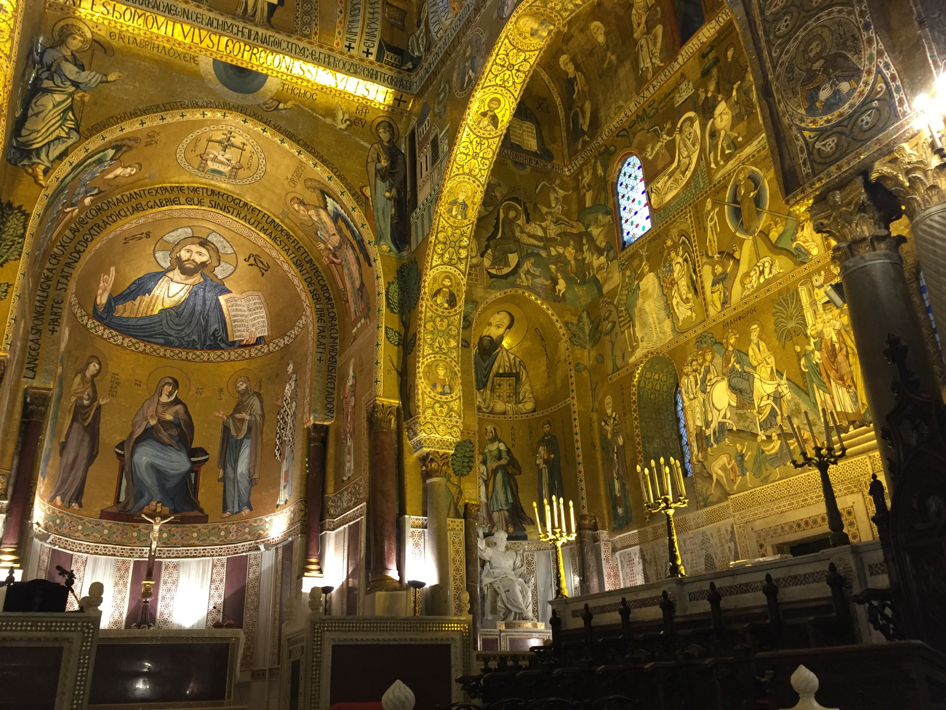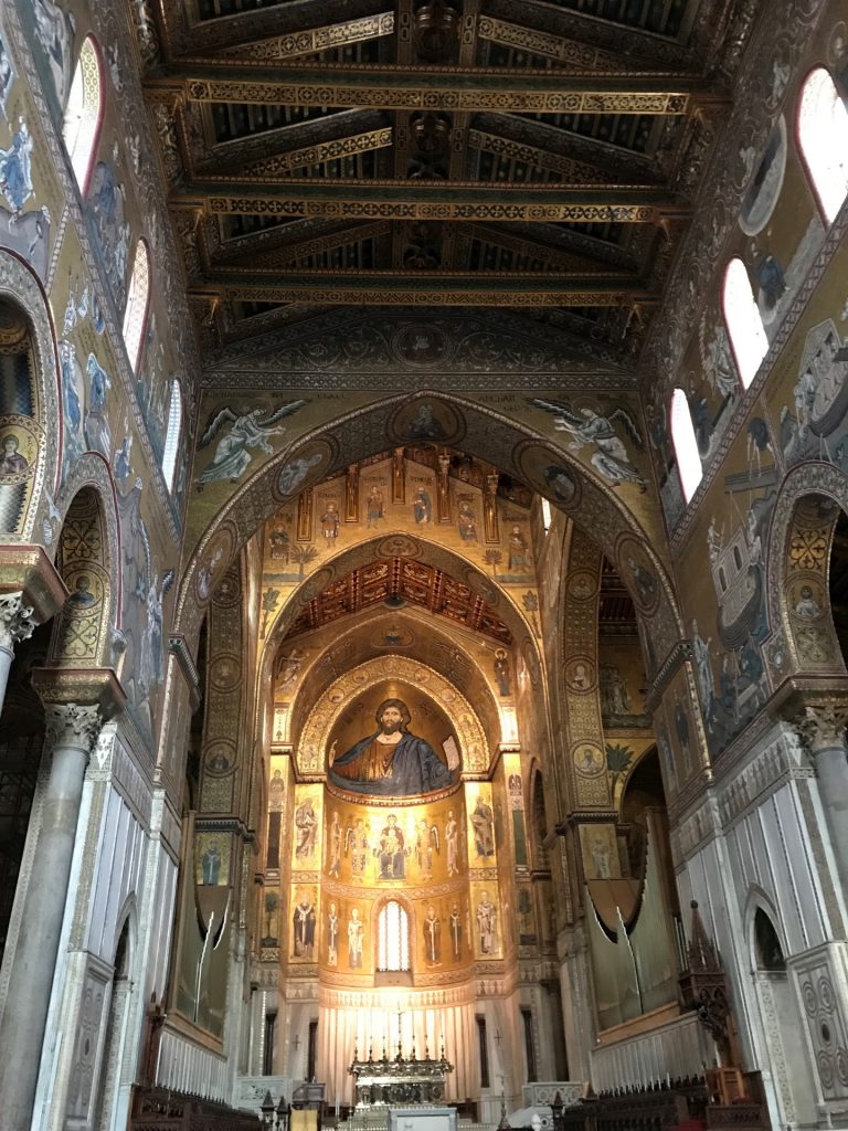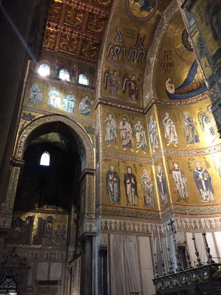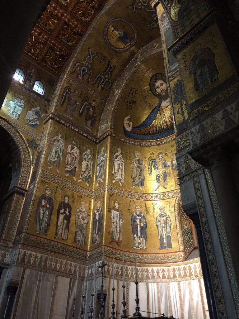 Monreale war am Nachmittag dann ein schöner Spaziergang und ein guter Ausklang unseres Palermo Abenteuers. Die Stadt liegt ca. 7 km im Landesinneren auf 310 hm und man hat einen herrlichen Blick auf Palermo. Wir haben uns die Kathedrale angesehen, die nochmal voller Mosaiken ist und von allen Gold-Mosaik-gearbeiteten Kirchen die prächtigsten sein soll. Wenn das überhaupt noch geht.. Naja, sie kommt auf über 6000 qm Mosaik-Fläche und ist somit an Fläche schon einmal nicht mehr einzuholen. Von der Pracht nicht zu reden!