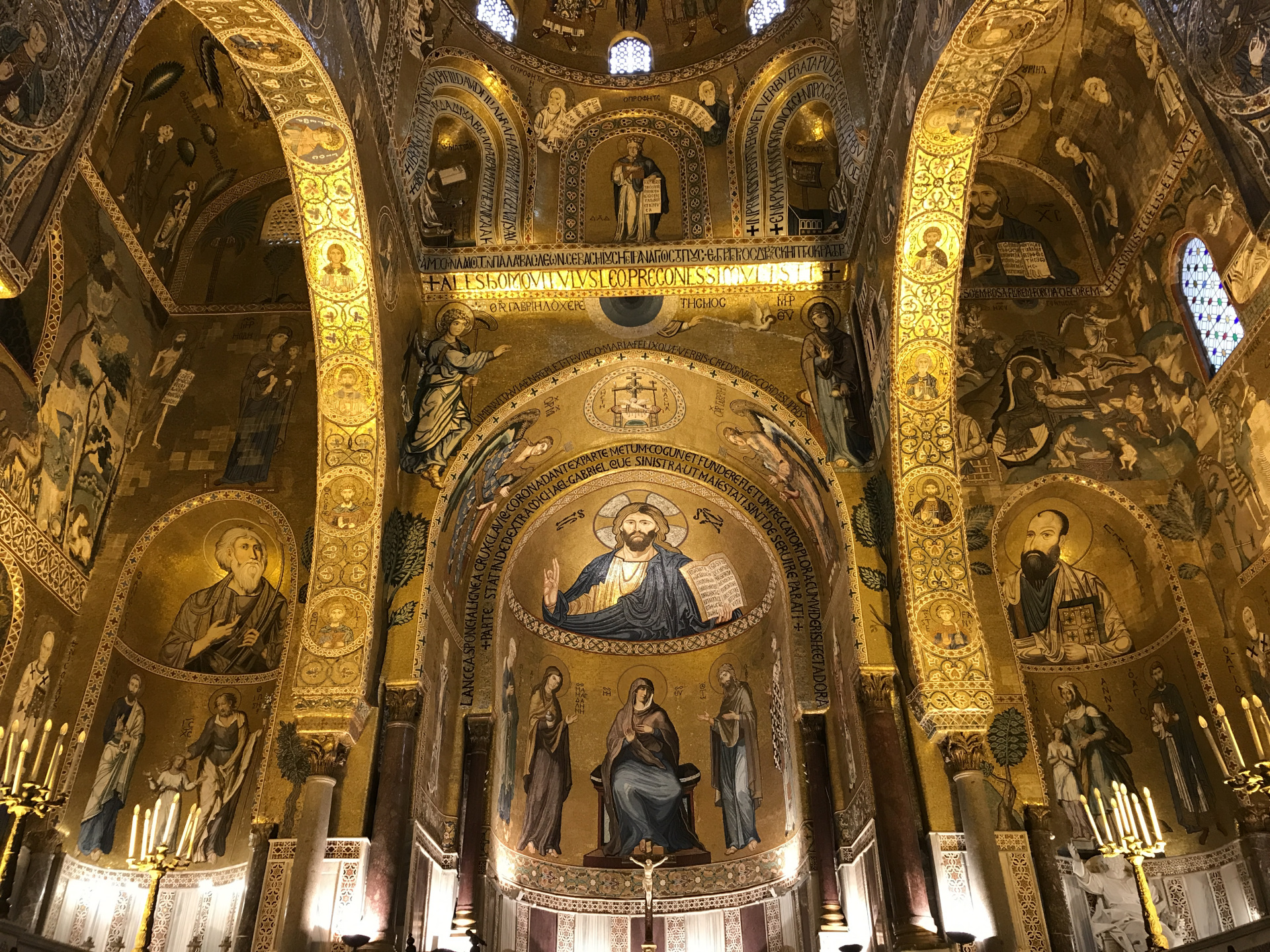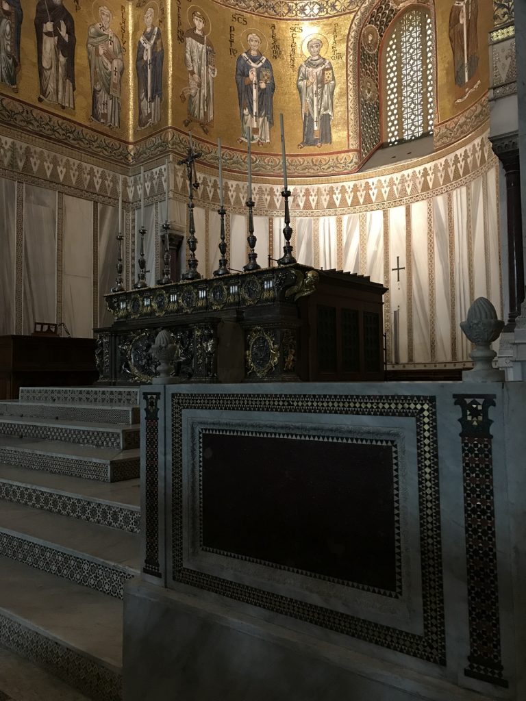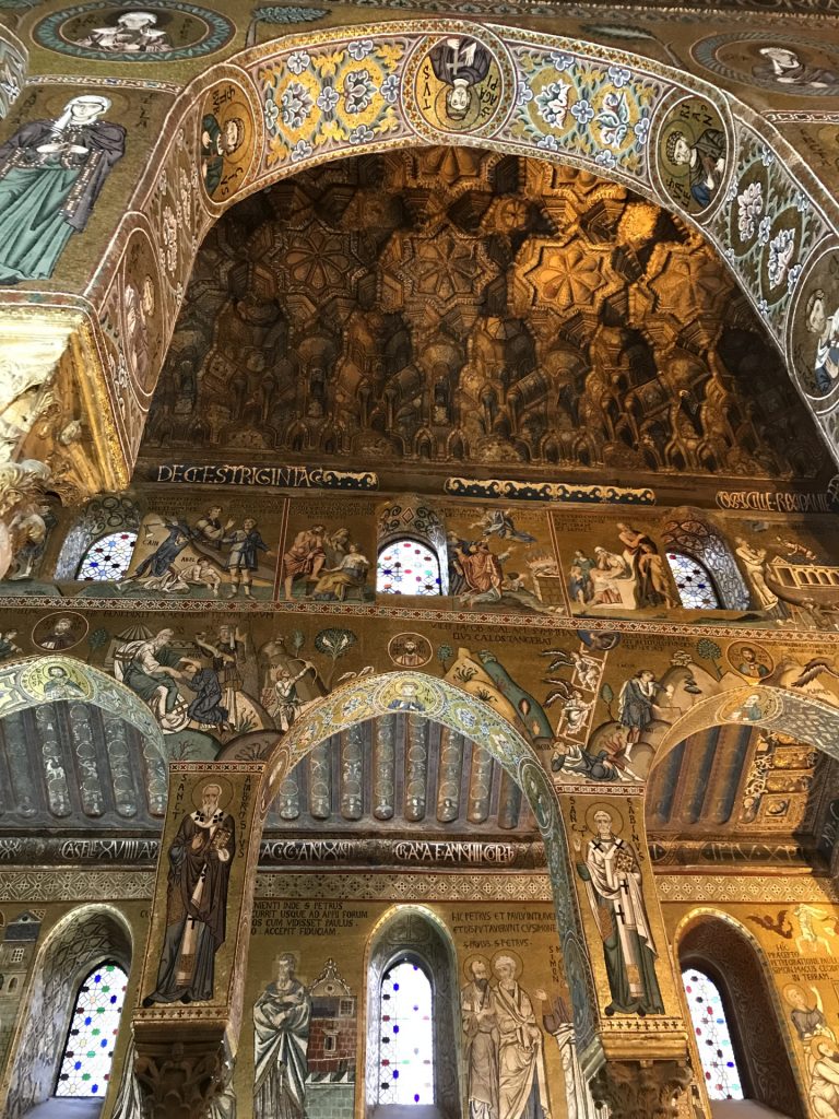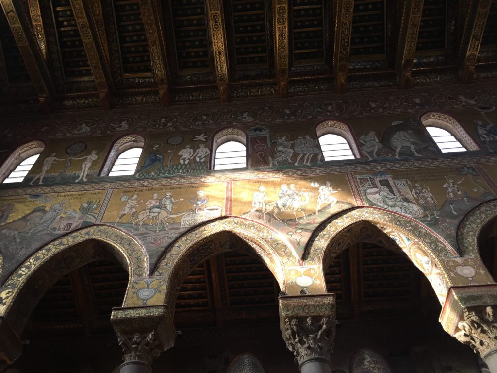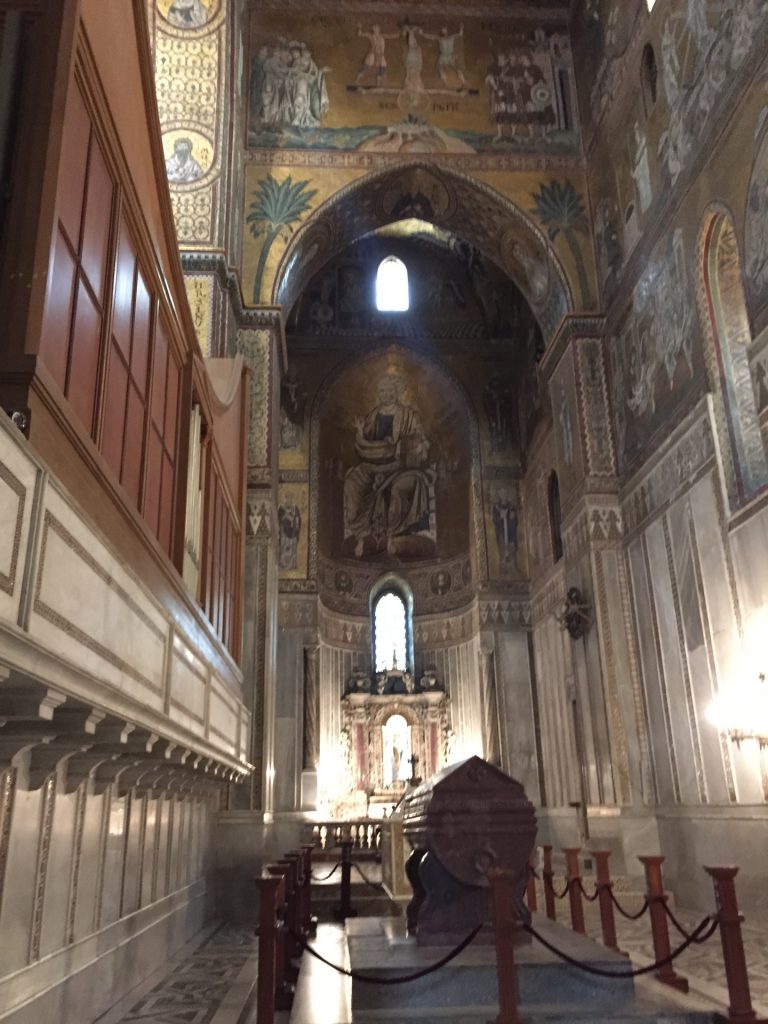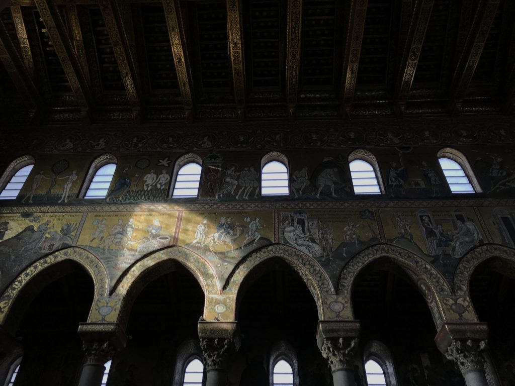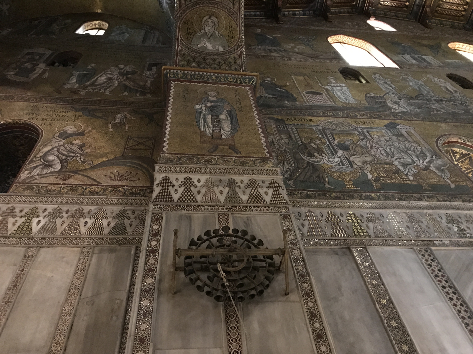 Monreale war am Nachmittag dann ein schöner Spaziergang und ein guter Ausklang unseres Palermo Abenteuers. Die Stadt liegt ca. 7 km im Landesinneren auf 310 hm und man hat einen herrlichen Blick auf Palermo. Wir haben uns die Kathedrale angesehen, die nochmal voller Mosaiken ist und von allen Gold-Mosaik-gearbeiteten Kirchen die prächtigsten sein soll. Wenn das überhaupt noch geht.. Naja, sie kommt auf über 6000 qm Mosaik-Fläche und ist somit an Fläche schon einmal nicht mehr einzuholen. Von der Pracht nicht zu reden!