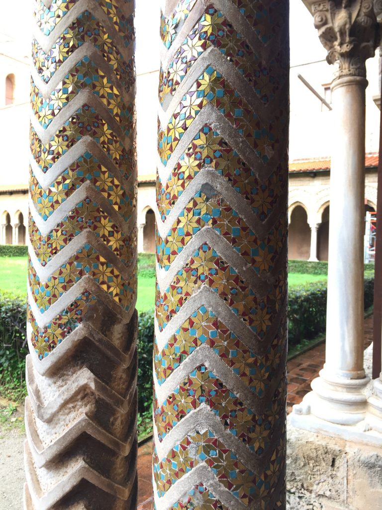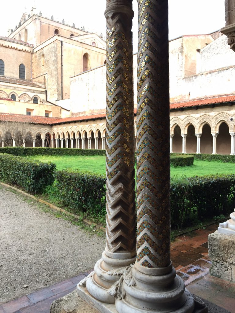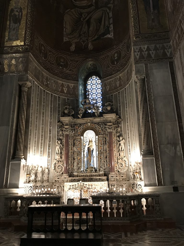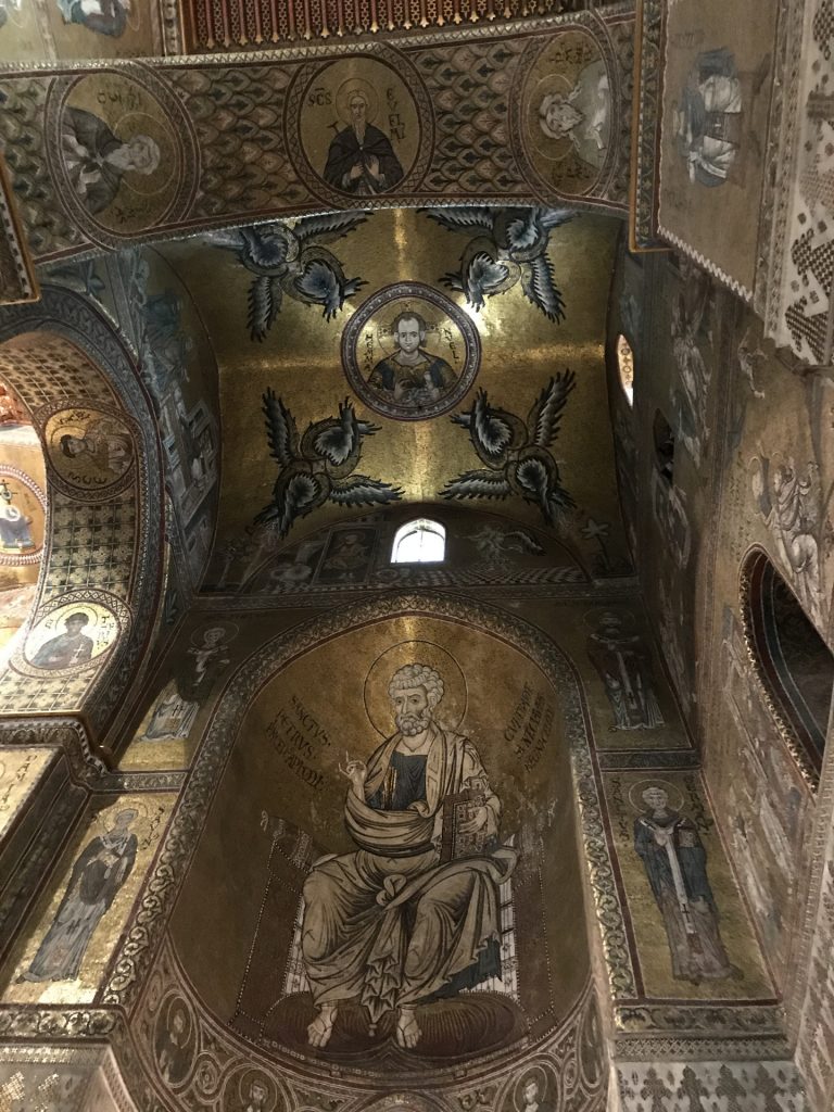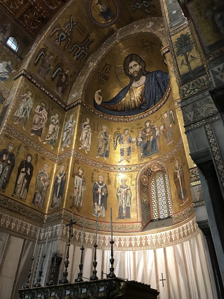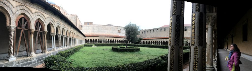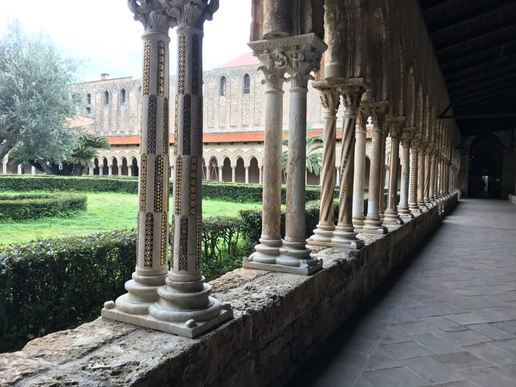 Monreale war am Nachmittag dann ein schöner Spaziergang und ein guter Ausklang unseres Palermo Abenteuers. Die Stadt liegt ca. 7 km im Landesinneren auf 310 hm und man hat einen herrlichen Blick auf Palermo. Wir haben uns die Kathedrale angesehen, die nochmal voller Mosaiken ist und von allen Gold-Mosaik-gearbeiteten Kirchen die prächtigsten sein soll. Wenn das überhaupt noch geht.. Naja, sie kommt auf über 6000 qm Mosaik-Fläche und ist somit an Fläche schon einmal nicht mehr einzuholen. Von der Pracht nicht zu reden!