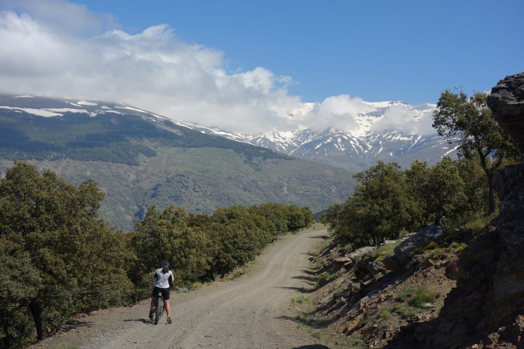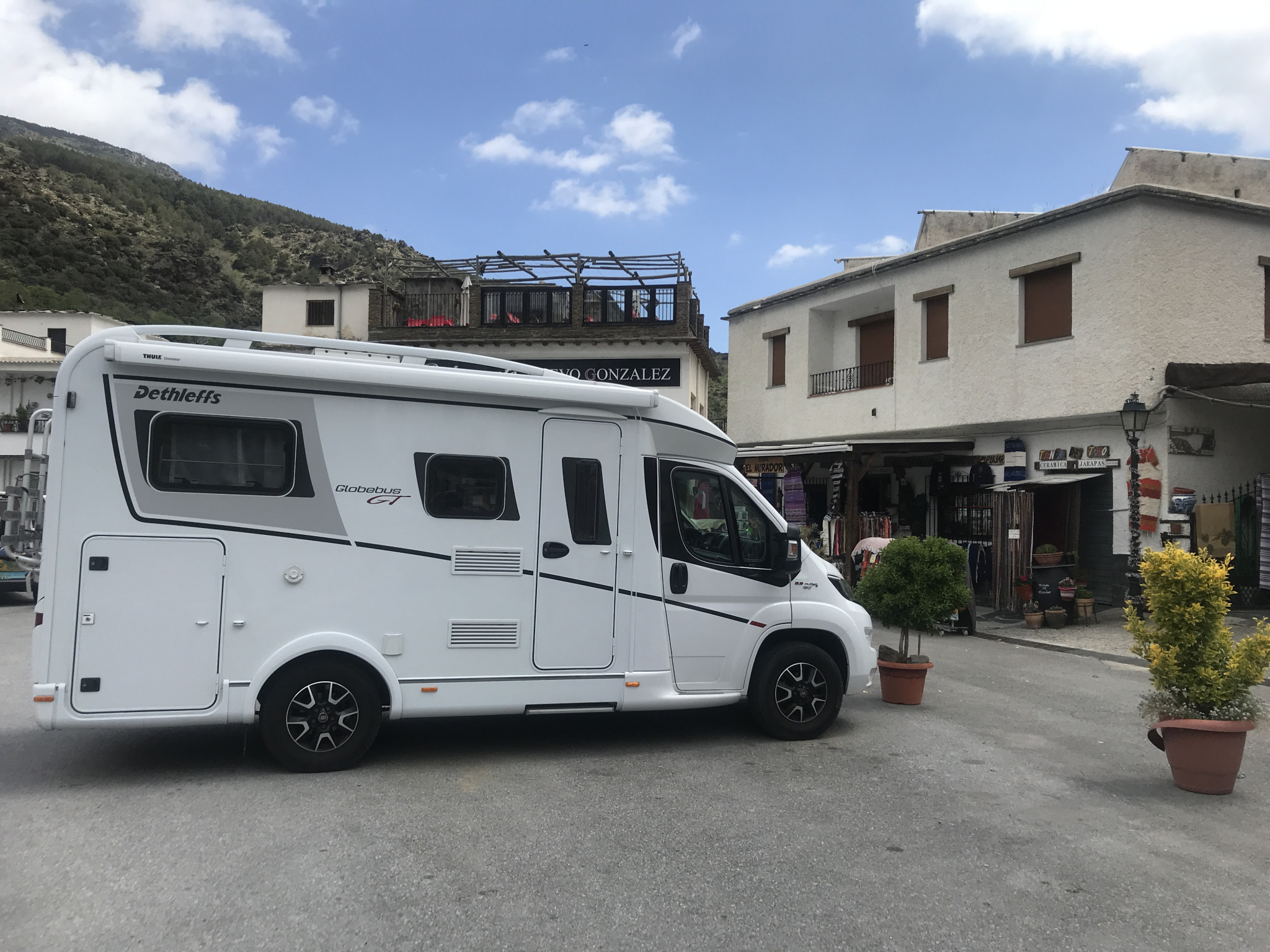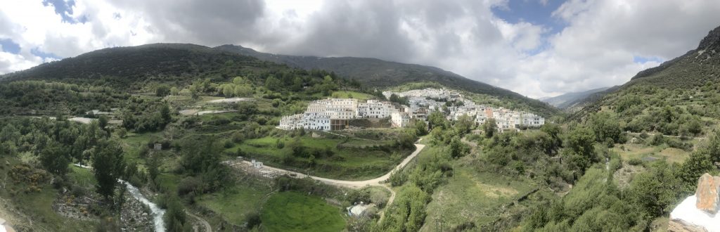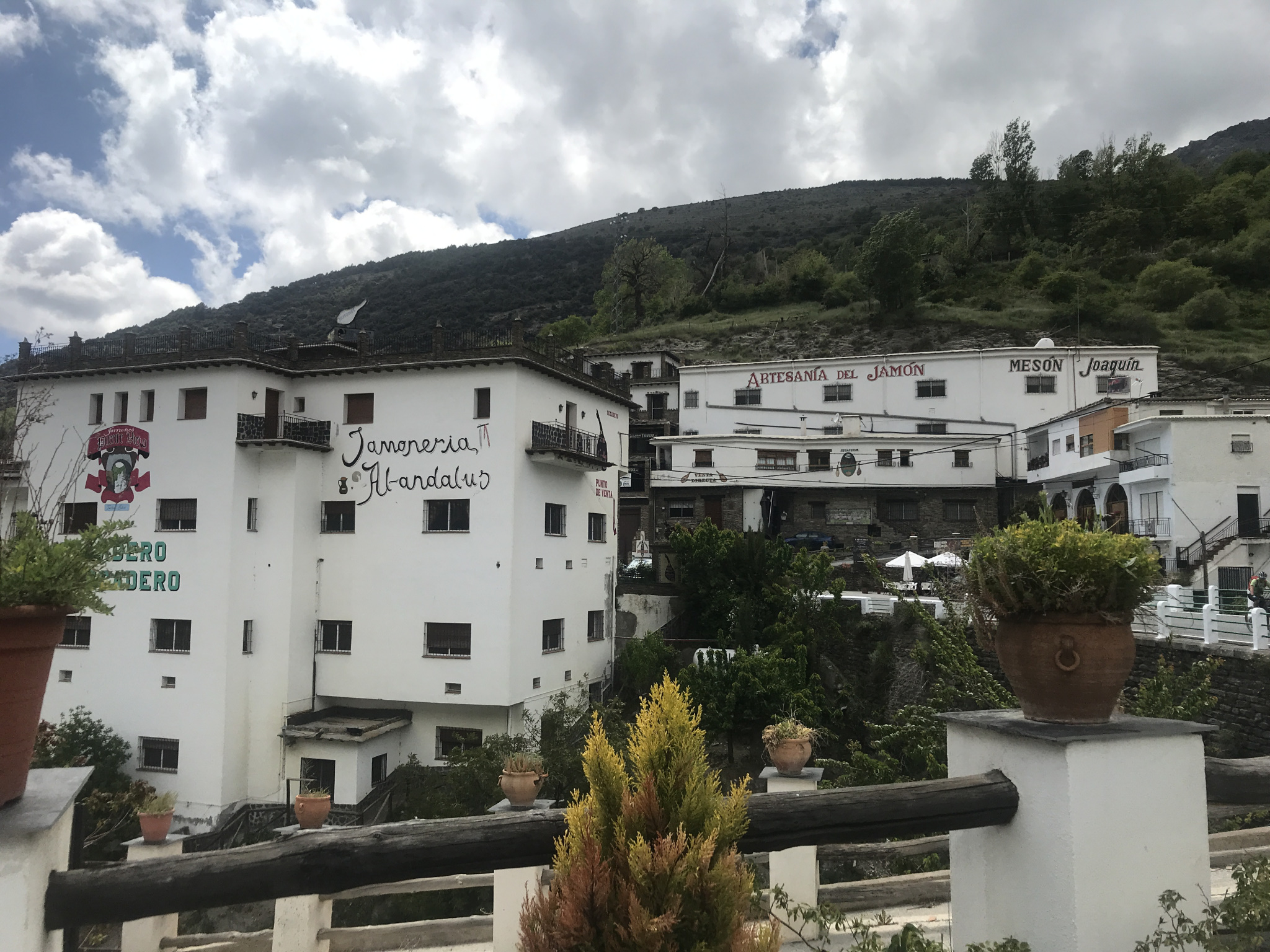 Wir haben auch Spaniens höchsten (Festland)Punkt besucht: ein Dorf in der Sierra Nevada (hinter Granada), das DIE Serrano-Schinken Hochburg sein soll: Trevélez. War auch so: es gab noch schneebedeckte Hänge (und im Winter ein Skigebiet), wunderschöne Blumen und viel Schinken (die vielen Schweine-Zuchten im Land sind auch nicht zu über-riechen). Und eine etwas kalte Nacht im Camper. Sehr nett war es! Und die enge Strasse dorthin wirklich lang und abenteuerlich…