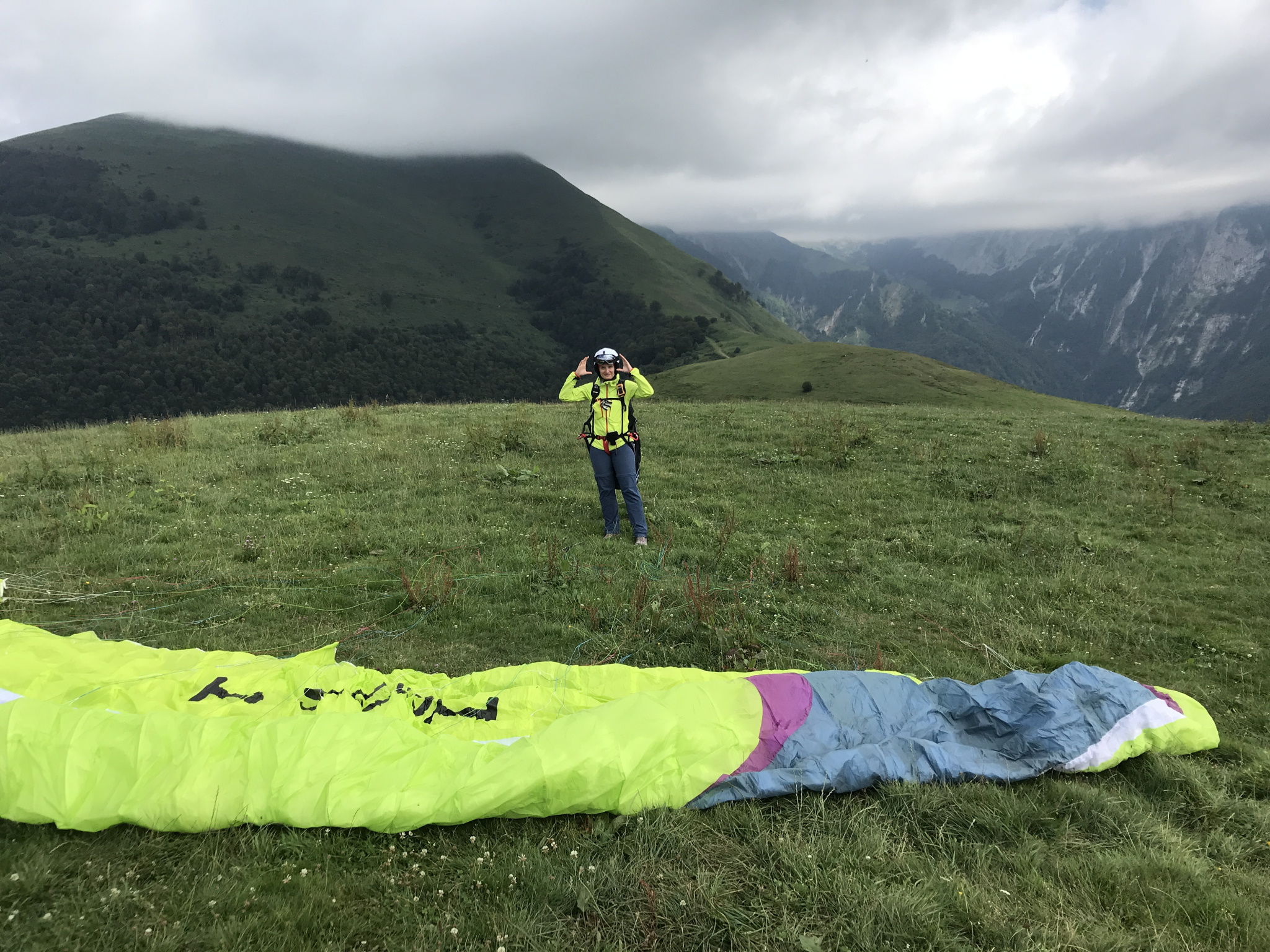 Im Gegensatz zu den spanischen Fluggebieten gab es einen Landeplatz mit Windsack, ein Vereinsheim (mit Bier!) und einen Shuttelservices!! Also den Gleitschirm auf den Rücken und mit einem reichlich überbesetzten Shuttel und 10 weiteren netten Franzosen ging es 1000hm den Berg hinauf. Oben angekommen gabs erstmal Startplatzsitting (da der Talwind mittlerweile so stark war, dass eine Landung sehr unangenehm gewesen wäre). Nach 1,5h und einem Schläfchen in der Wiese (schnarchenderweisse) unserer Mit-Piloten gings dann endlich los und es gab einen super schöner und spannender Flug: Sandra startet (wie immer perfekt) und ich gleich hinterher, aber mit Beschleuniger ums Funkegerät gewickelt :-!. Muss wohl Sandra alles nachmachen… Nach kurzer Entwicklung war alles im Lot und es wurde ein schöner 1,5h Flug mit dramatischen Ausblicken über einen Felsengrat, der sehr tiefen Wolkendecke inklusive einer entspannten Landung (der Talwind war mittlerweile eingeschlafen).