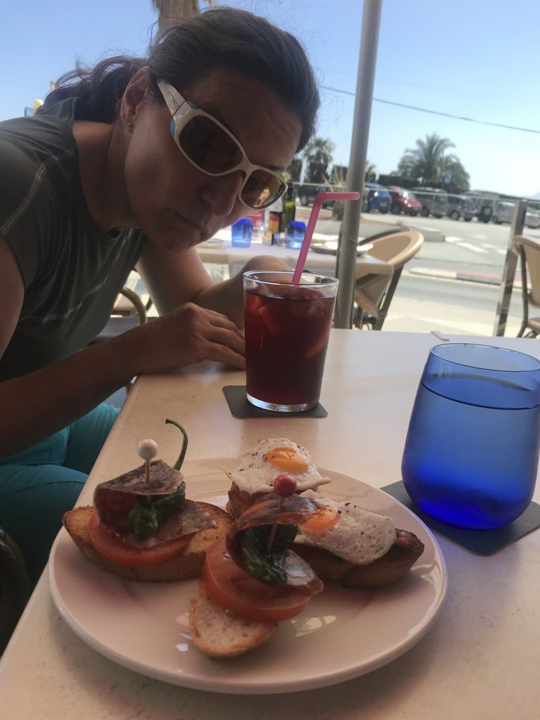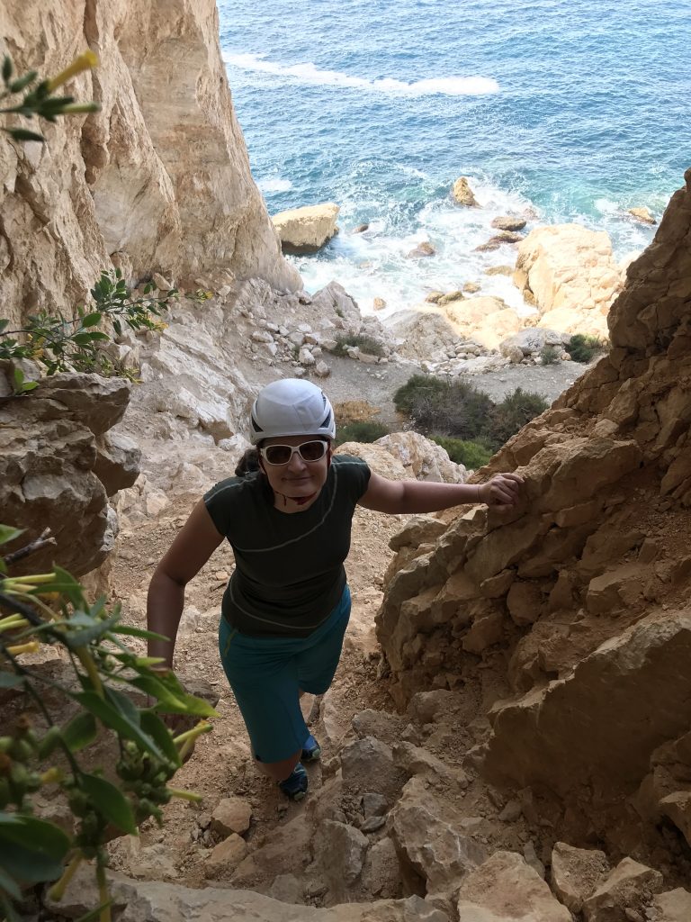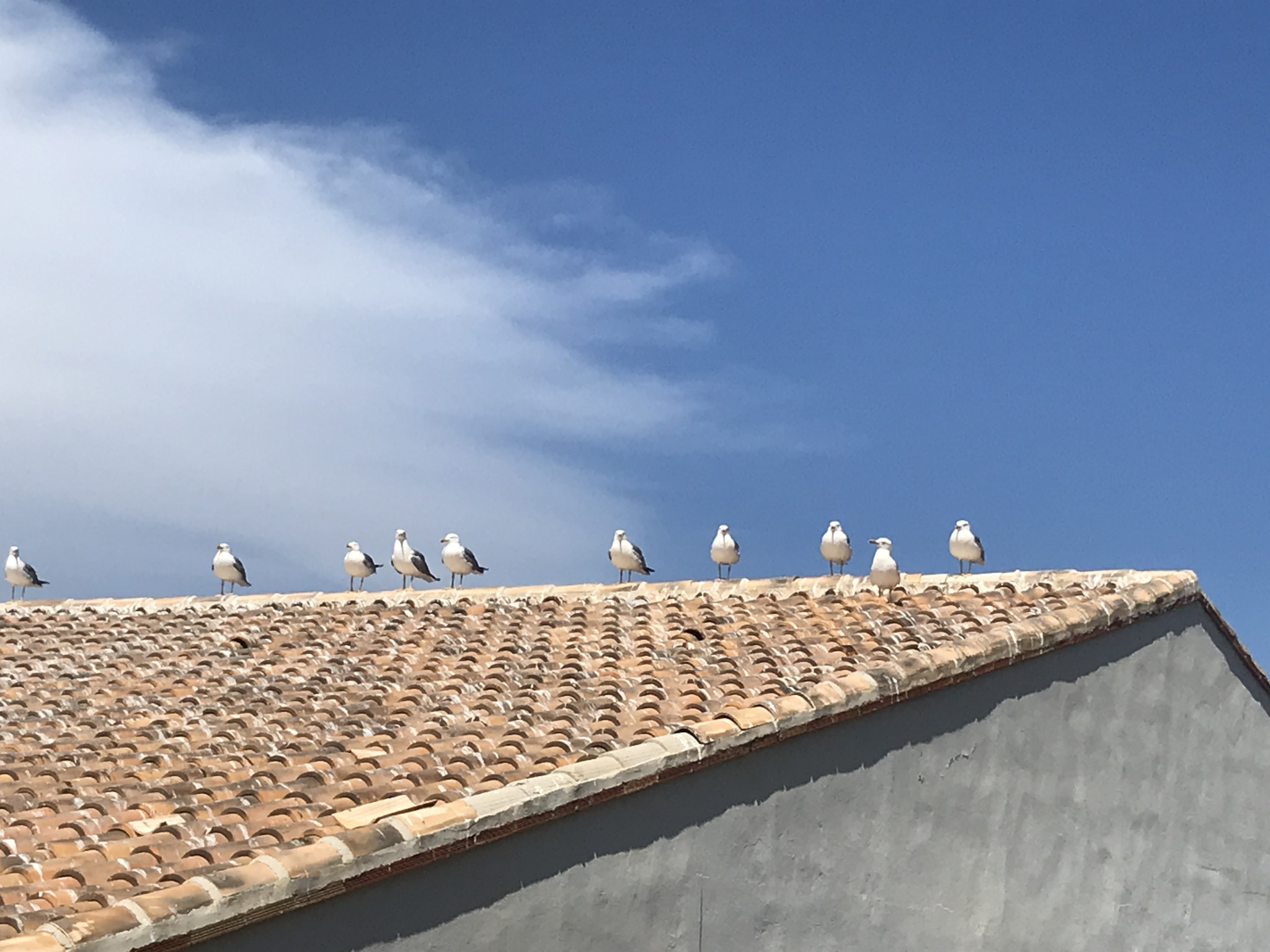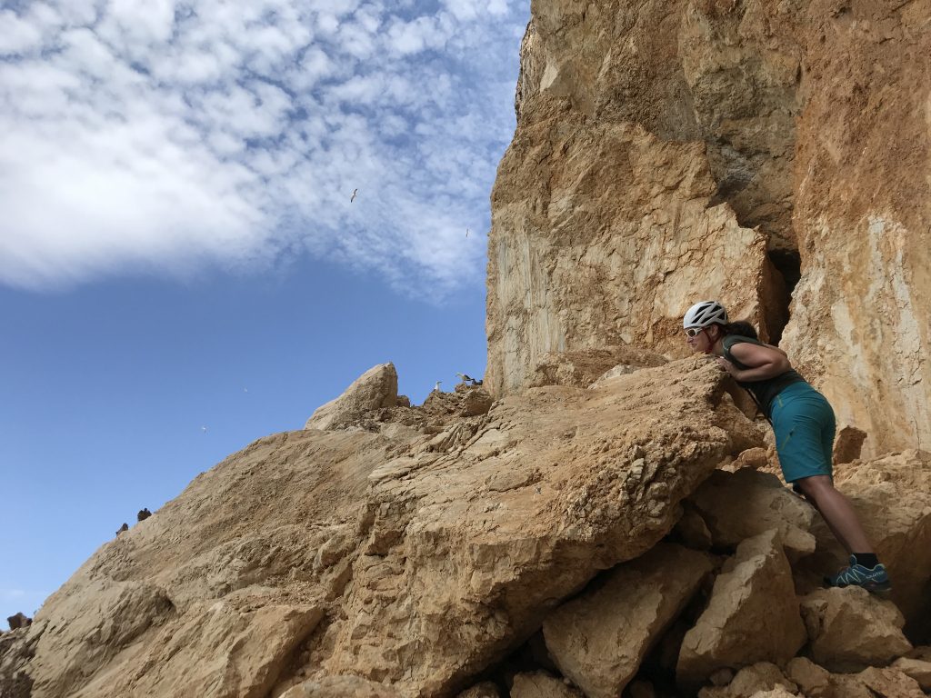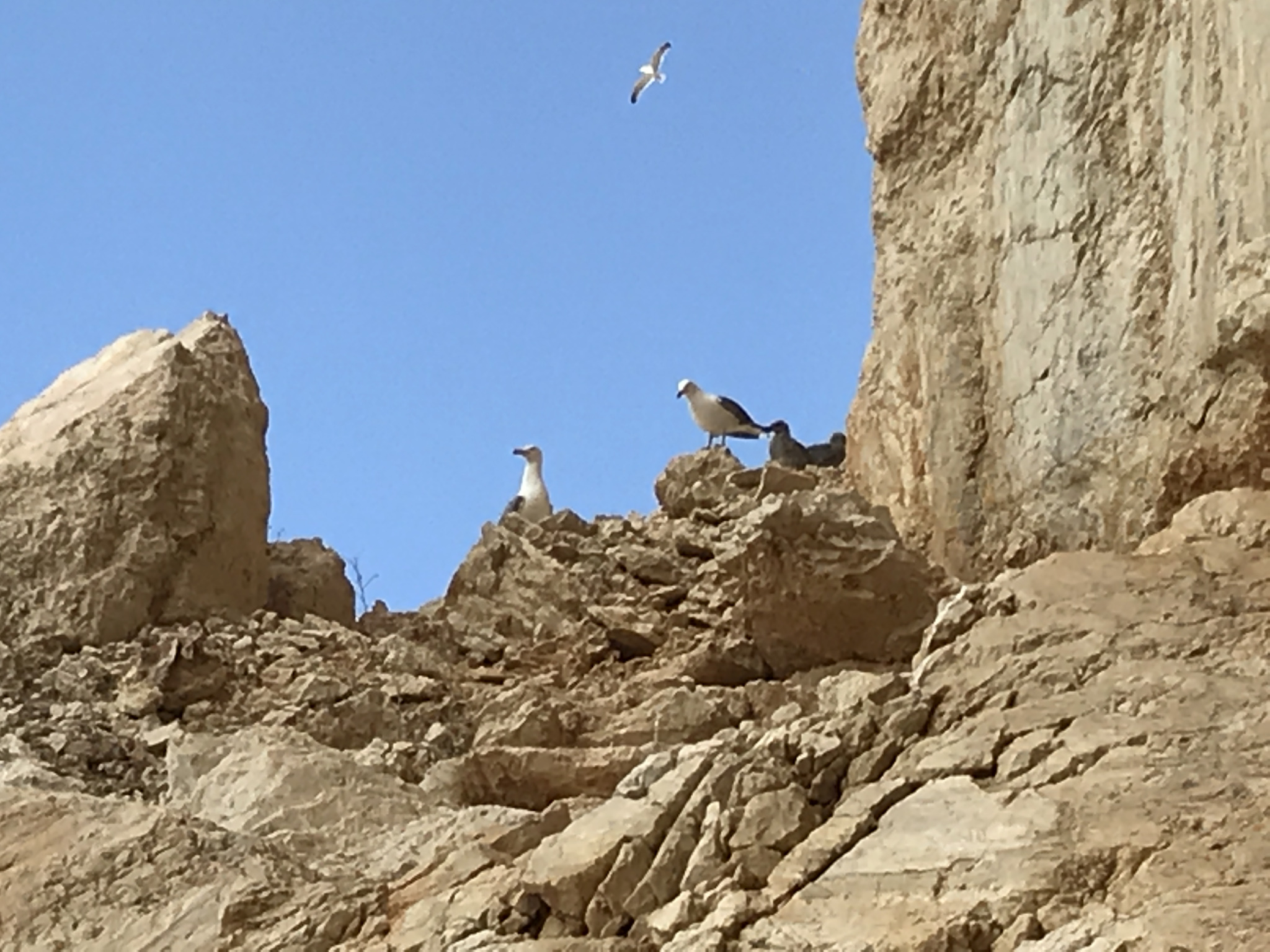 Heute haben wir unseren Kletterversuch gestartet. Nach einer Ermahnung eines lokalen Kletterers, unbedingt unsere Helme aufzusetzen, sind wir am Ende der Promenade in den Felsen ein- und aufgestiegen. Auf felsigem Trampelpfad steil nach oben. Leider war der Zustiegsweg nur sehr kurz, wir sind auf eine grantig schauende Blockade gestossen: mitten auf dem schmalen Pfad hat ein Möven-Paar ihr Nest gebaut (ist ja eben, diese Stelle). Und schon ziemlich in unsere Richtung gespickt. Erst gab es Geschrei, dann zwei Küken-Köpfe, dann den ziemlich großen Papa, der ziemlich ernste Angriffe auf unsere Köpfe geflogen hat… Ok, ist ja auch ihr Zuhause!! Wir haben uns ein wenig geduckt und die netten Küken angeschaut. Vom lokalen Klettermaxe unten kam ein aufmunterndes „vale, vale“, aber so recht wollten wir den Möven nicht auf den Leib rücken, die haben schließlich Hausrecht! Er kam dann hochgeklettert, um zu zeigen, wie man daran vorbei geht. Wir fanden’s nicht so gut, waren aber auf die Mövenreaktion sehr gespannt. Und ziemlich überrascht über deren effiziente Abwehr-Aktionen: nach tiefen Überflügen kommt nicht etwa ein Angriff mit dem Schnabel, sie benutzen das andere Ende! Und vermeiden somit gefährlichen Körper-Kontakt mit den Eindringlingen! Sie hauten schnell hintereinander kleinere glibschige Pakete aus dem hinteren Möventeil in Richtung bösem Kletterer!!! Sandra hat sich fast weggeworfen!! 😀 Die Möven haben sich auch sehr schnell wieder beruhigt, sie sind Kletterer anscheinend einigermaßen gewöhnt… Wir sind dann abgestiegen und zu Fuss auf der andren Seite auf den Felsen, um den Möven auf dem Weg ihre Ruhe zu lassen. Wahrscheinlich wären in der ganzen Kletter-Route Nester gewesen, ist eben Brutzeit.
