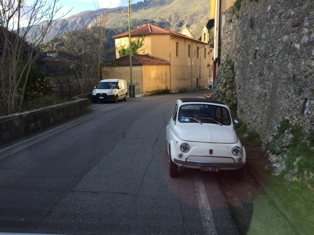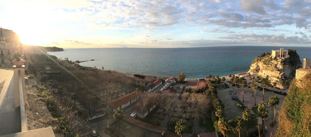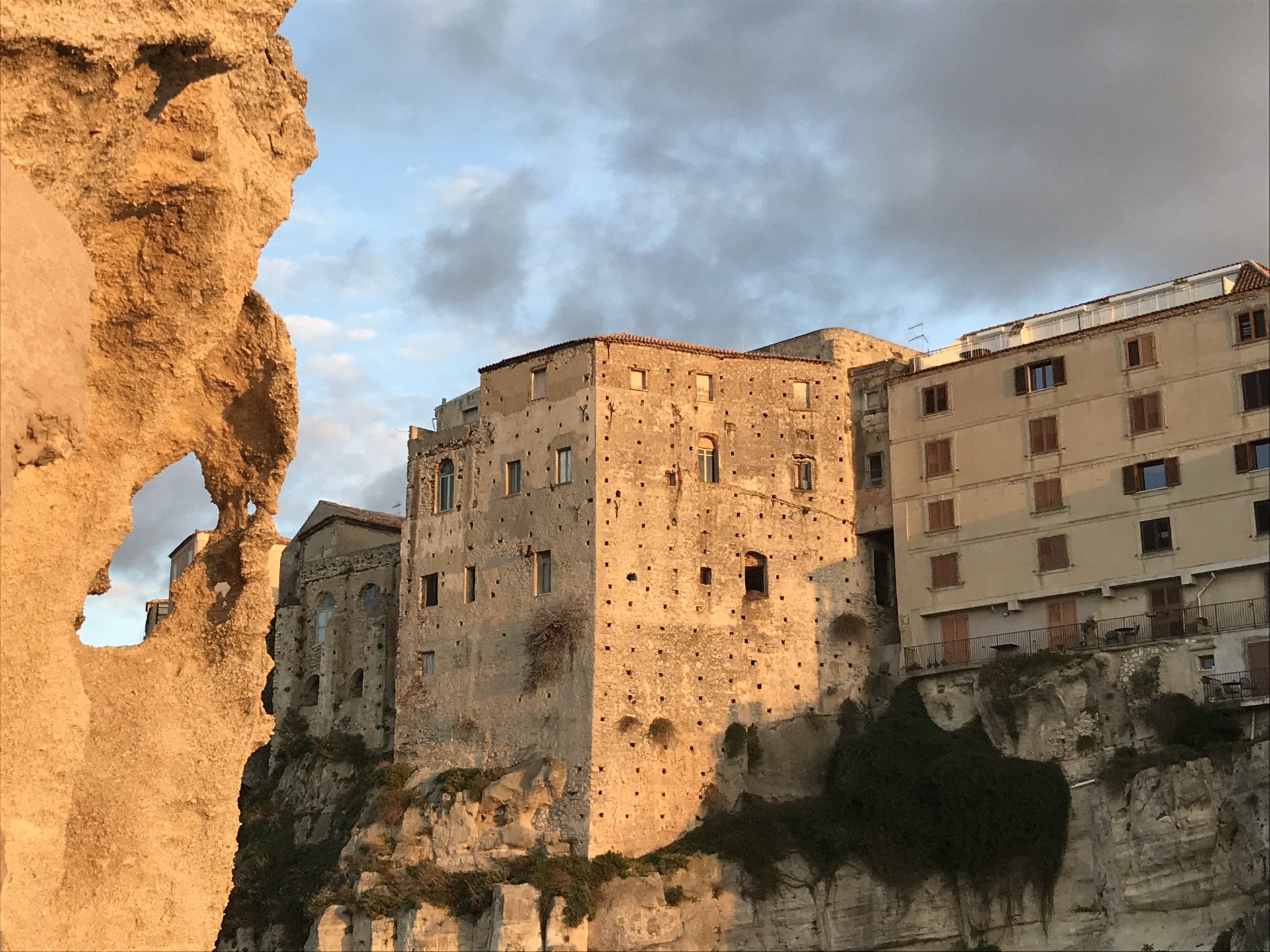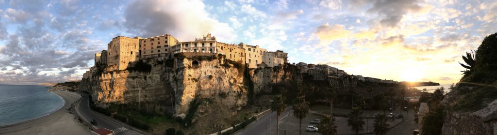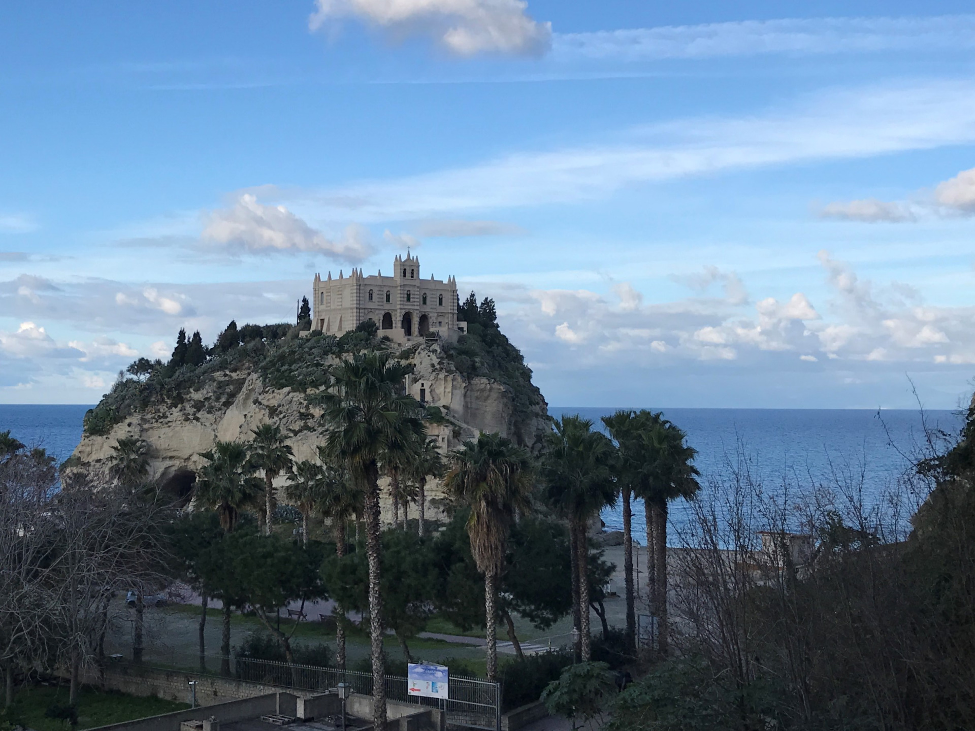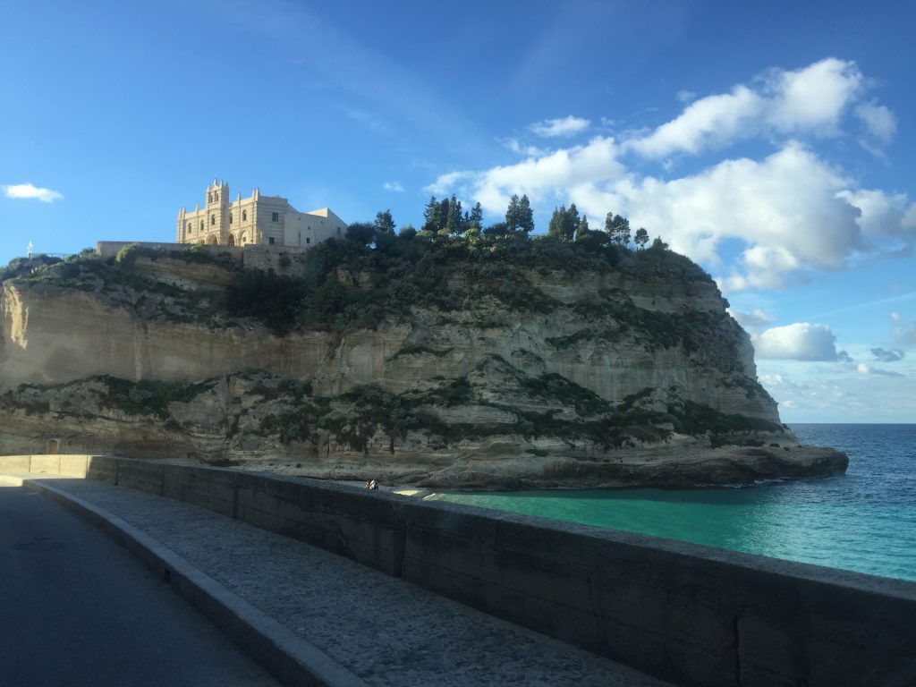 Weiter gings nach Tropea. Die Stadt liegt am kalabrischen Festland direkt gegenüber der Insel Stromboli. Die ersten Blicke auf den Stromboli waren unbeschreiblich!! Fantastisch!! Da wollte Sandra ja immer hin.. Nach ein bisserl suchen (ma scusa est un parcheggio per Camper?) haben wir einen schönen Stellplatz direkt am Meer gefunden. Moppel-Safe und dann per Pedes über eine Treppe hinauf in die Altstadt. Tropea und die ist WIRKLICH alt! Und berühmt für: Eng gebaute Häuser auf Sandstein (ok, kennen wir schon ein bisschen), alte Kirchen und… …rote Zwiebeln, die süß schmecken sollen! 😀 Wir waren schon kurz davor, eine Zwiebelsuppe kochen zu wollen ;).Wir haben auch festgestellt, dass man so schöne Bauruinen wie in Tropea nicht alle Tage zu sehen bekommt.. 😉 Sehr nett, die Stadt. Und sehr geschlossen.. Im Sommer ist hier bestimmt mehr los (man kann eben von hier auch auf die Liparischen Inseln fahren), aber im Moment ist alles dicht. Und alles sehr ruhig. Auch schön! Die Anfahrt nach Tropea war allerdings mindestens so toll: Alex ist einfach „geradeaus“ von unserem Übernachtungsplatz in den Bergen weiter gefahren, durche eine sagenhafte und sehr einsame Bergregion! Das hat uns sehr gut gefallen (wie immer, wenn es Berge gibt :D). Fantastisch! Und sogar ein wenig vereist (die hohen Gipfel hatten auch Schnee… Unglaublich, sooo weit im Süden ;)). Und ja, es war Süditalien: die Strassen (wenn man den Namen noch verwenden möchte) kurz vor der Unfahrbarkeit, lustige Märkte auf der Strasse und eine der vielen Fiat 500, die super in Schuss sind und ganz normal gefahren werden. Natürlich irgendwie gaparkt. Aber passt, dann hupt er wenigstens nicht 😀