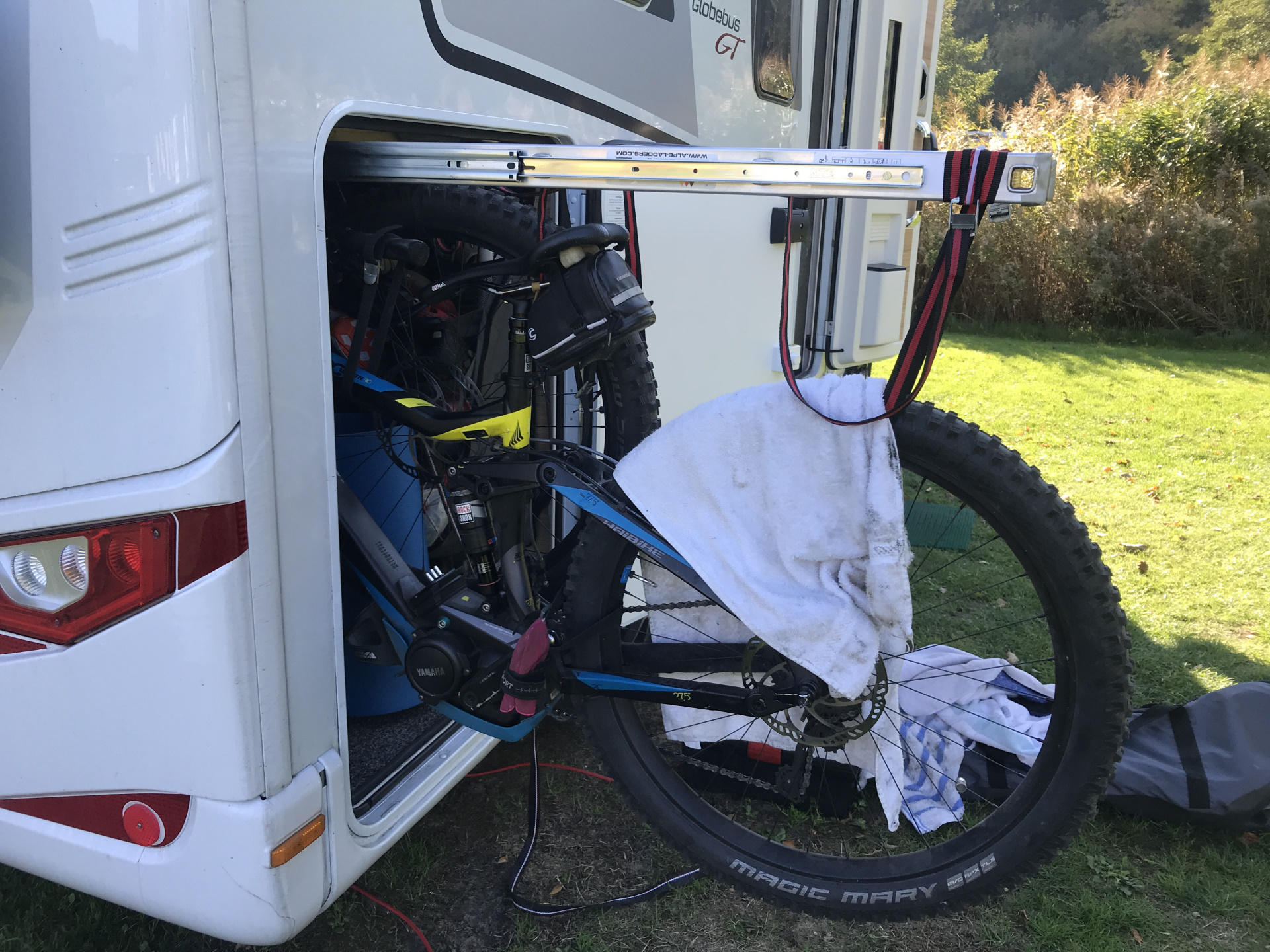 - Eine mittels Schwerlastauszügen ausziehbare Alu-Leiter zum einfachen verstauen unsere e-Bikes. Funktioniert super und wir wurden schon mehrfach nach dem „Bauplan“ gefragt. Die Bilder habe ich unten eingefügt.