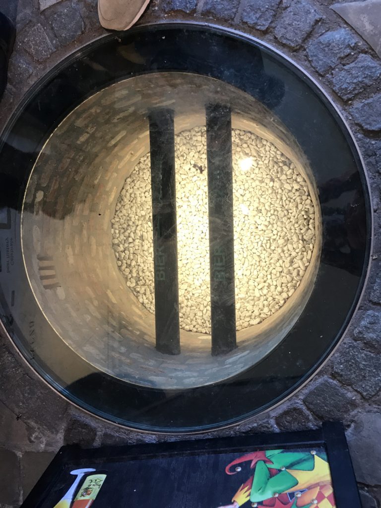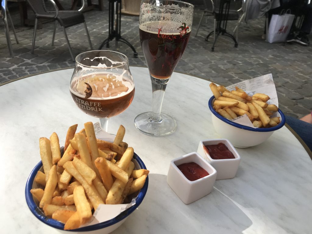 Zu allem gibt’s dann noch das leckere belgische Bier: Double 7%, Triple 9% und Trappisten 10% Bier (nach Mönchs-Tradition gebraut) :-). Wir haben 10 verschiedene Sorten eingekauft und testen bei Gelegenheit mal. Eine Brauerei haben wir auch besichtigt, die eine wirkliche Kuriosität hat: eine 3,5 km lange Bier-Pipeline! Die Brauerei ist (aus steuerlichen Gründen) noch in der Stadt, die Abfüllanlage (aus Platzgründen) außerhalb. Um das Bier zur Abfüllung zu bekommen haben die Belgier einfach eine Pipeline gebaut, 3,5 km hin und 3,5 km zurück!! Einzigartig (Bild siehe unten)!