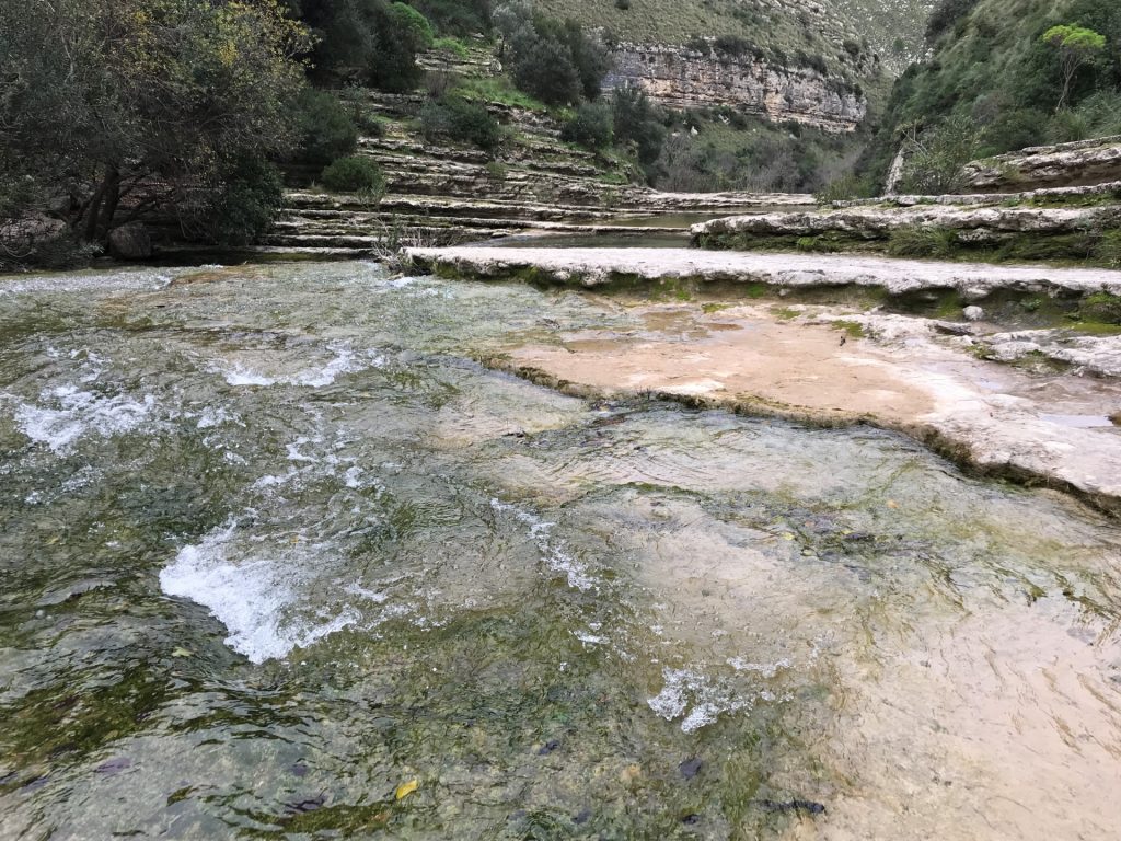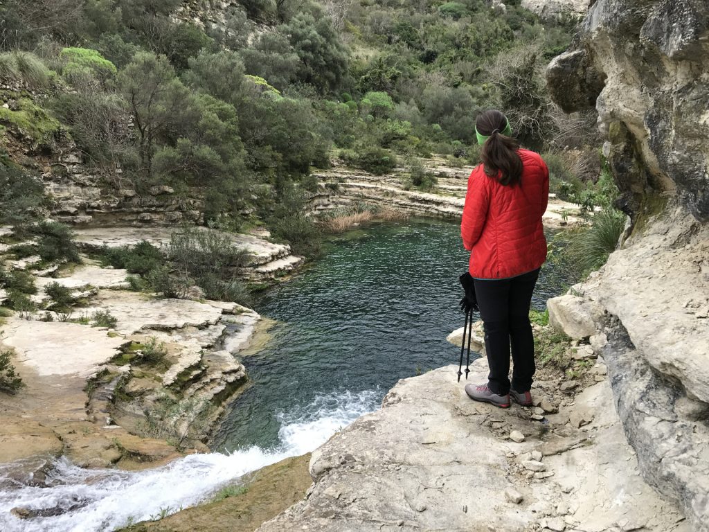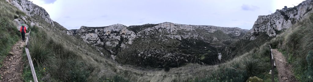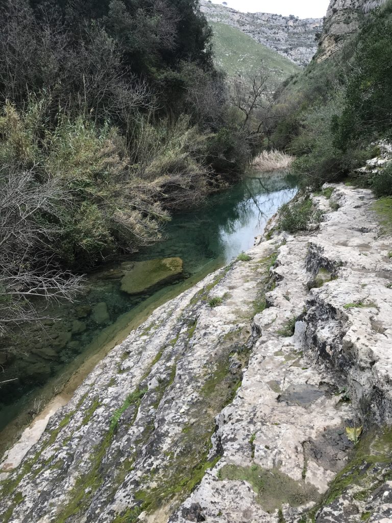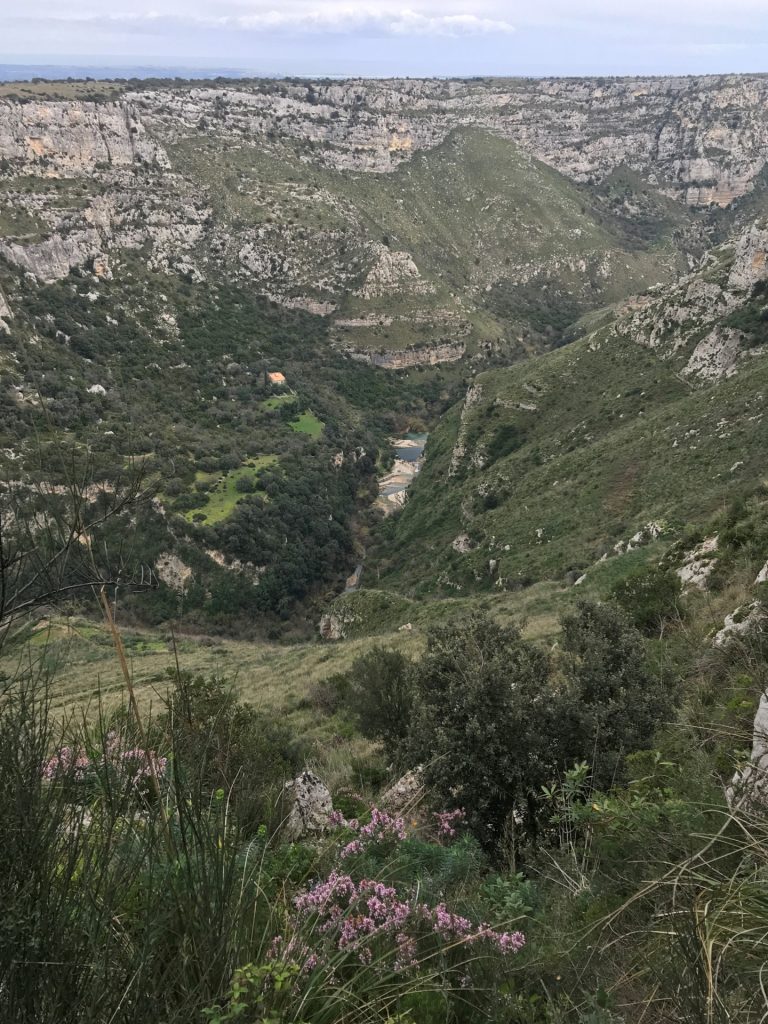 Die Cava Grande ist eine wunderschöne Schlucht im Hinterland von Syrakus. Sie war schon in der neolithischen Zeit bewohnt und mit Felsengräbern (Höhlen) ausgestattet. Sie ist eine der schönsten Wanderungen Siziliens und im Sommer entsprechend häufig besucht. Wie so oft um diese Jahreszeit waren wir aber wieder mal ganz alleine. Die erste Hürde war ein Absperrzaun, den wir überklettern mussten. Ein freundlicher Hund und sein Besitzer haben uns aber auch noch freudig ermutigt :D. Außerdem gab es eine offizielle inoffizielle Italienische Lösung: zum überklettern des abgesperrten Tors war extra ein Stuhl aufgestellt, damit es bequemer geht! 😀 Der Weg hinunter ist seit einigen Jahren offiziell wegen Steinschlaggefahr gesperrt… Wie so oft ist die einfache Reaktion hier, gleich das ganze Ding zu sperren, statt am Weg zu arbeiten. Hier jedoch nicht, man hätte einfach auf einem Weg auf der anderen Schluchtseite(!!) gehen sollen. Unklar (wie so oft) war aber, ob dieser auch ganz hinunter geführt hätte. Der gesperrte Weg war auf jeden Fall toll. Schon von oben hat man die Stromschnellen und die Becken (in denen im Sommer wohl auch gebadet wird) gesehen. Auf dem Weg haben wir ein wunderschönes Pflänzchen, einen so genannten Krummstab, entdeckt. Das Tolle an der Wanderung ist, dass man zuerst in die Cava Grande absteigt (ähnlich wie im Grand Canyon), um danach vierhundert Höhenmeter wieder aufzusteigen. Eine superschöne und sehr lohnenswerte Wanderung!