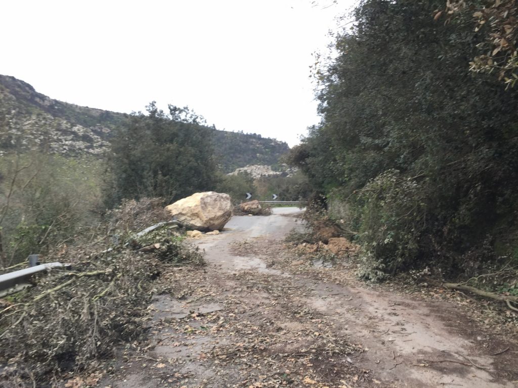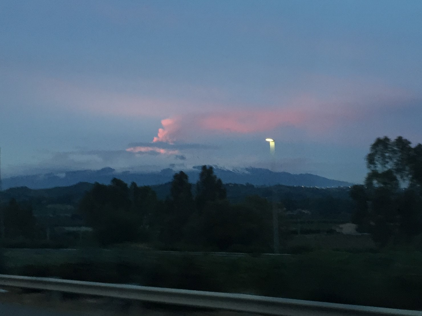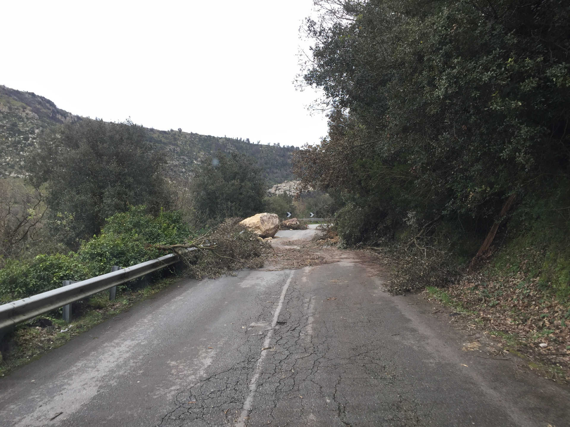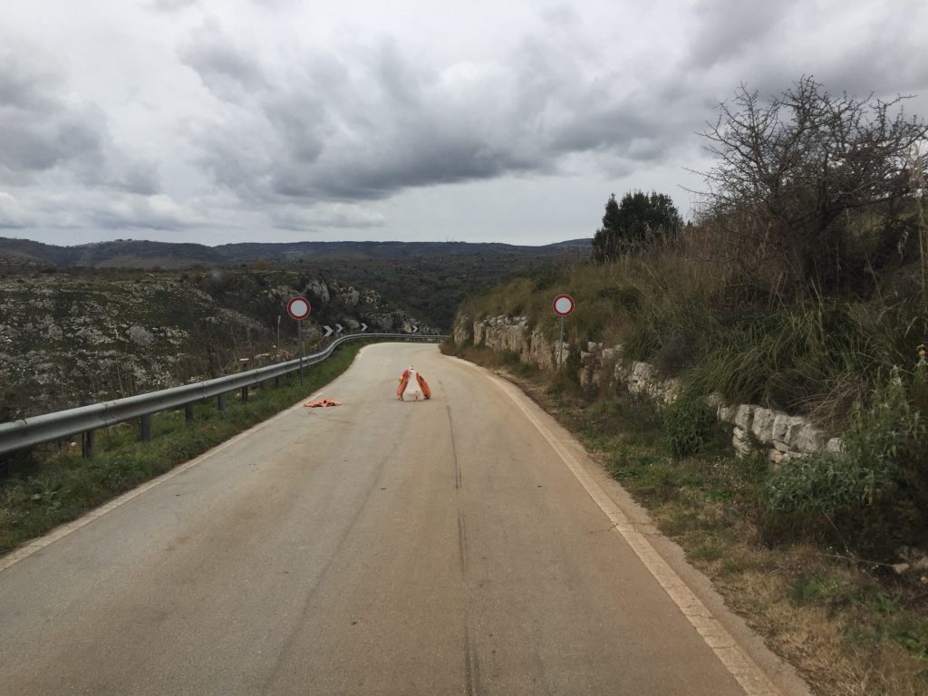Spannend wurde es dann auf dem Weiterweg Richtung Taormina. Wir fahren ja immer mit unserem Navigon (iOS App siehe „Nützliches„) und haben damit schon viel Spaß gehabt. Meistens sind die Strecken, die ich in der App plane, super. Wenn immer es geht verzichten wir auf Mautstraßen und Autobahnen, manchmal sind die Straßen aber auch für unseren „kleinen“ Moppel einfach zu eng oder die zu Brücken zu tief oder es kommen andere Widrigkeiten, wie z.B. eine gesperrte Straße. Wie auf dieser Etappe. Los gings mit einem (in Sizilien üblichen) gesperrt Schild. Die Poller waren so gedreht, dass man problemlos durchfahren kann, also weiter. Dann die Ernüchterung – ein RISIGER Felsbrocken mitten auf der Straße! Dank Sandras Hilfe sind wir noch recht gut daran vorbei gekommen, aber nach der nächsten Serpentine war dann der Rest des Felssturzes auf der Fahrbahn. Und da kamen wir dann doch etwas ins Schwitzen. Zu guter Letzt gings dann doch zentimeterweise und dank Sandras Navigationskünsten (Spitzname „wuseliges Eichhörnchen“ rennt: dauernd um den Moppel herum, um zu sehen, ob es auch an allen Ecken passt) durch den Felssturz. Lustigerweise war auf der anderen Einmündung der Straße dann ein Absperrgitter (das aber wie immer in Italien einfach zu Seite geschoben wurde).